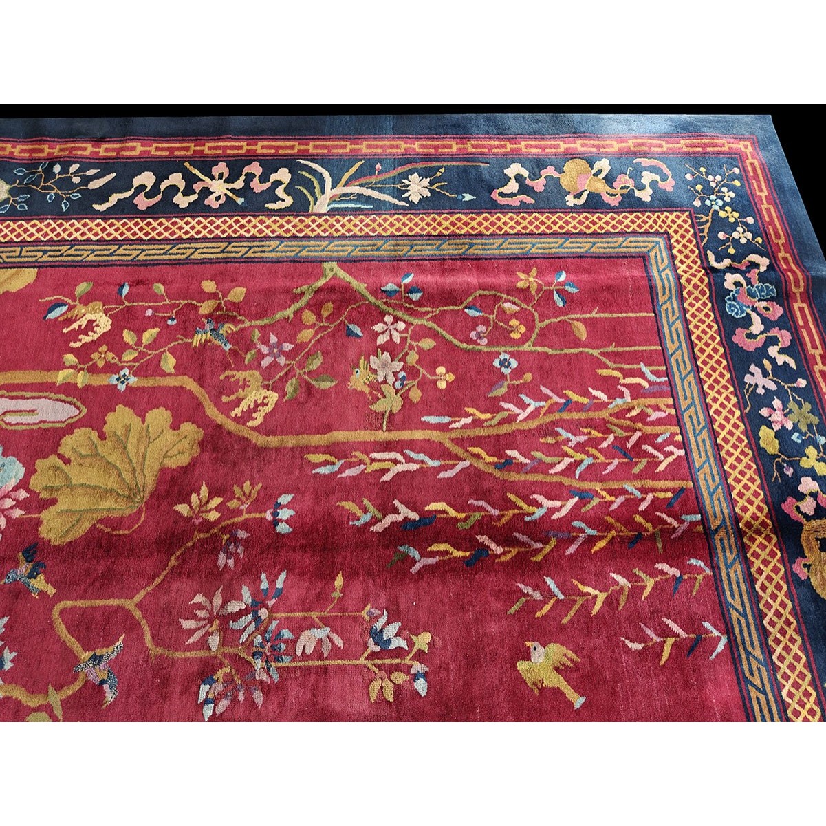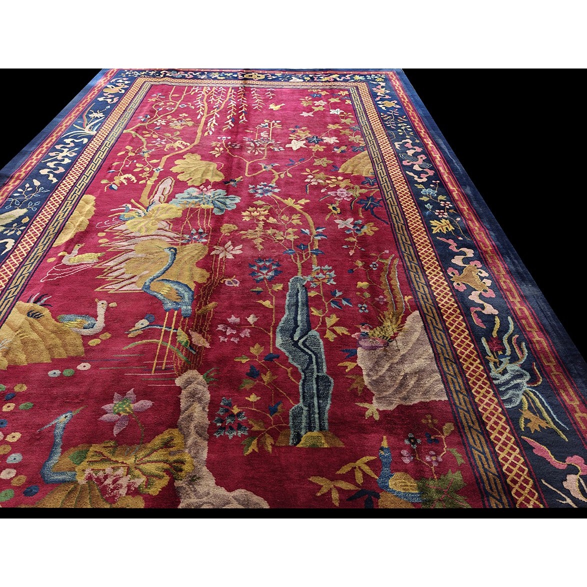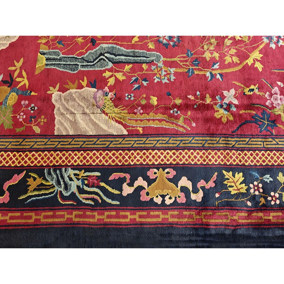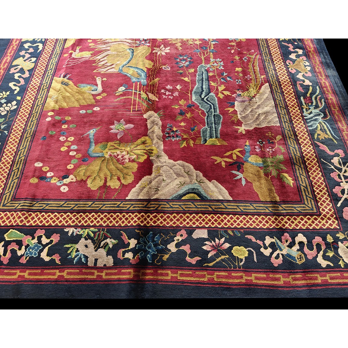 DescriptionChineseCarpets made in China proper. See entries Ningshia, Peking, Art Deco. Chinese - Art DecoAs the name implies, pieces woven between the wars for the Western market by mostly American owned firms especially Nichols and Fette, in thick heavy weaves using strong colors, asymmetric patterns and downplaying the Chinese-ness of the carpet. Nichols rugs are more strong toned than the pastel Fette. Most were woven in the coastal port city of Tientsin. Other lesser known workshops were also active. Some pieces are ultra-geometric and haute-Deco moderne in character: these are very rare. More frequent are pieces with bits of Chinese ornament: vases or other precious objects, paeonies, vines, fences, etc. Most common is the 9 x 12 size, in colors never found in mainstream Chinese rugs: backgrounds in black, mauve, purple, hot pink, orange, olive, employing the best synthetic chrome dyes of the period. Prices are still reasonable and carpets in top condition are available. | |