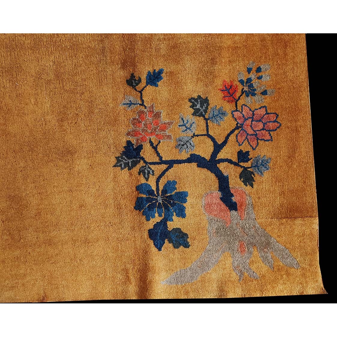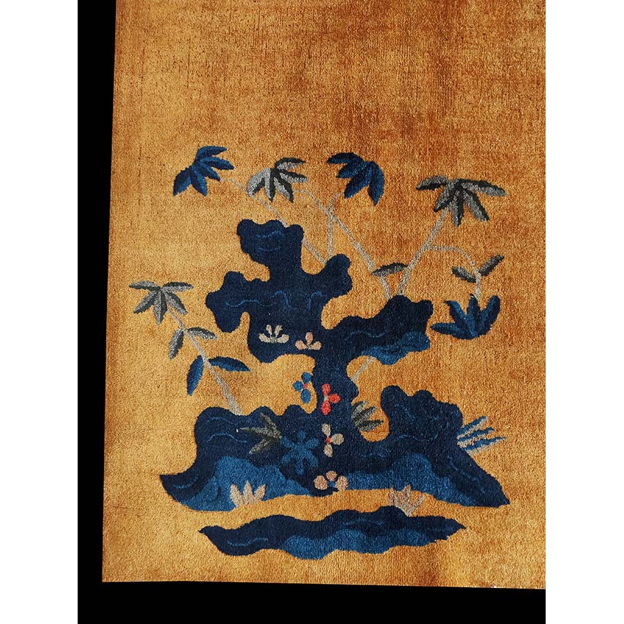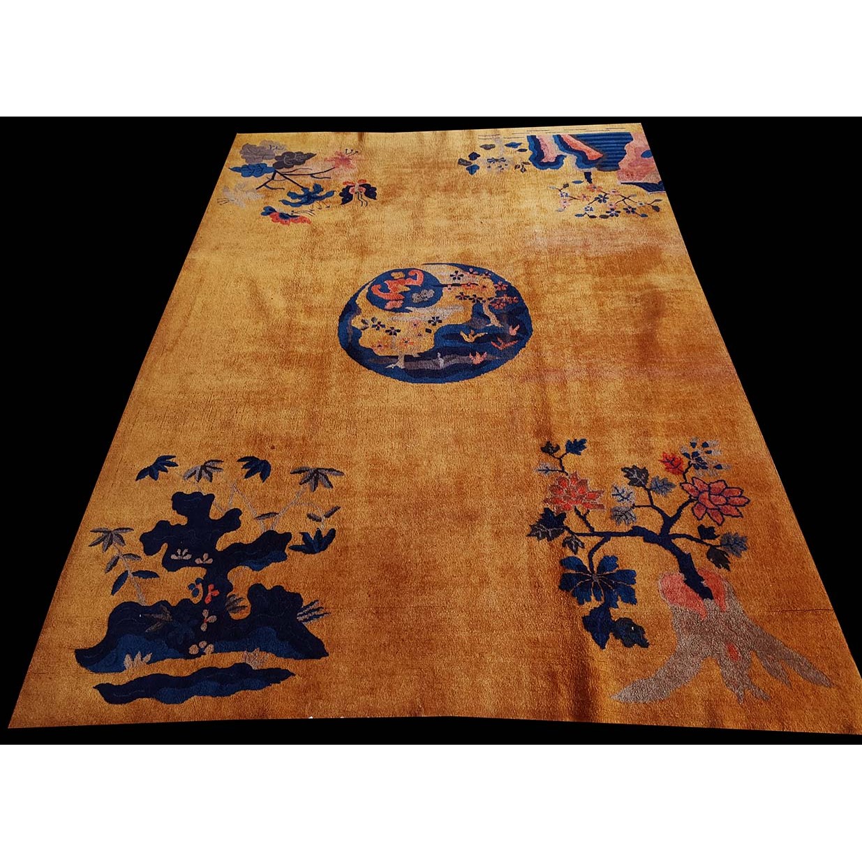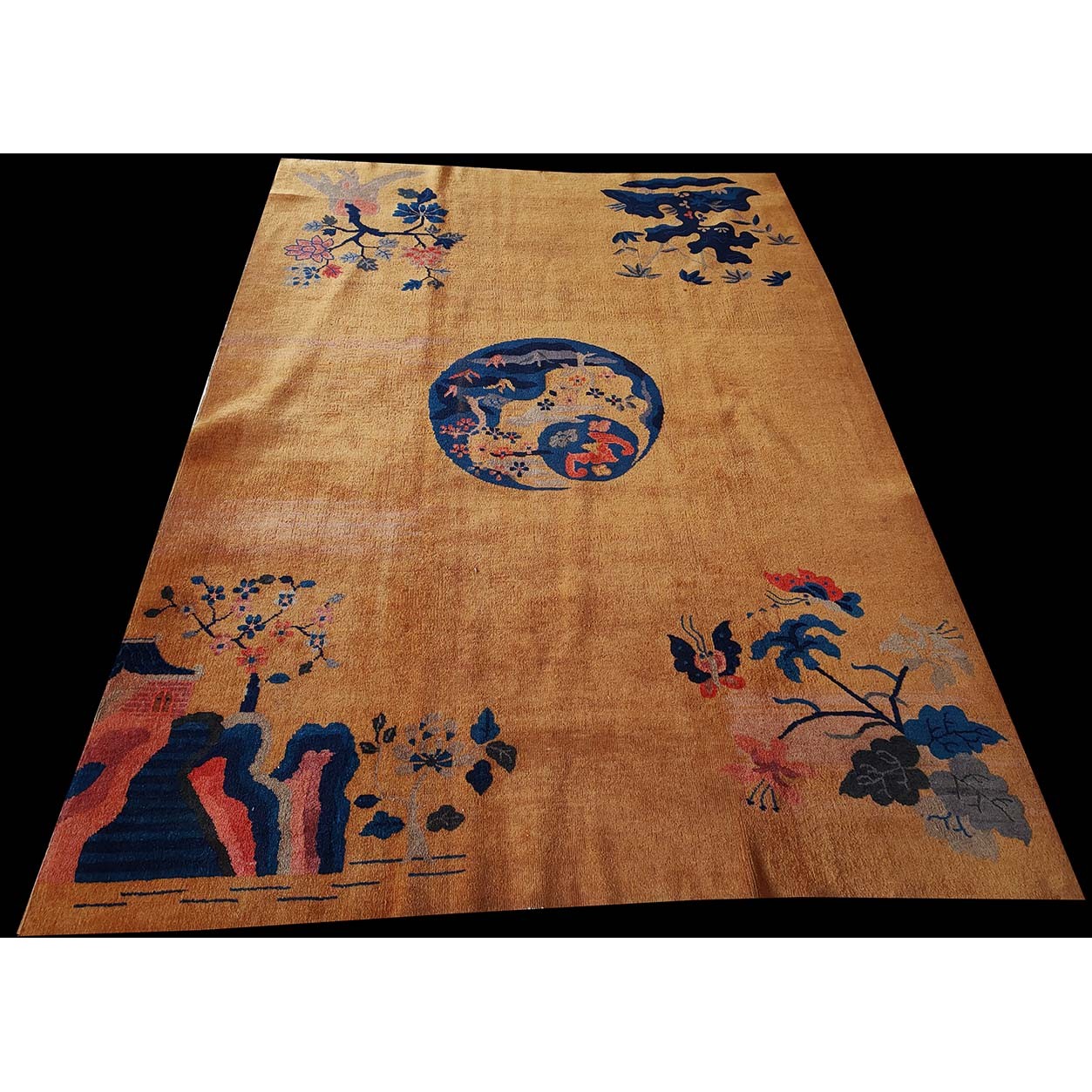 DescriptionChineseCarpets made in China proper. See entries Ningshia, Peking, Art Deco. Chinese - Art DecoAs the name implies, pieces woven between the wars for the Western market by mostly American owned firms especially Nichols and Fette, in thick heavy weaves using strong colors, asymmetric patterns and downplaying the Chinese-ness of the carpet. Nichols rugs are more strong toned than the pastel Fette. Most were woven in the coastal port city of Tientsin. Other lesser known workshops were also active. Some pieces are ultra-geometric and haute-Deco moderne in character: these are very rare. More frequent are pieces with bits of Chinese ornament: vases or other precious objects, paeonies, vines, fences, etc. Most common is the 9 x 12 size, in colors never found in mainstream Chinese rugs: backgrounds in black, mauve, purple, hot pink, orange, olive, employing the best synthetic chrome dyes of the period. Prices are still reasonable and carpets in top condition are available. | |