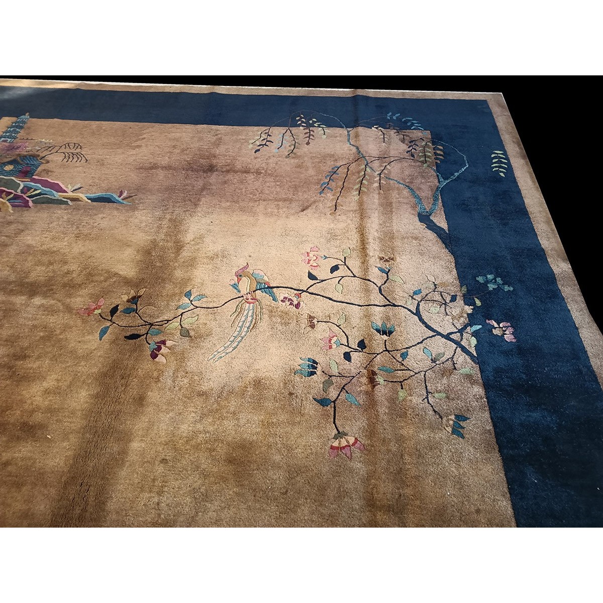 DescriptionChineseCarpets made in China proper. See entries Ningshia, Peking, Art Deco. Chinese - Art DecoAs the name implies, pieces woven between the wars for the Western market by mostly American owned firms especially Nichols and Fette, in thick heavy weaves using strong colors, asymmetric patterns and downplaying the Chinese-ness of the carpet. Nichols rugs are more strong toned than the pastel Fette. Most were woven in the coastal port city of Tientsin. Other lesser known workshops were also active. Some pieces are ultra-geometric and haute-Deco moderne in character: these are very rare. More frequent are pieces with bits of Chinese ornament: vases or other precious objects, paeonies, vines, fences, etc. Most common is the 9 x 12 size, in colors never found in mainstream Chinese rugs: backgrounds in black, mauve, purple, hot pink, orange, olive, employing the best synthetic chrome dyes of the period. Prices are still reasonable and carpets in top condition are available. | |