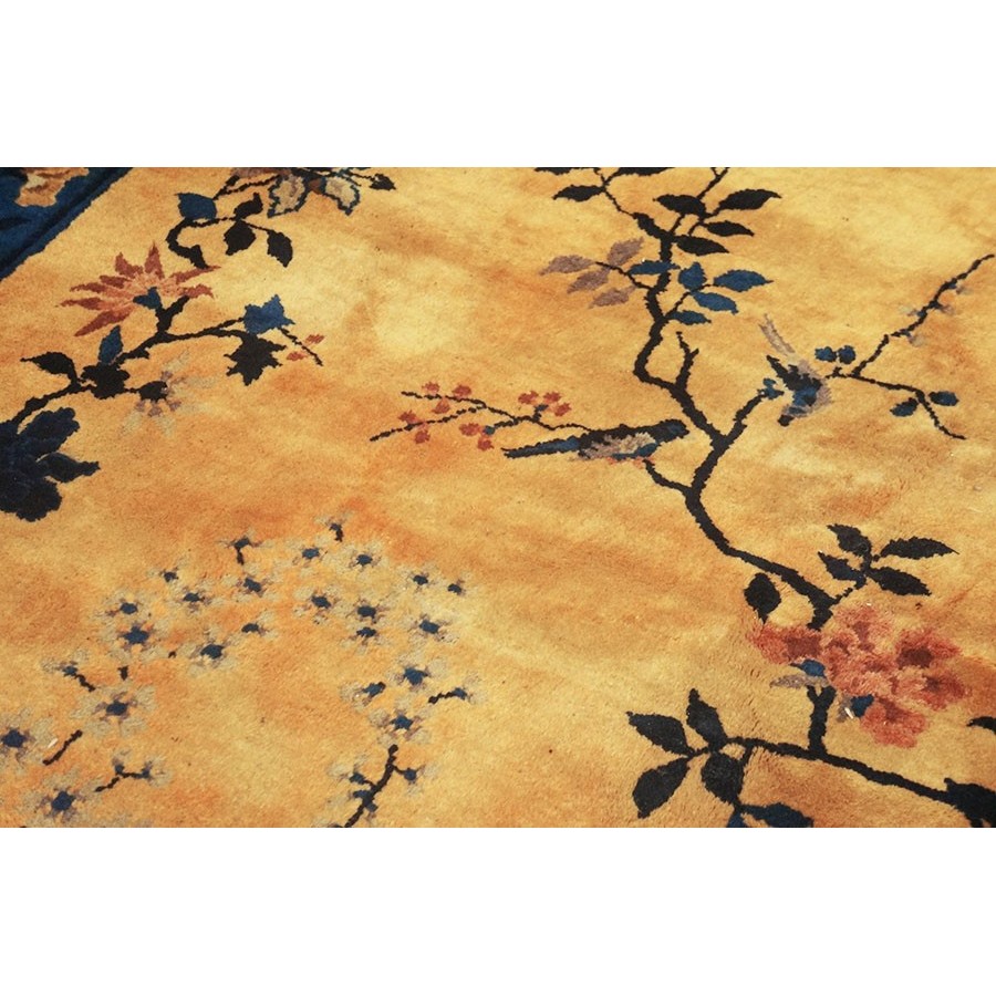 DescriptionChineseCarpets made in China proper. See entries Ningshia, Peking, Art Deco. Chinese - Art DecoAs the name implies, pieces woven between the wars for the Western market by mostly American owned firms especially Nichols and Fette, in thick heavy weaves using strong colors, asymmetric patterns and downplaying the Chinese-ness of the carpet. Nichols rugs are more strong toned than the pastel Fette. Most were woven in the coastal port city of Tientsin. Other lesser known workshops were also active. Some pieces are ultra-geometric and haute-Deco moderne in character: these are very rare. More frequent are pieces with bits of Chinese ornament: vases or other precious objects, paeonies, vines, fences, etc. Most common is the 9 x 12 size, in colors never found in mainstream Chinese rugs: backgrounds in black, mauve, purple, hot pink, orange, olive, employing the best synthetic chrome dyes of the period. Prices are still reasonable and carpets in top condition are available. | |