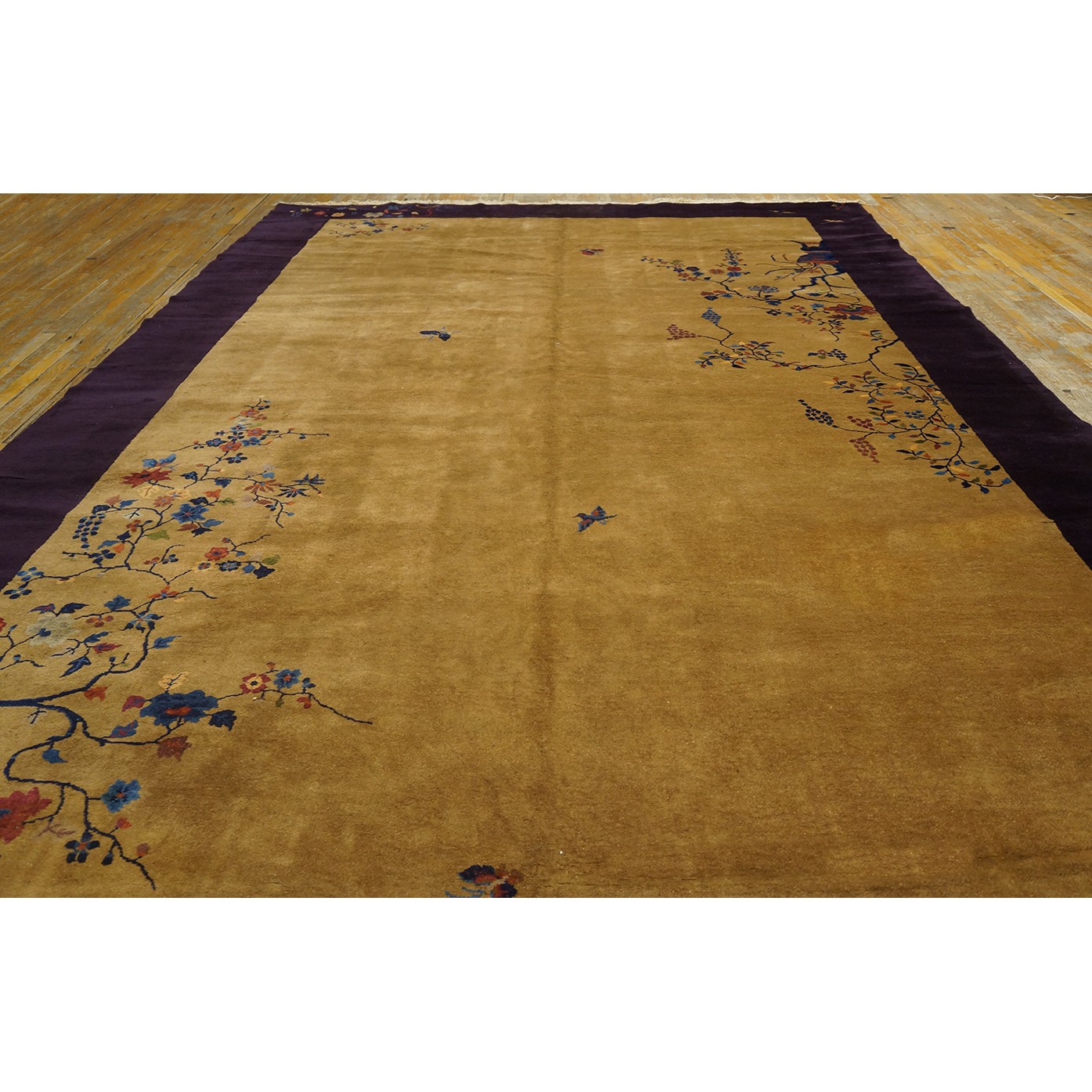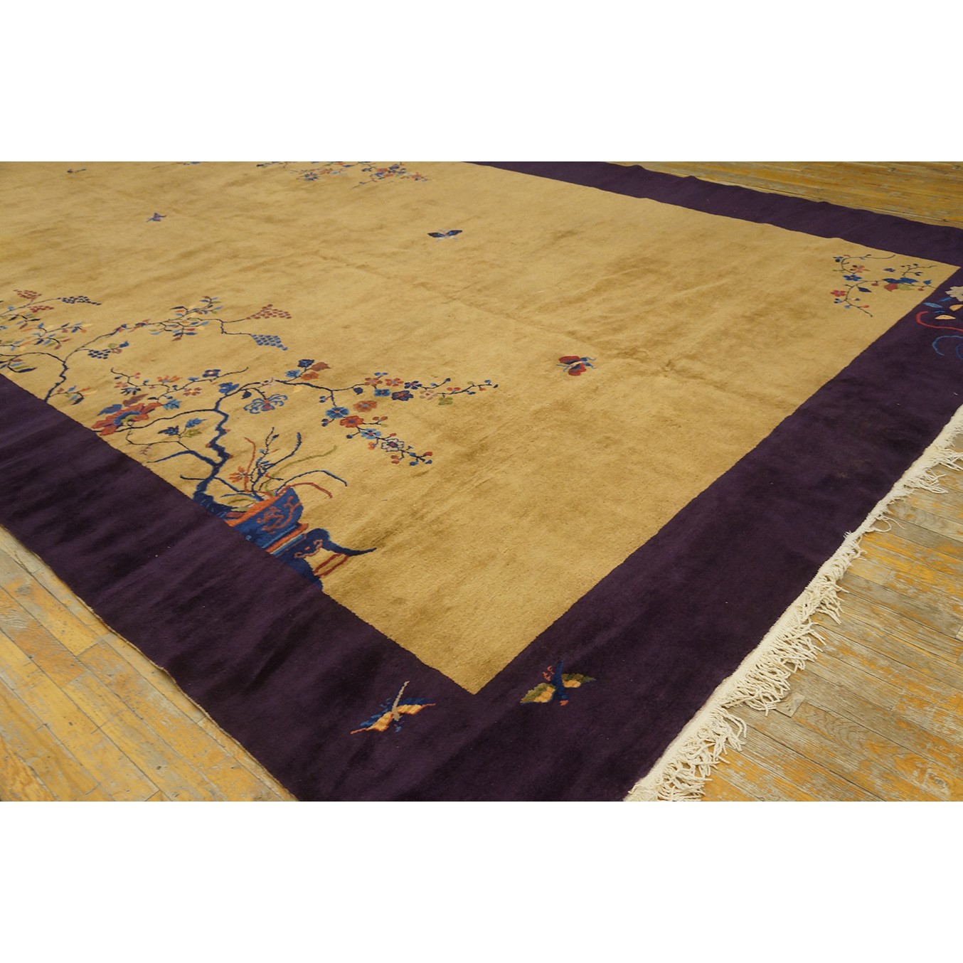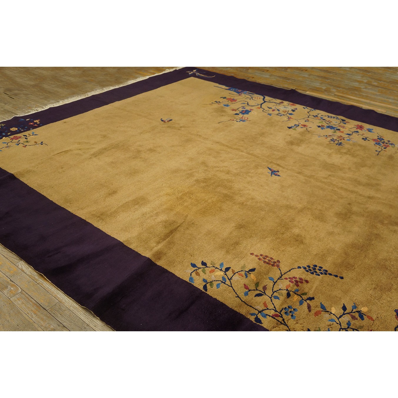 DescriptionChineseCarpets made in China proper. See entries Ningshia, Peking, Art Deco. Chinese - Art DecoAs the name implies, pieces woven between the wars for the Western market by mostly American owned firms especially Nichols and Fette, in thick heavy weaves using strong colors, asymmetric patterns and downplaying the Chinese-ness of the carpet. Nichols rugs are more strong toned than the pastel Fette. Most were woven in the coastal port city of Tientsin. Other lesser known workshops were also active. Some pieces are ultra-geometric and haute-Deco moderne in character: these are very rare. More frequent are pieces with bits of Chinese ornament: vases or other precious objects, paeonies, vines, fences, etc. Most common is the 9 x 12 size, in colors never found in mainstream Chinese rugs: backgrounds in black, mauve, purple, hot pink, orange, olive, employing the best synthetic chrome dyes of the period. Prices are still reasonable and carpets in top condition are available. | |