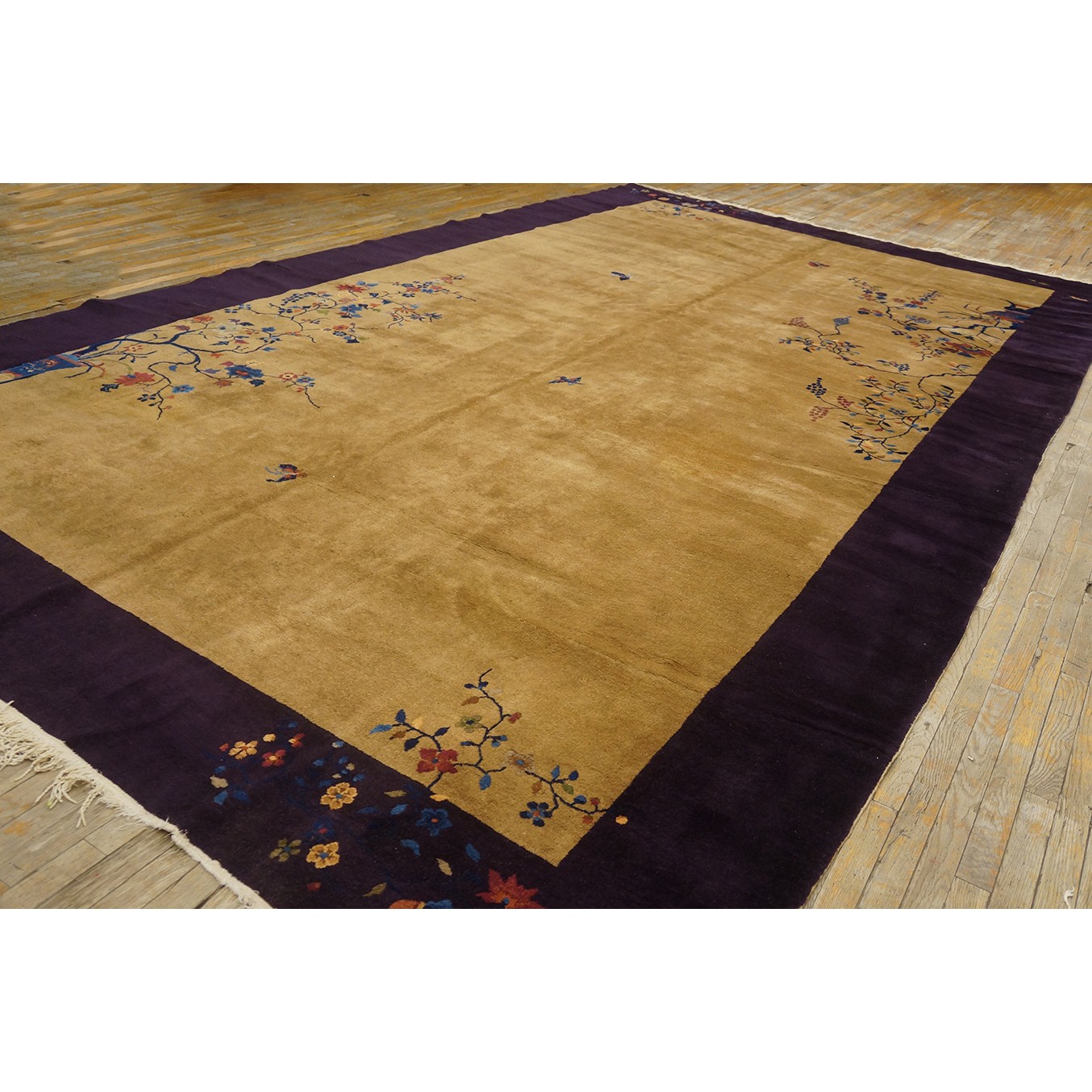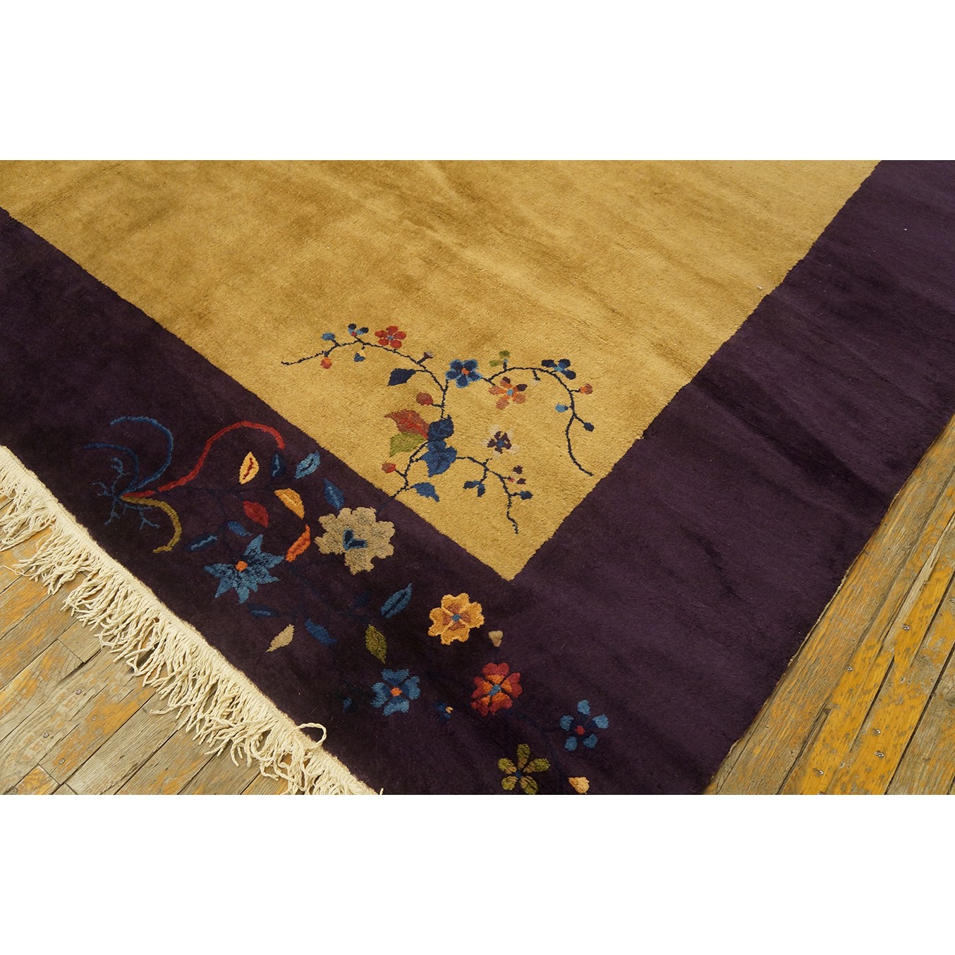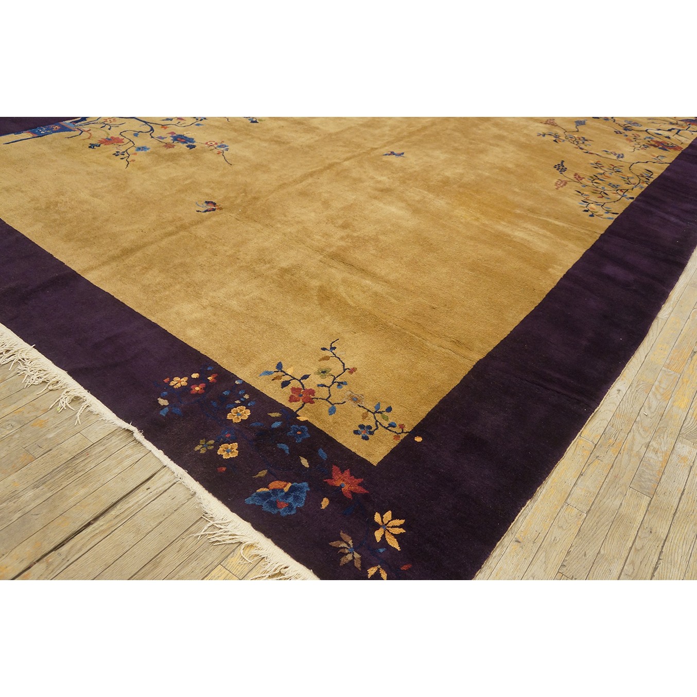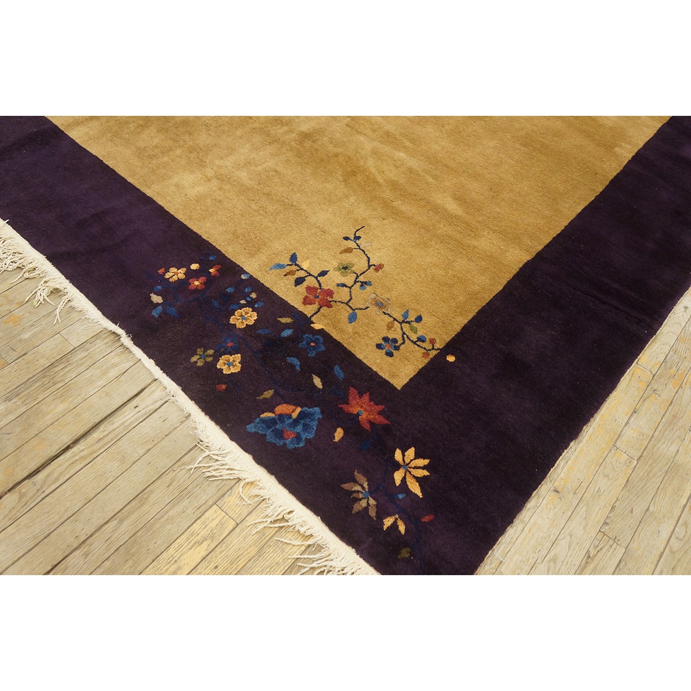 DescriptionChineseCarpets made in China proper. See entries Ningshia, Peking, Art Deco. Chinese - Art DecoAs the name implies, pieces woven between the wars for the Western market by mostly American owned firms especially Nichols and Fette, in thick heavy weaves using strong colors, asymmetric patterns and downplaying the Chinese-ness of the carpet. Nichols rugs are more strong toned than the pastel Fette. Most were woven in the coastal port city of Tientsin. Other lesser known workshops were also active. Some pieces are ultra-geometric and haute-Deco moderne in character: these are very rare. More frequent are pieces with bits of Chinese ornament: vases or other precious objects, paeonies, vines, fences, etc. Most common is the 9 x 12 size, in colors never found in mainstream Chinese rugs: backgrounds in black, mauve, purple, hot pink, orange, olive, employing the best synthetic chrome dyes of the period. Prices are still reasonable and carpets in top condition are available. | |