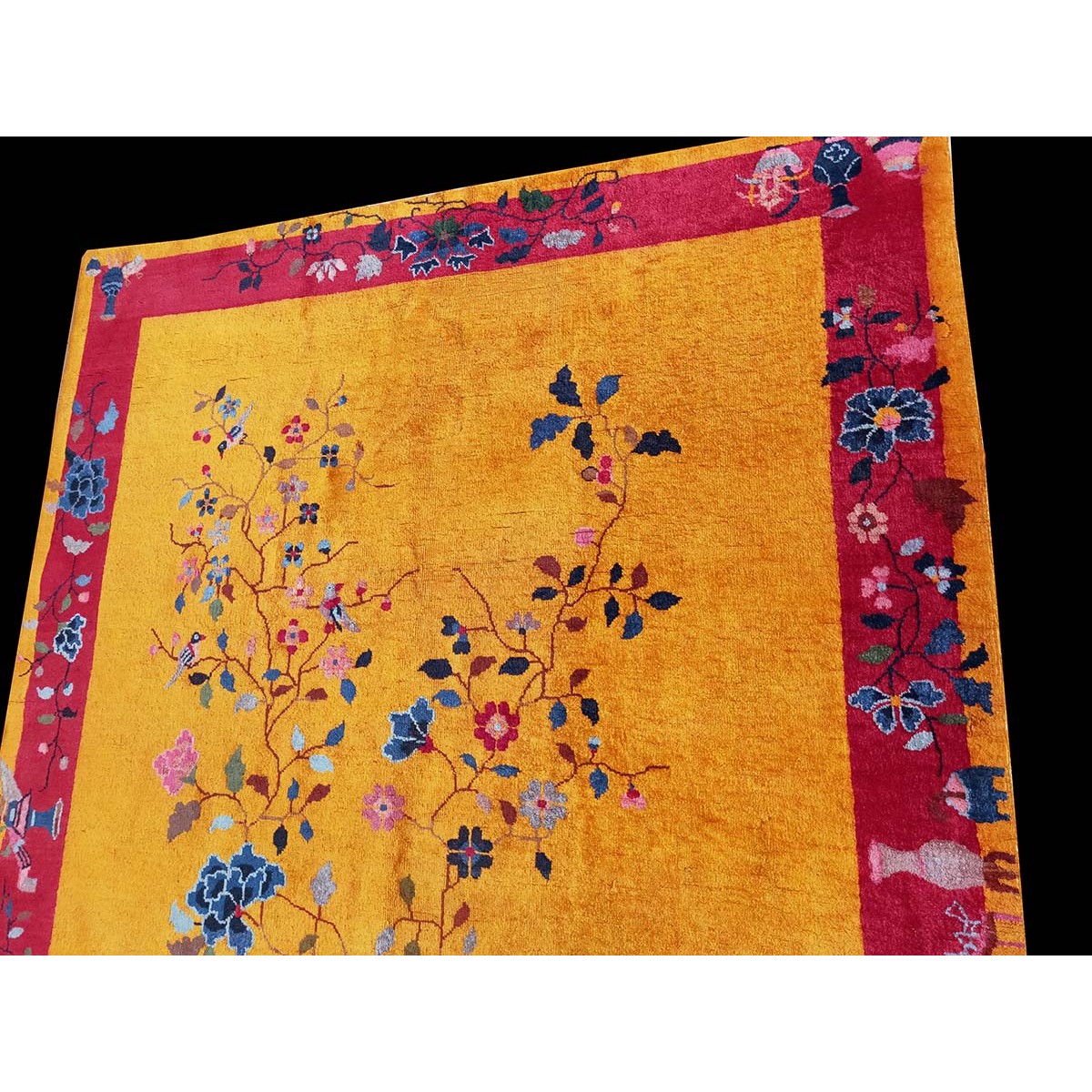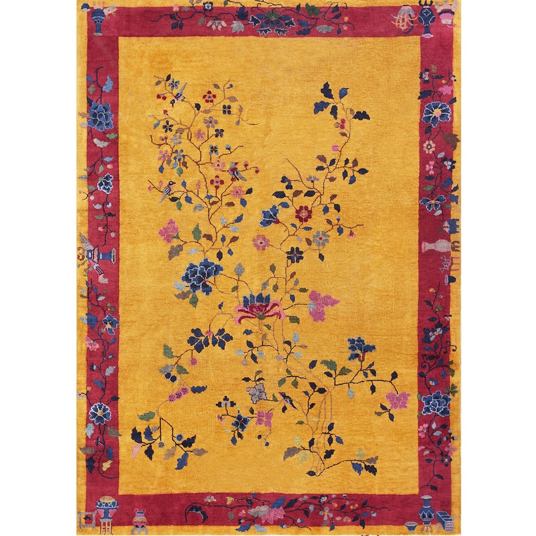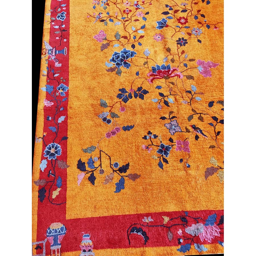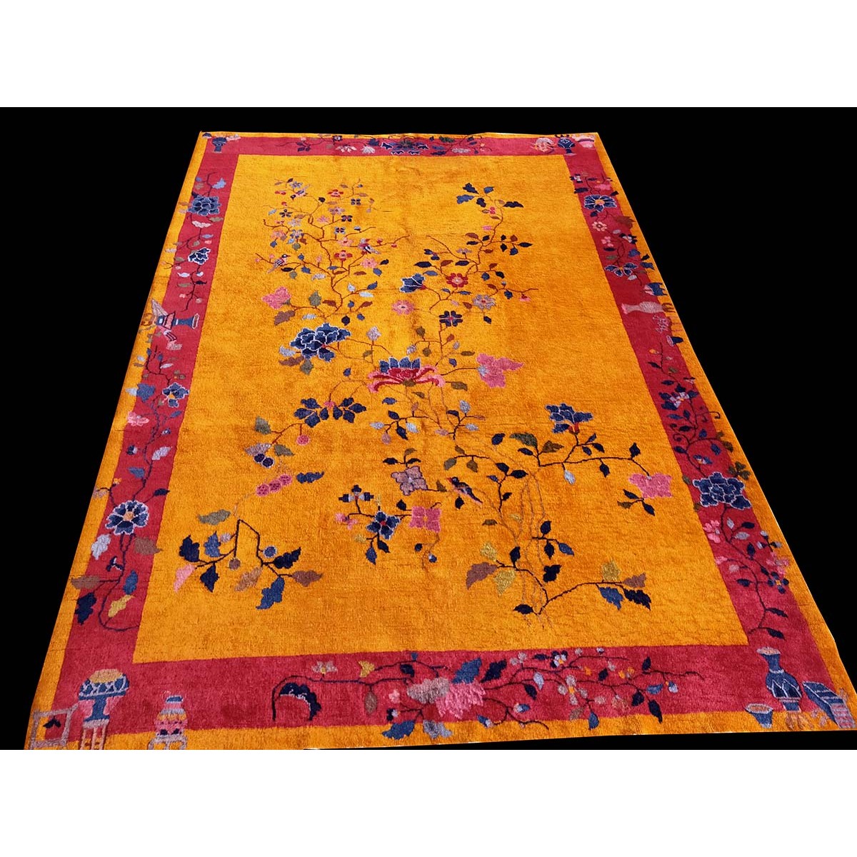 DescriptionChineseCarpets made in China proper. See entries Ningshia, Peking, Art Deco. Chinese - Art DecoAs the name implies, pieces woven between the wars for the Western market by mostly American owned firms especially Nichols and Fette, in thick heavy weaves using strong colors, asymmetric patterns and downplaying the Chinese-ness of the carpet. Nichols rugs are more strong toned than the pastel Fette. Most were woven in the coastal port city of Tientsin. Other lesser known workshops were also active. Some pieces are ultra-geometric and haute-Deco moderne in character: these are very rare. More frequent are pieces with bits of Chinese ornament: vases or other precious objects, paeonies, vines, fences, etc. Most common is the 9 x 12 size, in colors never found in mainstream Chinese rugs: backgrounds in black, mauve, purple, hot pink, orange, olive, employing the best synthetic chrome dyes of the period. Prices are still reasonable and carpets in top condition are available. | |