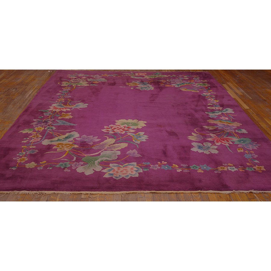 DescriptionChineseCarpets made in China proper. See entries Ningshia, Peking, Art Deco. Chinese - Art DecoAs the name implies, pieces woven between the wars for the Western market by mostly American owned firms especially Nichols and Fette, in thick heavy weaves using strong colors, asymmetric patterns and downplaying the Chinese-ness of the carpet. Nichols rugs are more strong toned than the pastel Fette. Most were woven in the coastal port city of Tientsin. Other lesser known workshops were also active. Some pieces are ultra-geometric and haute-Deco moderne in character: these are very rare. More frequent are pieces with bits of Chinese ornament: vases or other precious objects, paeonies, vines, fences, etc. Most common is the 9 x 12 size, in colors never found in mainstream Chinese rugs: backgrounds in black, mauve, purple, hot pink, orange, olive, employing the best synthetic chrome dyes of the period. Prices are still reasonable and carpets in top condition are available. | |