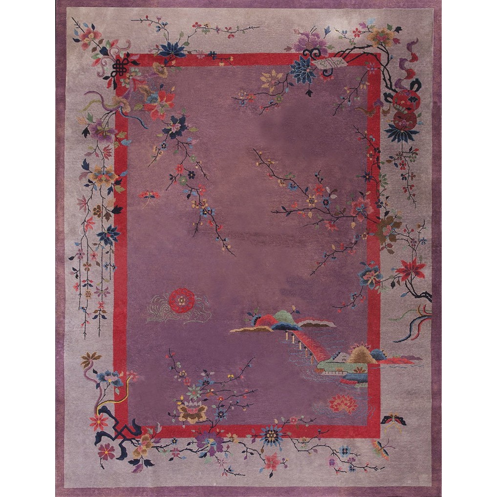 DescriptionChineseCarpets made in China proper. See entries Ningshia, Peking, Art Deco. Chinese - Art DecoAs the name implies, pieces woven between the wars for the Western market by mostly American owned firms especially Nichols and Fette, in thick heavy weaves using strong colors, asymmetric patterns and downplaying the Chinese-ness of the carpet. Nichols rugs are more strong toned than the pastel Fette. Most were woven in the coastal port city of Tientsin. Other lesser known workshops were also active. Some pieces are ultra-geometric and haute-Deco moderne in character: these are very rare. More frequent are pieces with bits of Chinese ornament: vases or other precious objects, paeonies, vines, fences, etc. Most common is the 9 x 12 size, in colors never found in mainstream Chinese rugs: backgrounds in black, mauve, purple, hot pink, orange, olive, employing the best synthetic chrome dyes of the period. Prices are still reasonable and carpets in top condition are available. | |