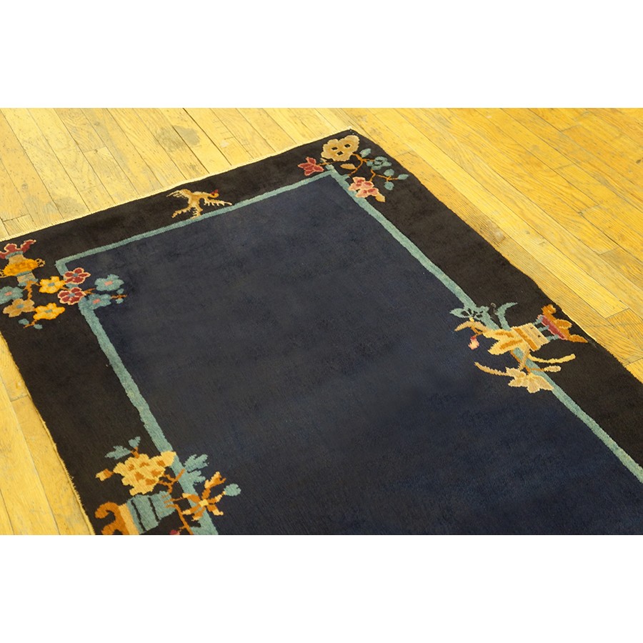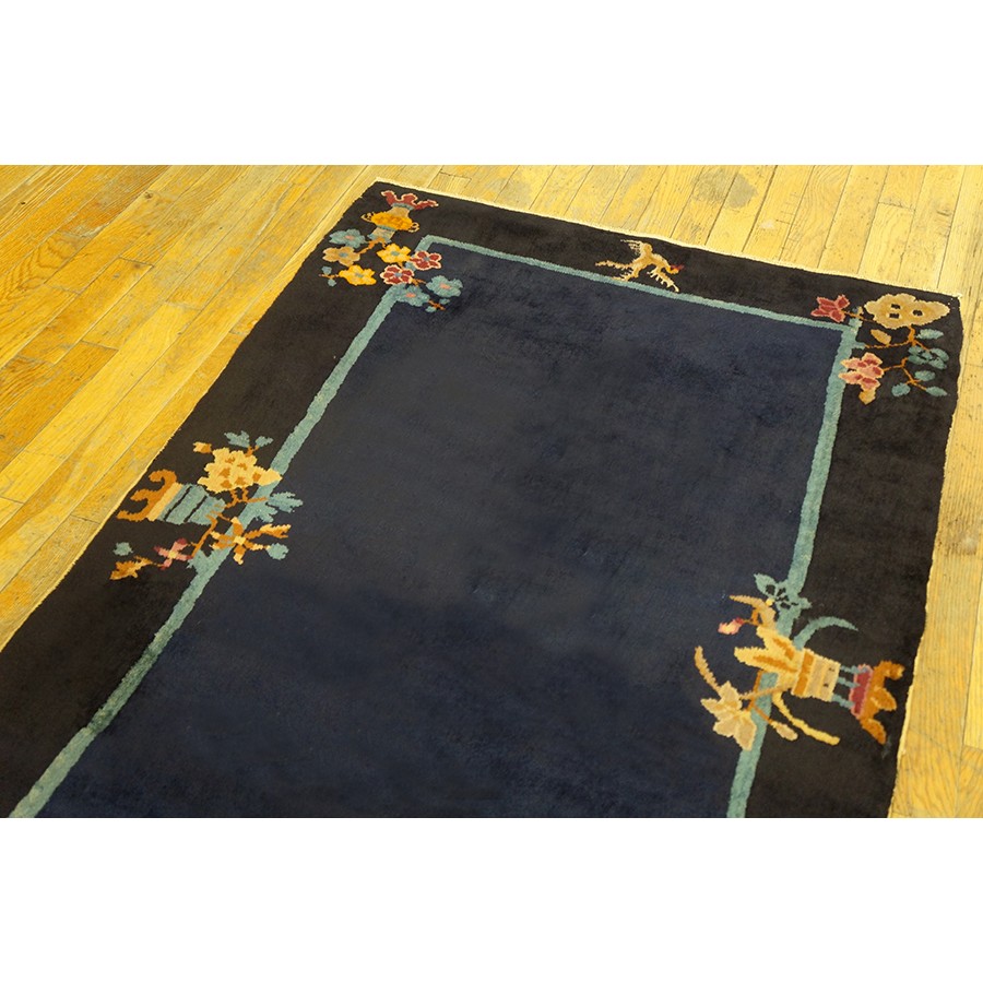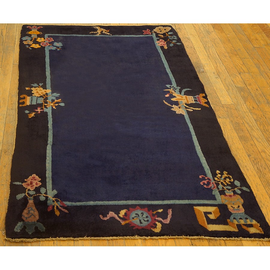 DescriptionChineseCarpets made in China proper. See entries Ningshia, Peking, Art Deco. Chinese - Art DecoAs the name implies, pieces woven between the wars for the Western market by mostly American owned firms especially Nichols and Fette, in thick heavy weaves using strong colors, asymmetric patterns and downplaying the Chinese-ness of the carpet. Nichols rugs are more strong toned than the pastel Fette. Most were woven in the coastal port city of Tientsin. Other lesser known workshops were also active. Some pieces are ultra-geometric and haute-Deco moderne in character: these are very rare. More frequent are pieces with bits of Chinese ornament: vases or other precious objects, paeonies, vines, fences, etc. Most common is the 9 x 12 size, in colors never found in mainstream Chinese rugs: backgrounds in black, mauve, purple, hot pink, orange, olive, employing the best synthetic chrome dyes of the period. Prices are still reasonable and carpets in top condition are available. | |