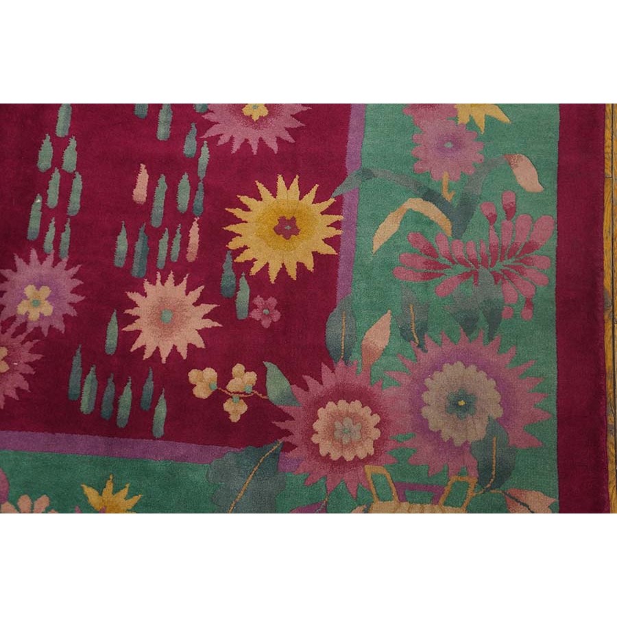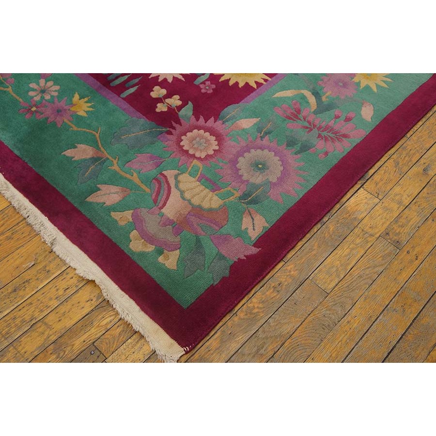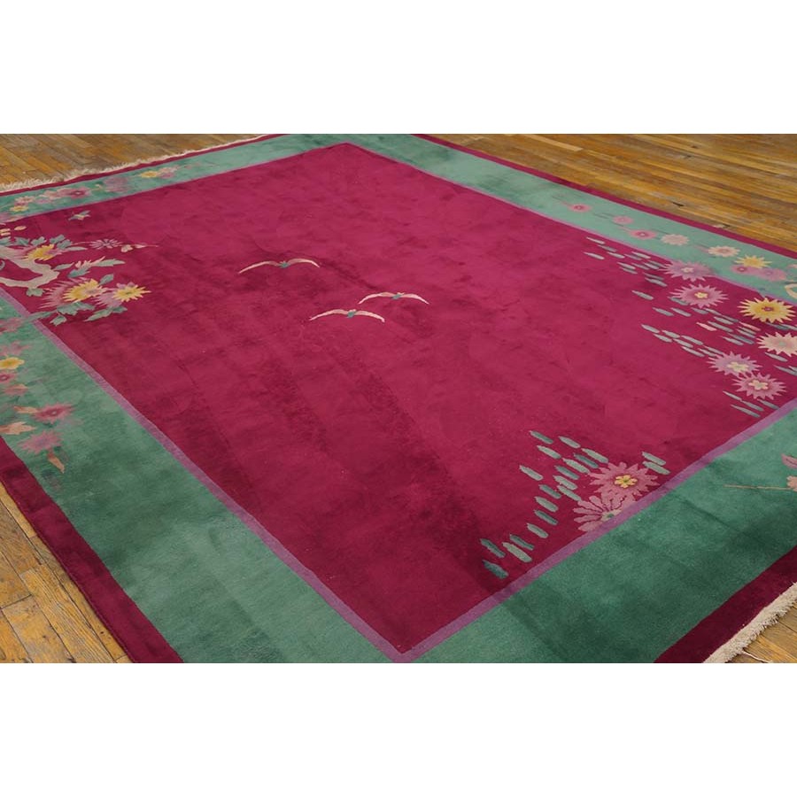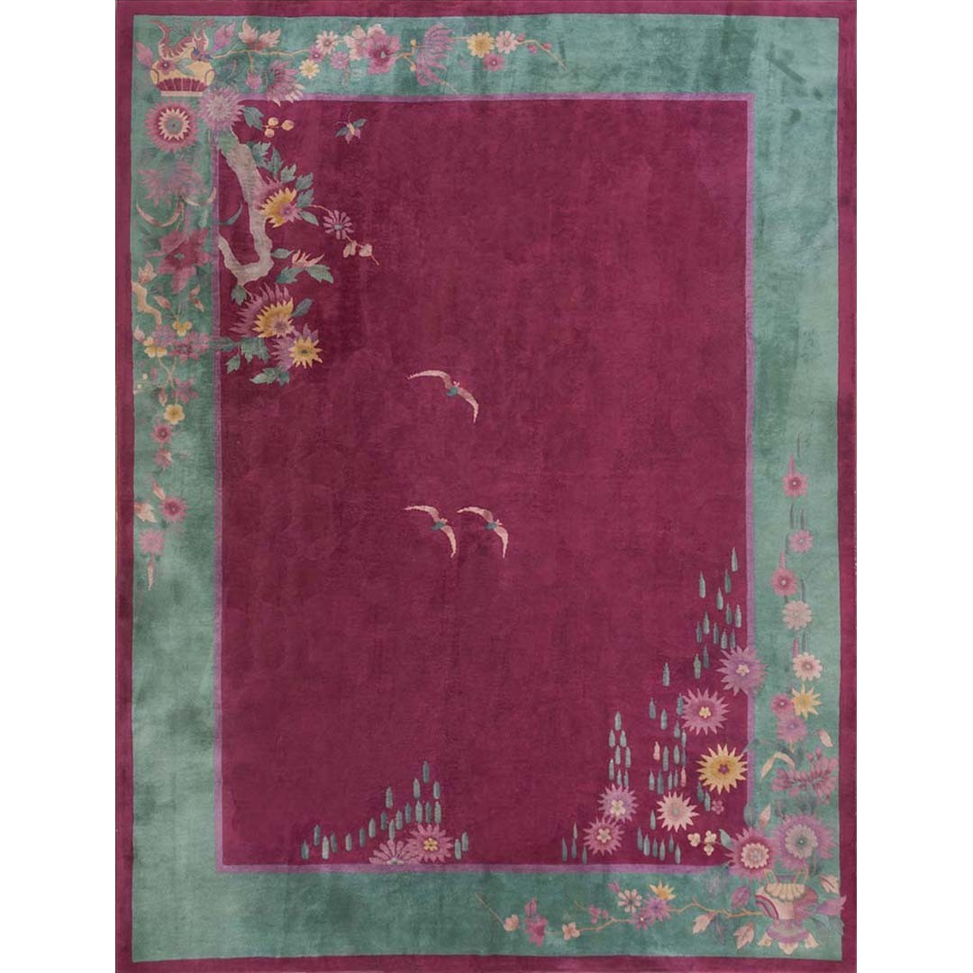 DescriptionChineseCarpets made in China proper. See entries Ningshia, Peking, Art Deco. Chinese - Art DecoAs the name implies, pieces woven between the wars for the Western market by mostly American owned firms especially Nichols and Fette, in thick heavy weaves using strong colors, asymmetric patterns and downplaying the Chinese-ness of the carpet. Nichols rugs are more strong toned than the pastel Fette. Most were woven in the coastal port city of Tientsin. Other lesser known workshops were also active. Some pieces are ultra-geometric and haute-Deco moderne in character: these are very rare. More frequent are pieces with bits of Chinese ornament: vases or other precious objects, paeonies, vines, fences, etc. Most common is the 9 x 12 size, in colors never found in mainstream Chinese rugs: backgrounds in black, mauve, purple, hot pink, orange, olive, employing the best synthetic chrome dyes of the period. Prices are still reasonable and carpets in top condition are available. | |