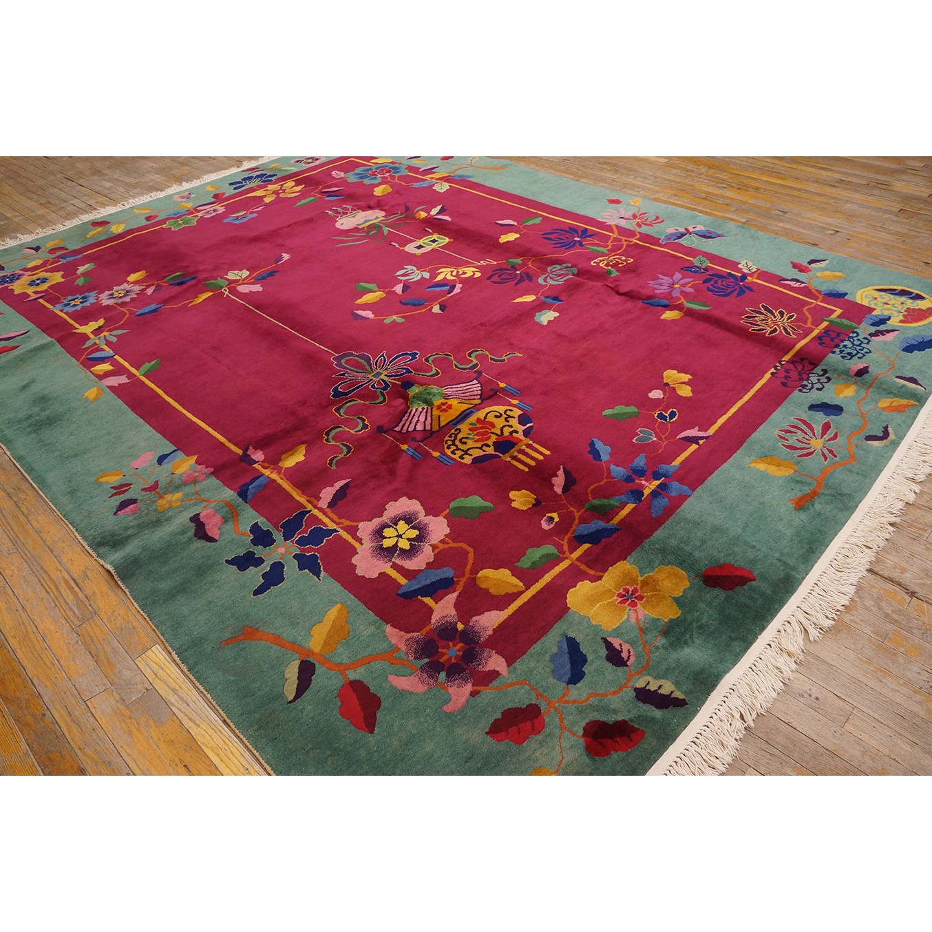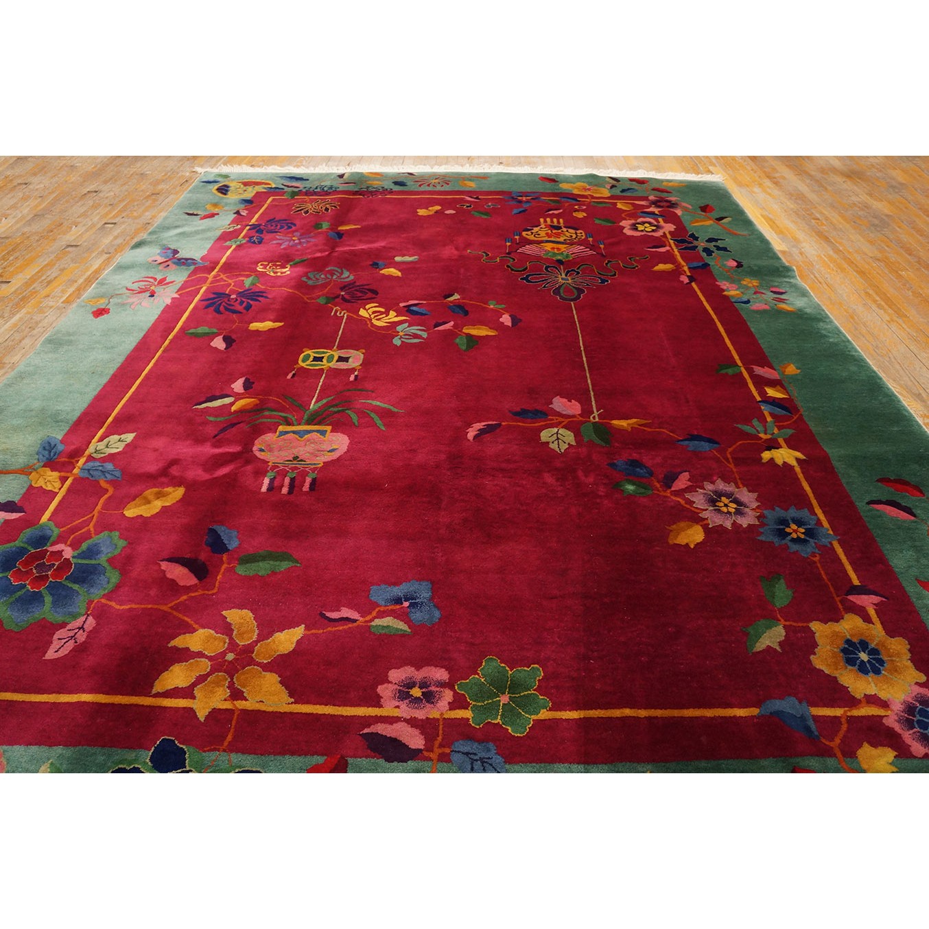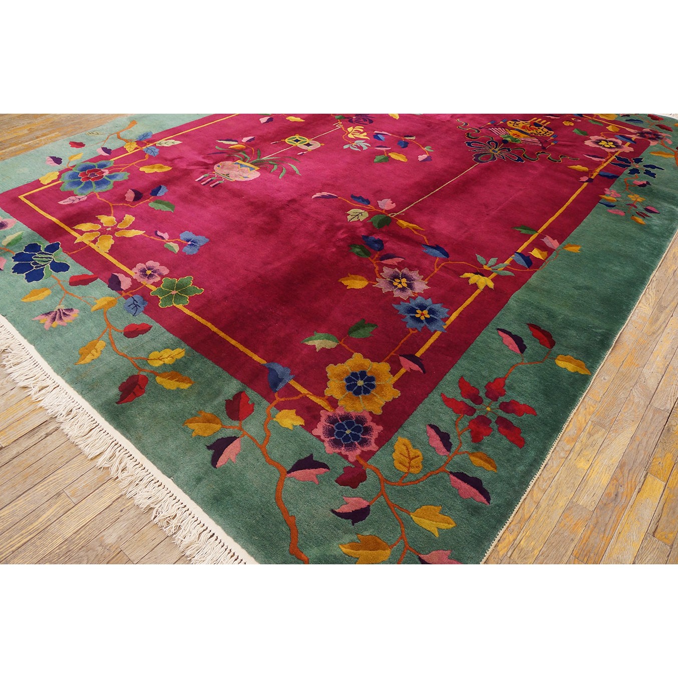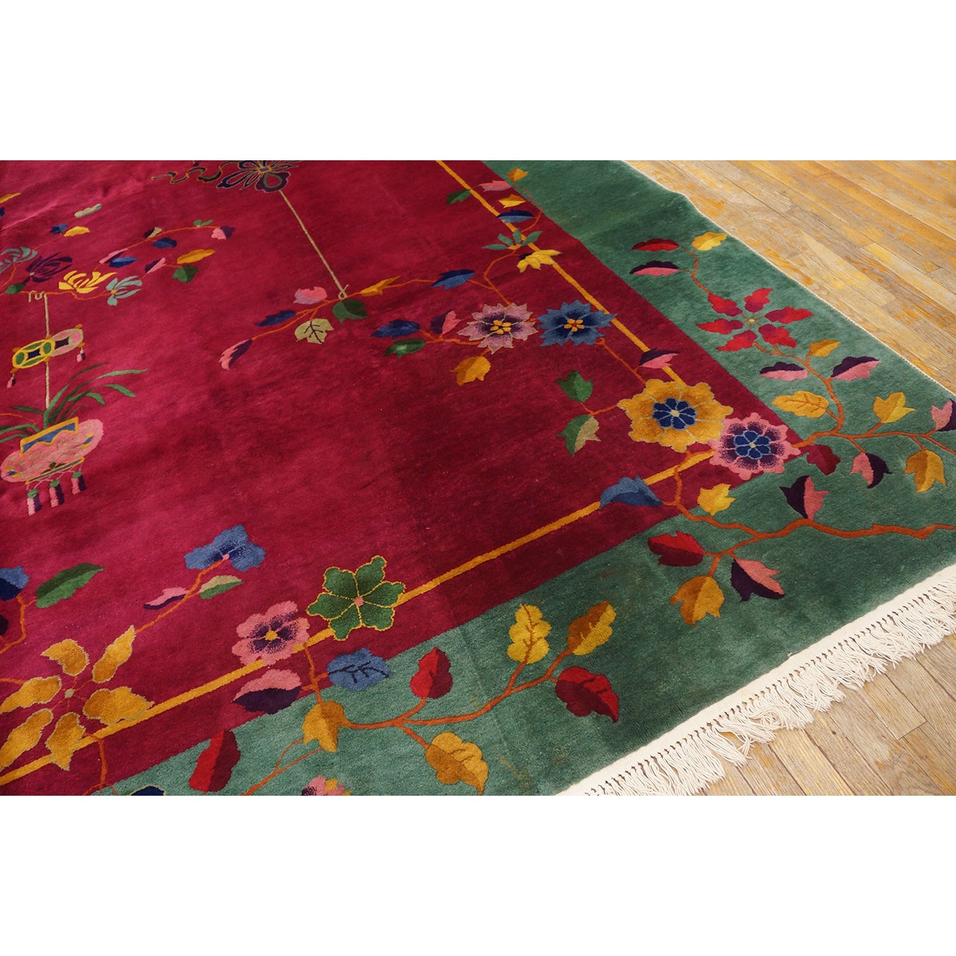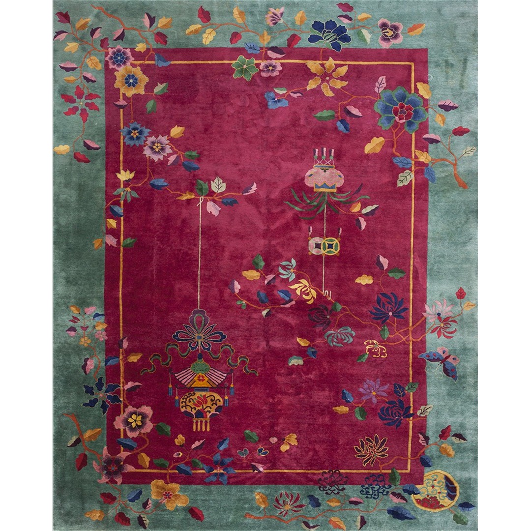 DescriptionChineseCarpets made in China proper. See entries Ningshia, Peking, Art Deco. Chinese - Art DecoAs the name implies, pieces woven between the wars for the Western market by mostly American owned firms especially Nichols and Fette, in thick heavy weaves using strong colors, asymmetric patterns and downplaying the Chinese-ness of the carpet. Nichols rugs are more strong toned than the pastel Fette. Most were woven in the coastal port city of Tientsin. Other lesser known workshops were also active. Some pieces are ultra-geometric and haute-Deco moderne in character: these are very rare. More frequent are pieces with bits of Chinese ornament: vases or other precious objects, paeonies, vines, fences, etc. Most common is the 9 x 12 size, in colors never found in mainstream Chinese rugs: backgrounds in black, mauve, purple, hot pink, orange, olive, employing the best synthetic chrome dyes of the period. Prices are still reasonable and carpets in top condition are available. | |