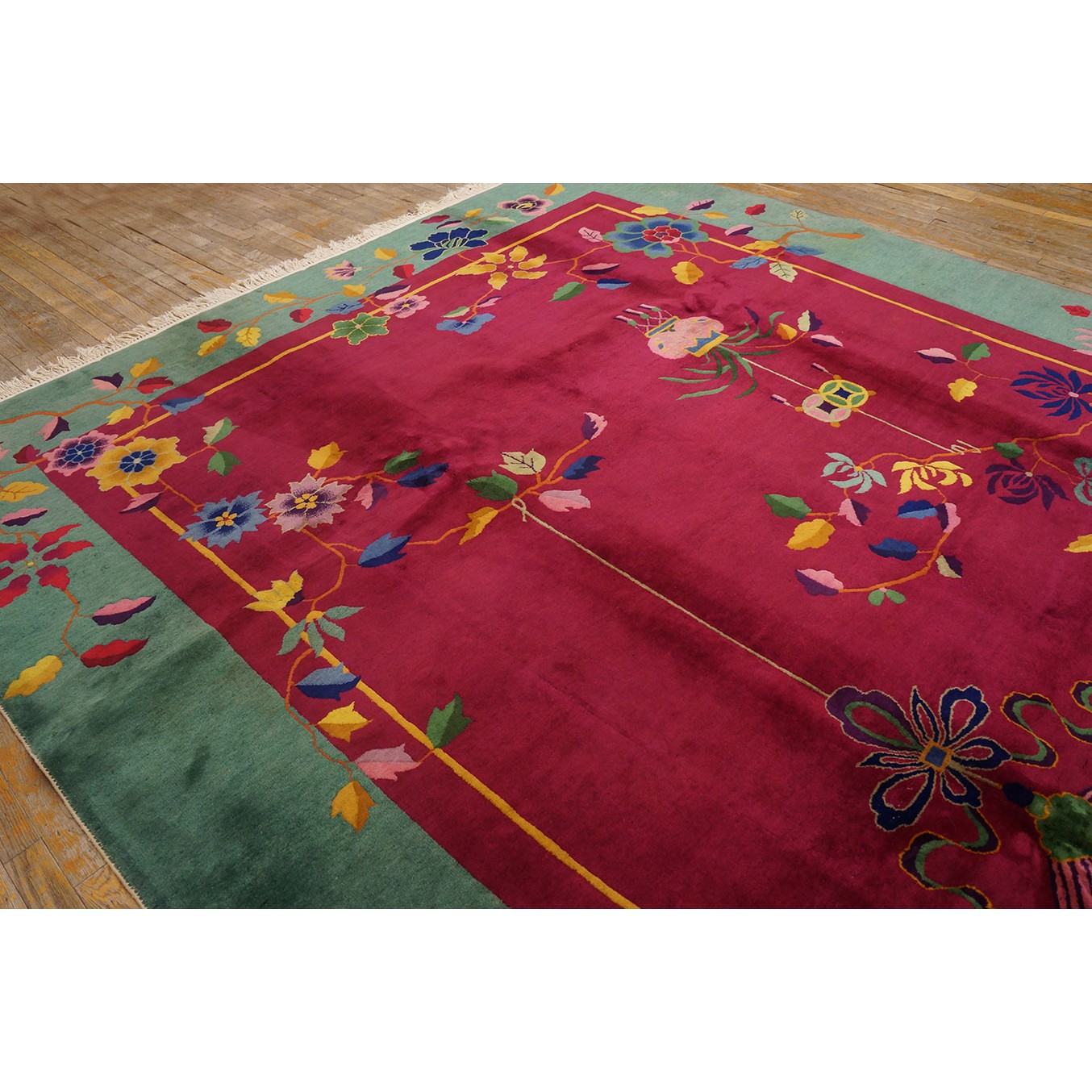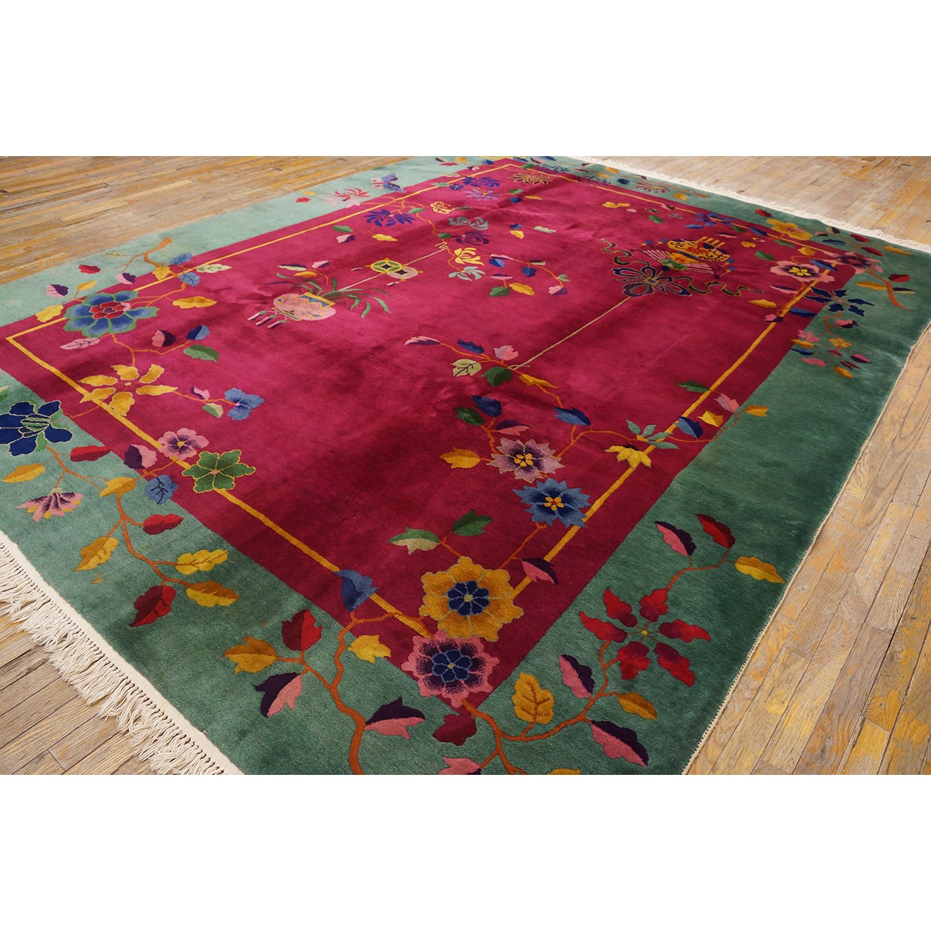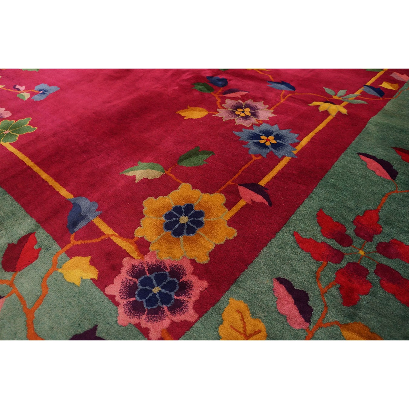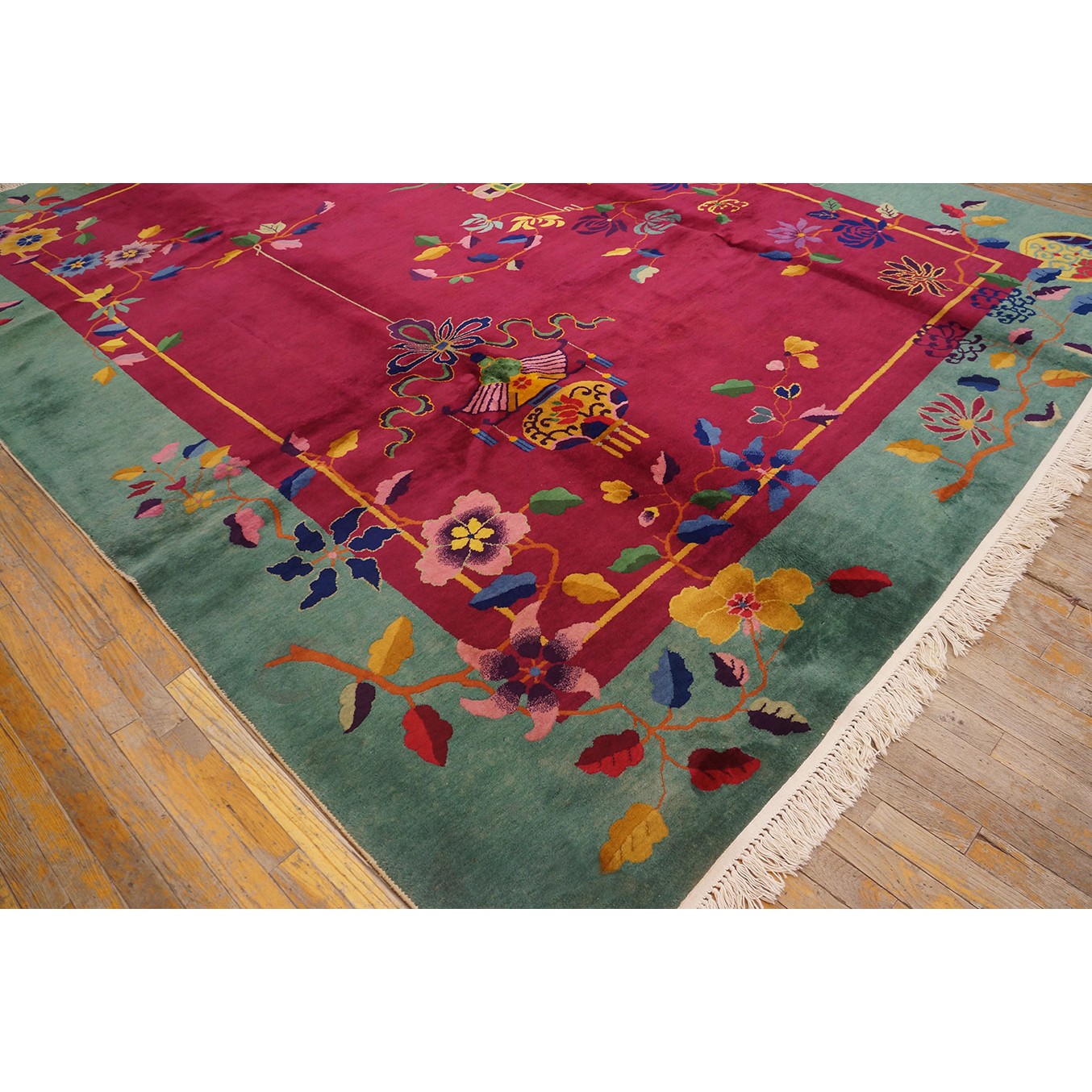DescriptionChineseCarpets made in China proper. See entries Ningshia, Peking, Art Deco. Chinese - Art DecoAs the name implies, pieces woven between the wars for the Western market by mostly American owned firms especially Nichols and Fette, in thick heavy weaves using strong colors, asymmetric patterns and downplaying the Chinese-ness of the carpet. Nichols rugs are more strong toned than the pastel Fette. Most were woven in the coastal port city of Tientsin. Other lesser known workshops were also active. Some pieces are ultra-geometric and haute-Deco moderne in character: these are very rare. More frequent are pieces with bits of Chinese ornament: vases or other precious objects, paeonies, vines, fences, etc. Most common is the 9 x 12 size, in colors never found in mainstream Chinese rugs: backgrounds in black, mauve, purple, hot pink, orange, olive, employing the best synthetic chrome dyes of the period. Prices are still reasonable and carpets in top condition are available. | |