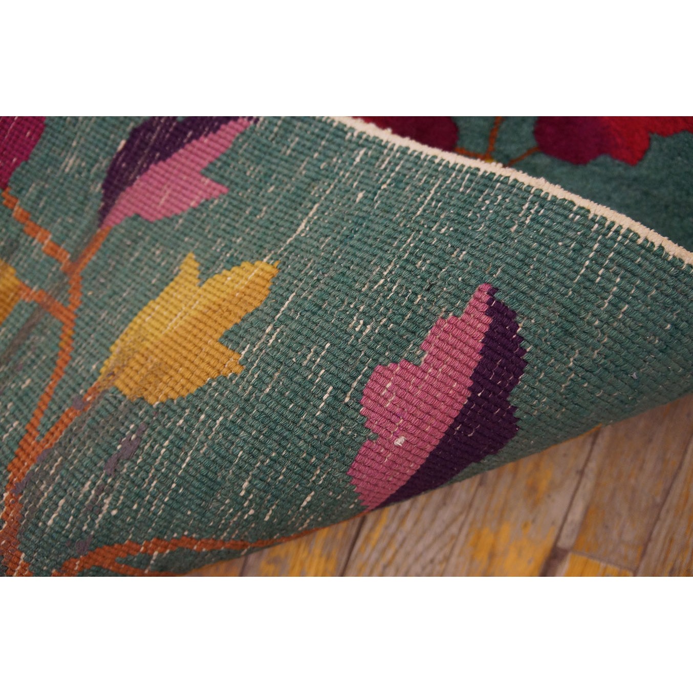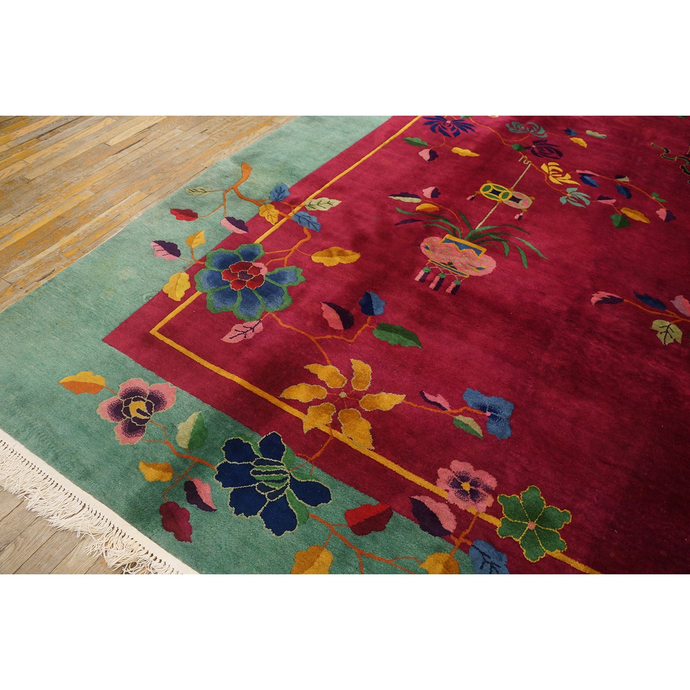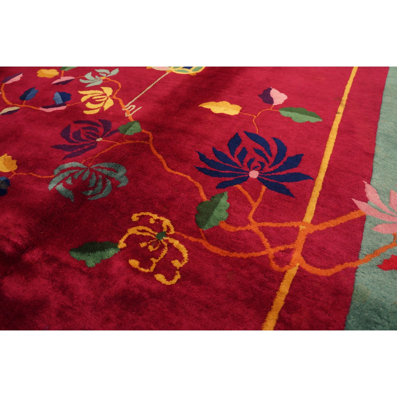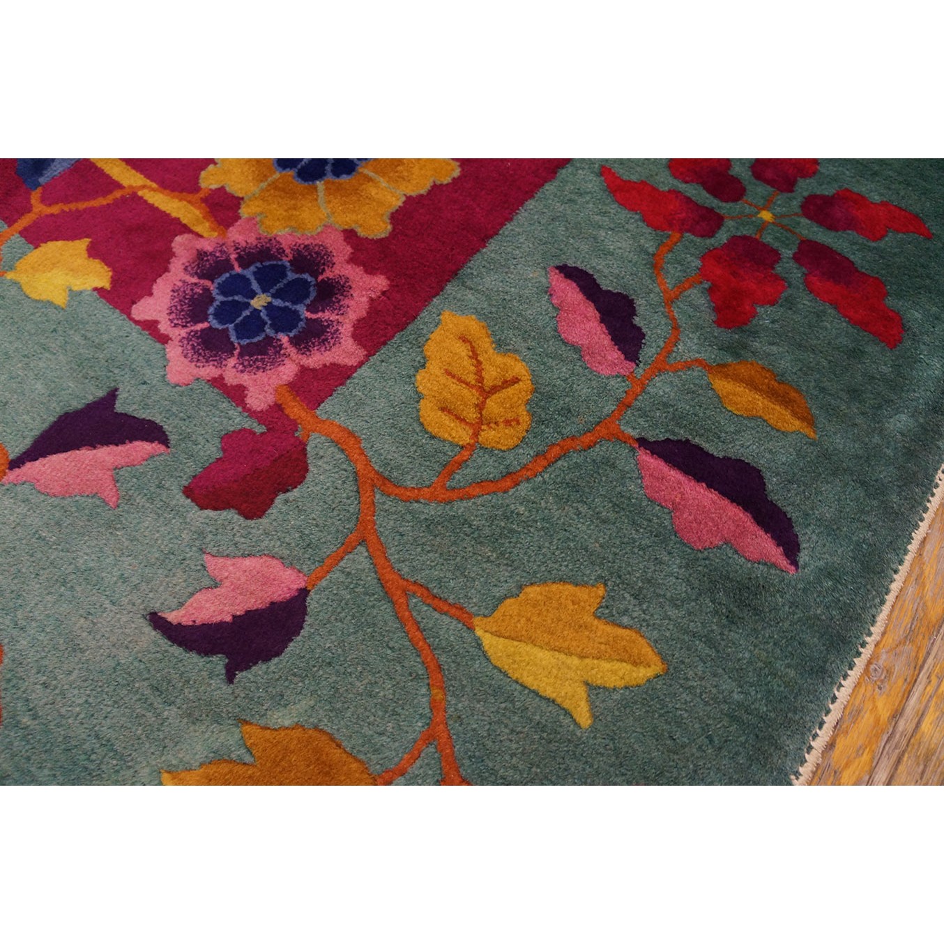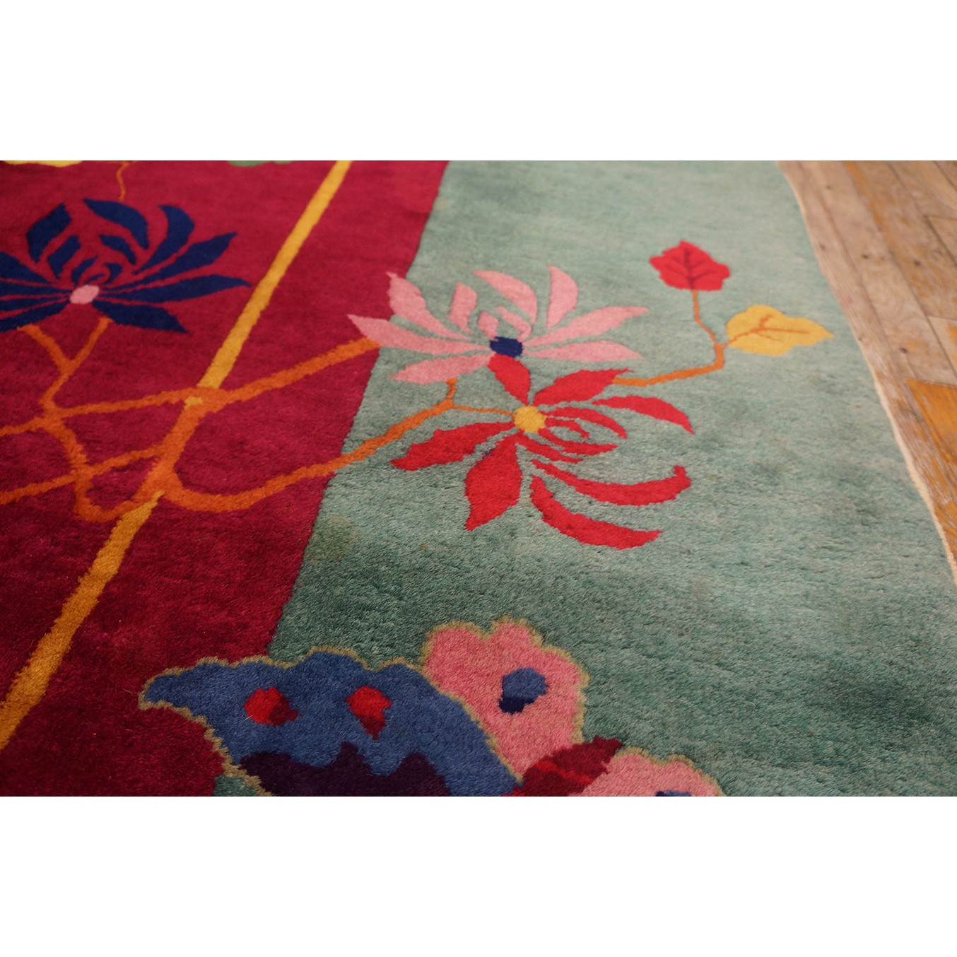 DescriptionChineseCarpets made in China proper. See entries Ningshia, Peking, Art Deco. Chinese - Art DecoAs the name implies, pieces woven between the wars for the Western market by mostly American owned firms especially Nichols and Fette, in thick heavy weaves using strong colors, asymmetric patterns and downplaying the Chinese-ness of the carpet. Nichols rugs are more strong toned than the pastel Fette. Most were woven in the coastal port city of Tientsin. Other lesser known workshops were also active. Some pieces are ultra-geometric and haute-Deco moderne in character: these are very rare. More frequent are pieces with bits of Chinese ornament: vases or other precious objects, paeonies, vines, fences, etc. Most common is the 9 x 12 size, in colors never found in mainstream Chinese rugs: backgrounds in black, mauve, purple, hot pink, orange, olive, employing the best synthetic chrome dyes of the period. Prices are still reasonable and carpets in top condition are available. | |
