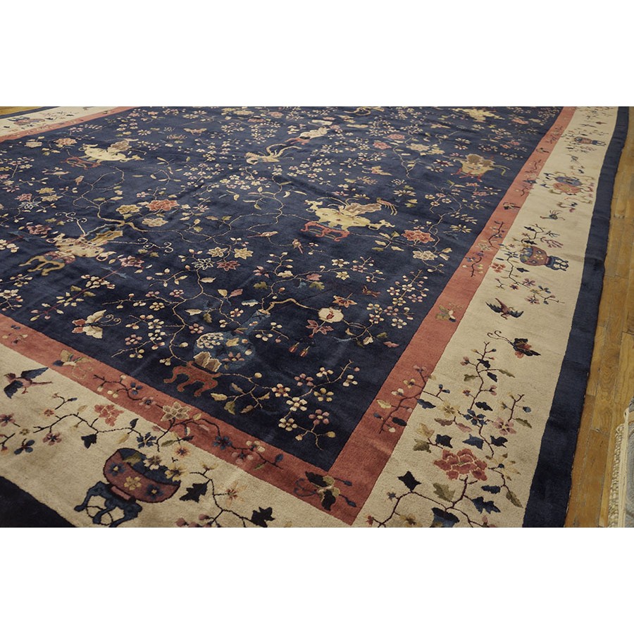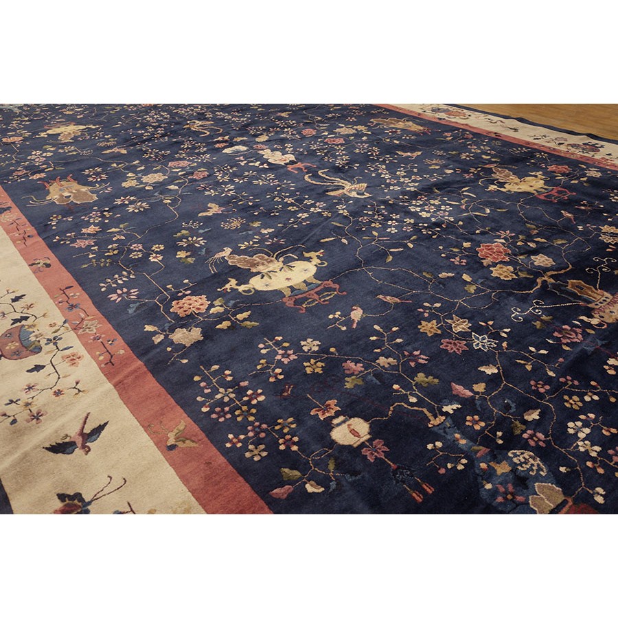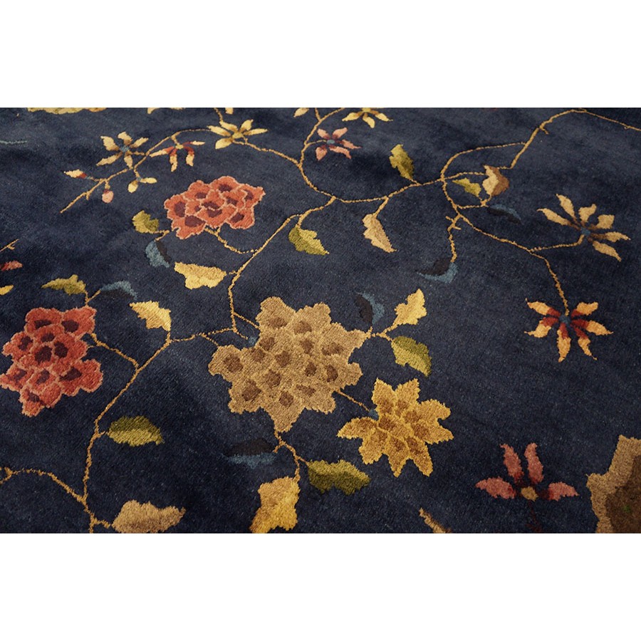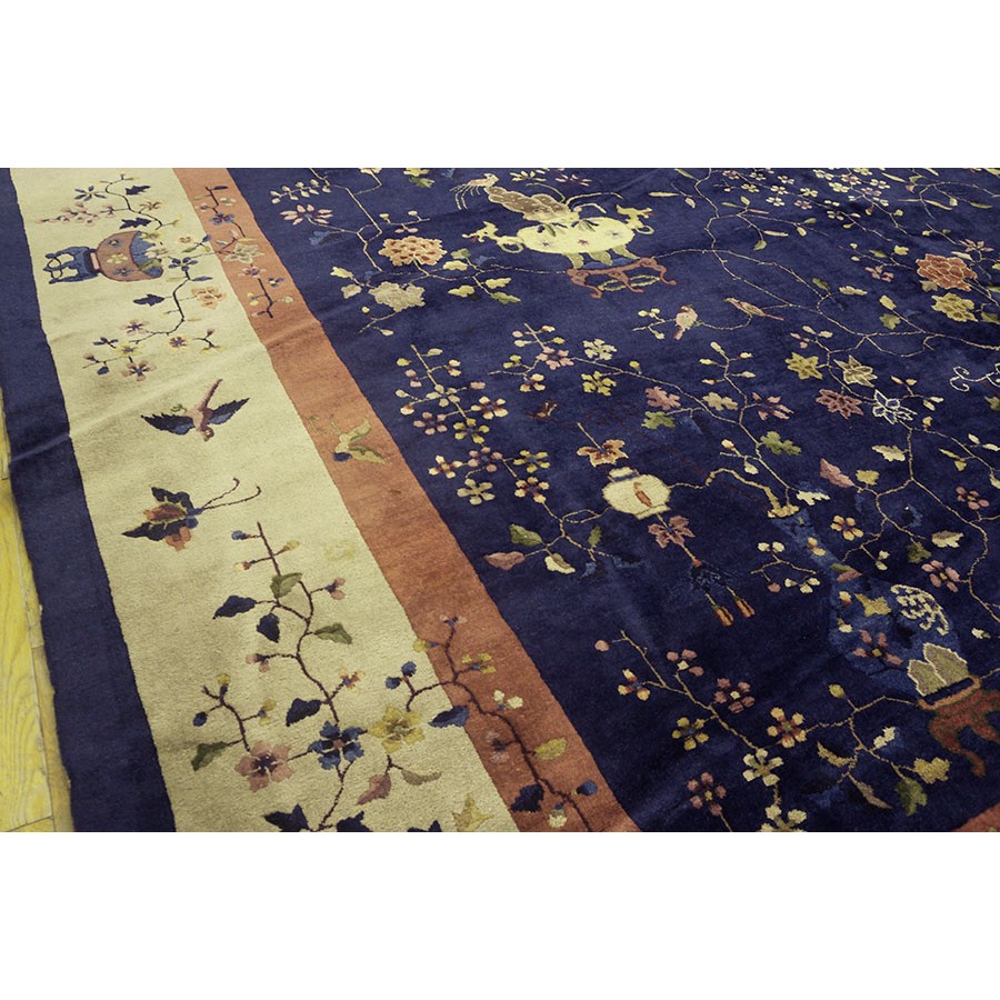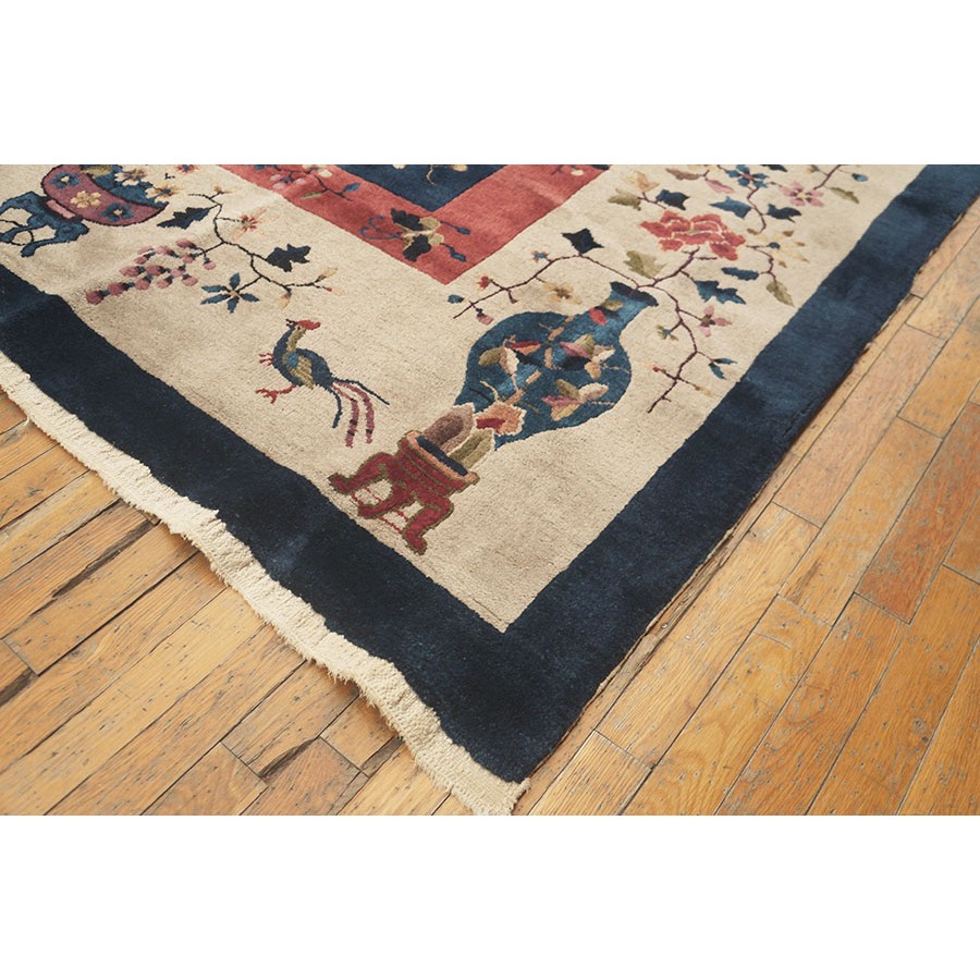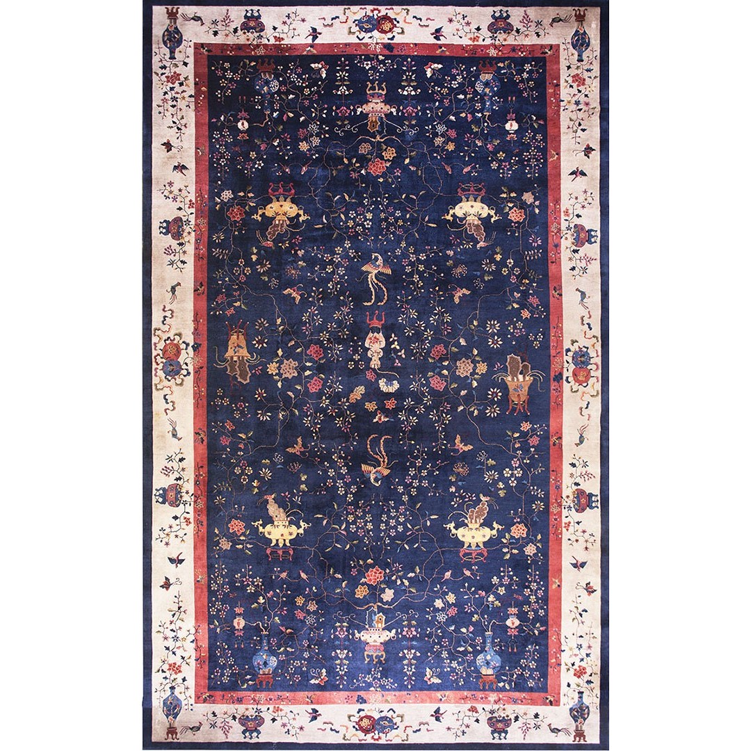 DescriptionChineseCarpets made in China proper. See entries Ningshia, Peking, Art Deco. Chinese - Art DecoAs the name implies, pieces woven between the wars for the Western market by mostly American owned firms especially Nichols and Fette, in thick heavy weaves using strong colors, asymmetric patterns and downplaying the Chinese-ness of the carpet. Nichols rugs are more strong toned than the pastel Fette. Most were woven in the coastal port city of Tientsin. Other lesser known workshops were also active. Some pieces are ultra-geometric and haute-Deco moderne in character: these are very rare. More frequent are pieces with bits of Chinese ornament: vases or other precious objects, paeonies, vines, fences, etc. Most common is the 9 x 12 size, in colors never found in mainstream Chinese rugs: backgrounds in black, mauve, purple, hot pink, orange, olive, employing the best synthetic chrome dyes of the period. Prices are still reasonable and carpets in top condition are available. | |