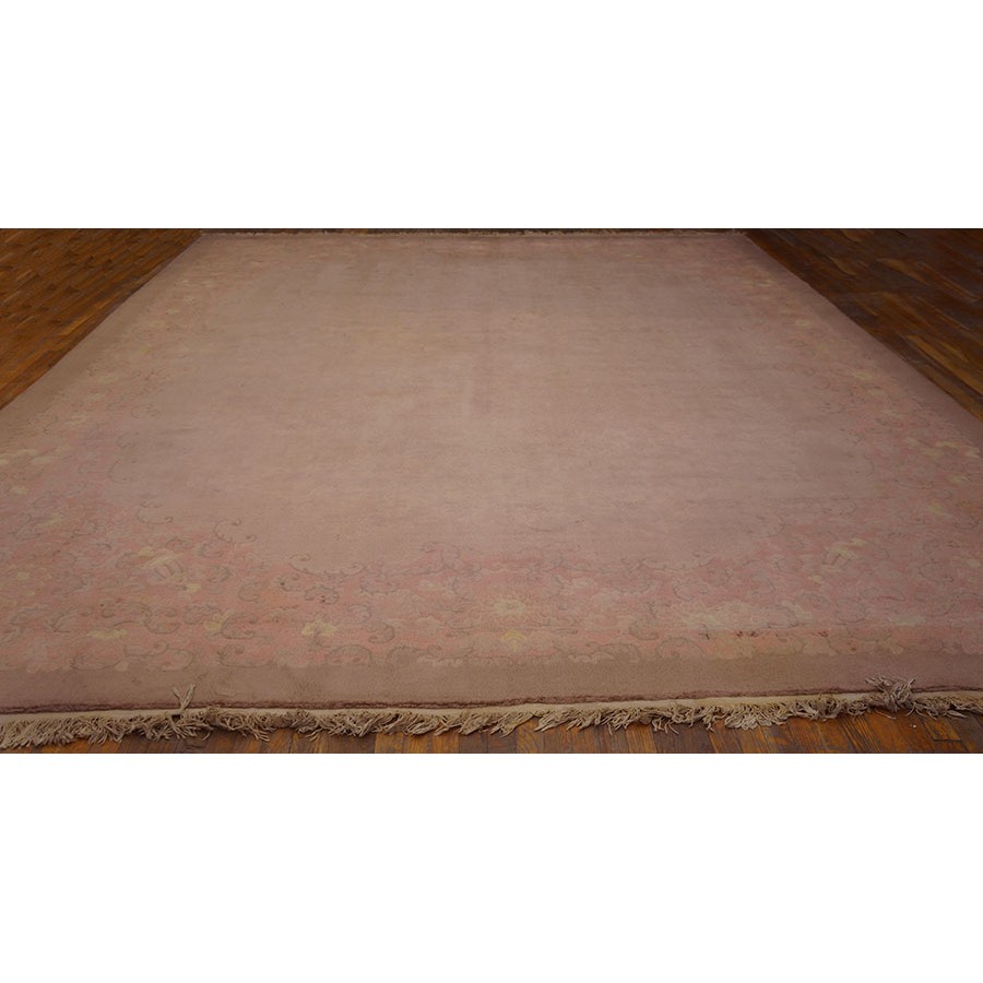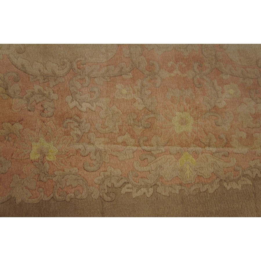 DescriptionChineseCarpets made in China proper. See entries Ningshia, Peking, Art Deco. Chinese - Art DecoAs the name implies, pieces woven between the wars for the Western market by mostly American owned firms especially Nichols and Fette, in thick heavy weaves using strong colors, asymmetric patterns and downplaying the Chinese-ness of the carpet. Nichols rugs are more strong toned than the pastel Fette. Most were woven in the coastal port city of Tientsin. Other lesser known workshops were also active. Some pieces are ultra-geometric and haute-Deco moderne in character: these are very rare. More frequent are pieces with bits of Chinese ornament: vases or other precious objects, paeonies, vines, fences, etc. Most common is the 9 x 12 size, in colors never found in mainstream Chinese rugs: backgrounds in black, mauve, purple, hot pink, orange, olive, employing the best synthetic chrome dyes of the period. Prices are still reasonable and carpets in top condition are available. | |