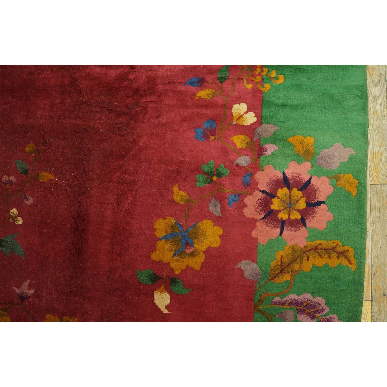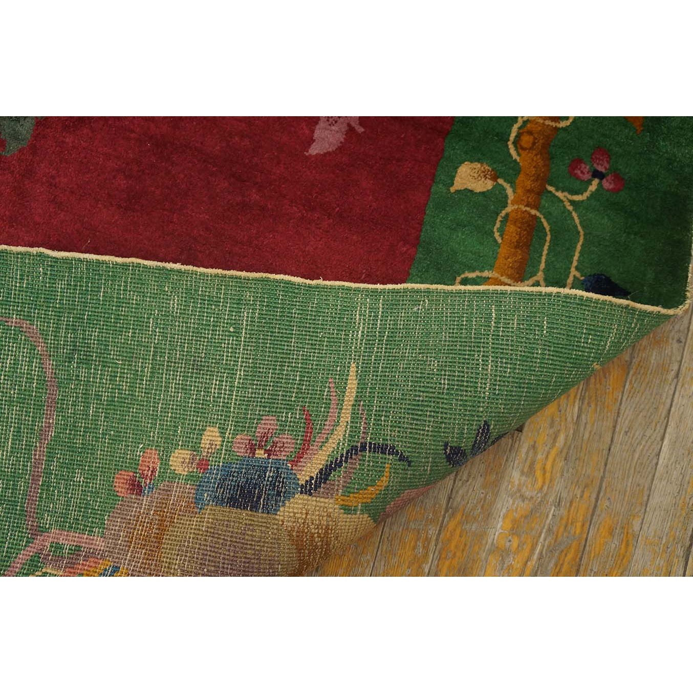 DescriptionChineseCarpets made in China proper. See entries Ningshia, Peking, Art Deco. Chinese - Art DecoAs the name implies, pieces woven between the wars for the Western market by mostly American owned firms especially Nichols and Fette, in thick heavy weaves using strong colors, asymmetric patterns and downplaying the Chinese-ness of the carpet. Nichols rugs are more strong toned than the pastel Fette. Most were woven in the coastal port city of Tientsin. Other lesser known workshops were also active. Some pieces are ultra-geometric and haute-Deco moderne in character: these are very rare. More frequent are pieces with bits of Chinese ornament: vases or other precious objects, paeonies, vines, fences, etc. Most common is the 9 x 12 size, in colors never found in mainstream Chinese rugs: backgrounds in black, mauve, purple, hot pink, orange, olive, employing the best synthetic chrome dyes of the period. Prices are still reasonable and carpets in top condition are available. | |