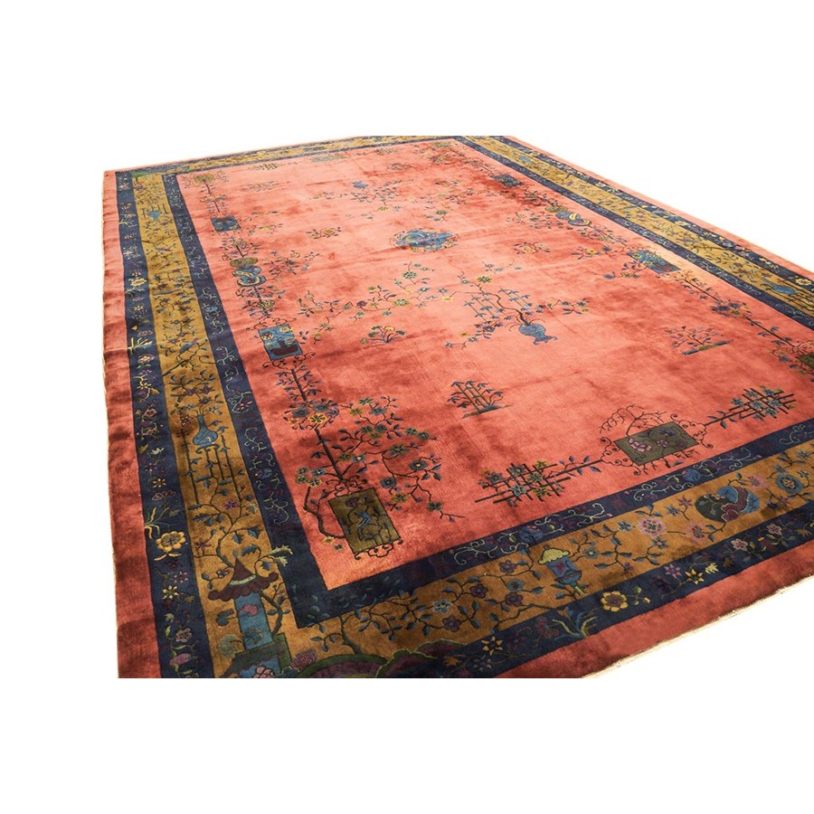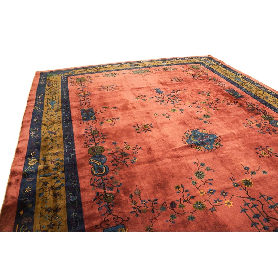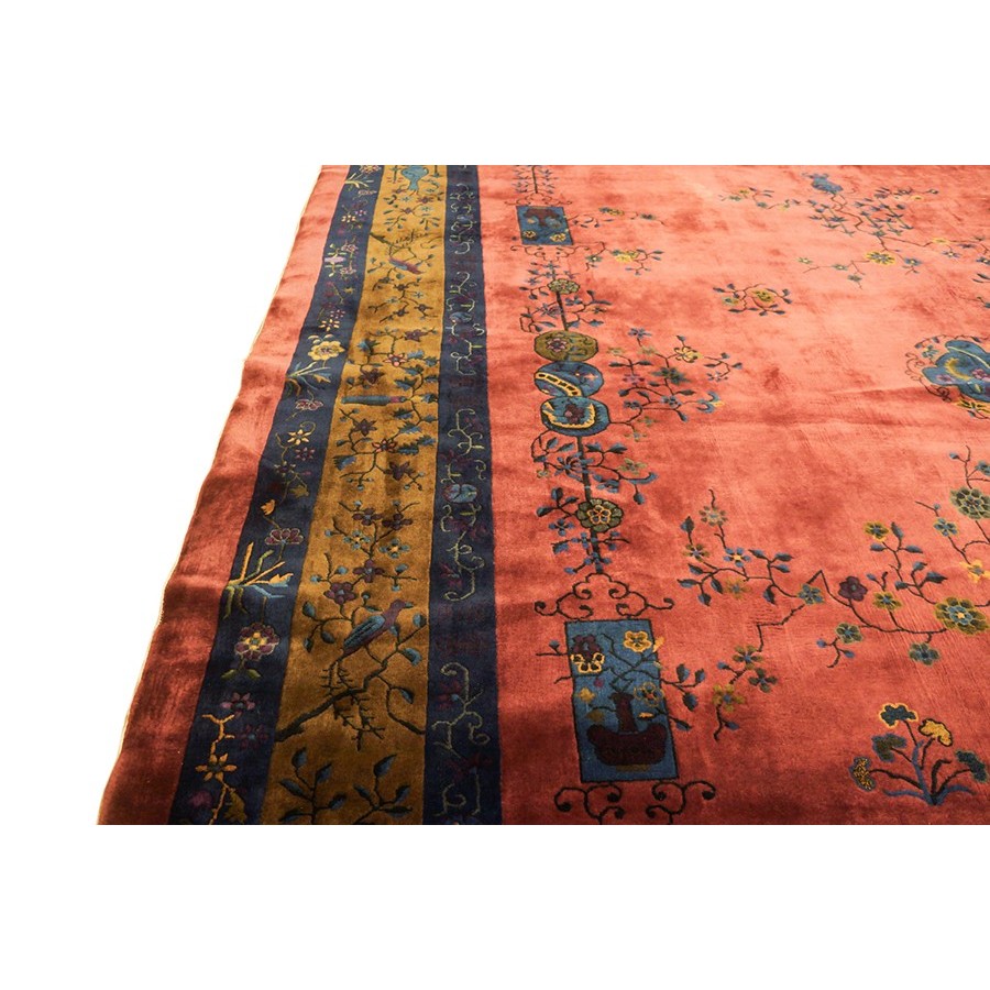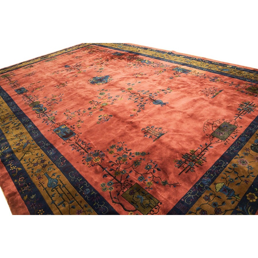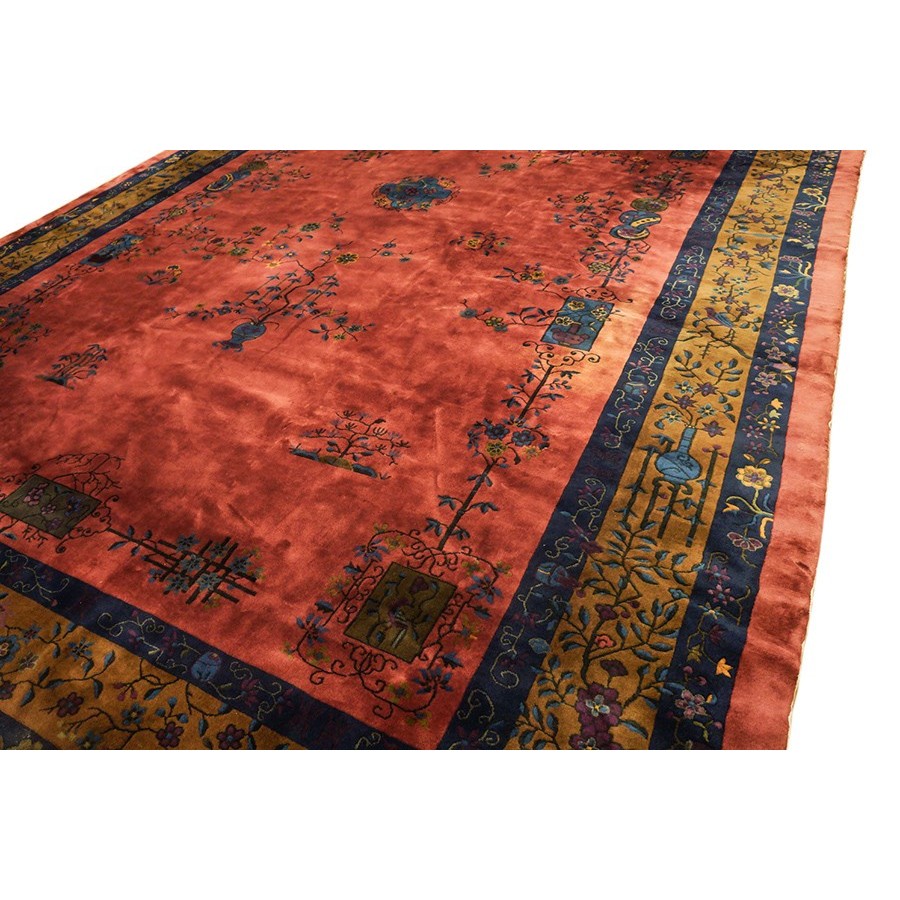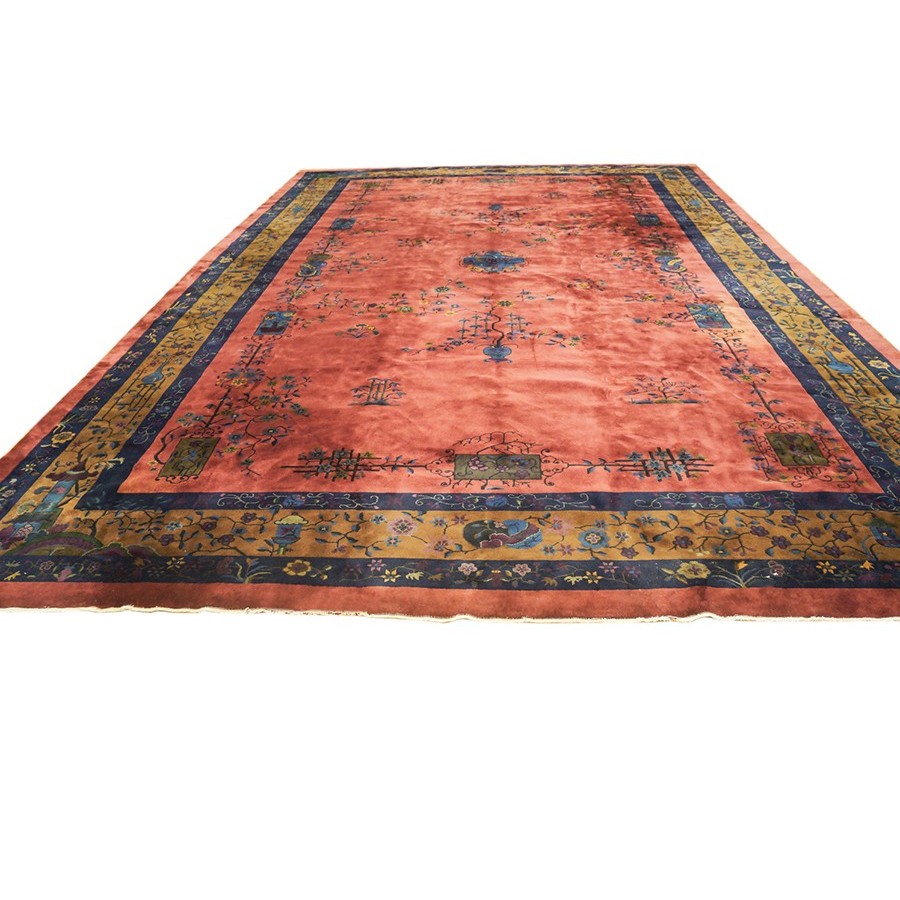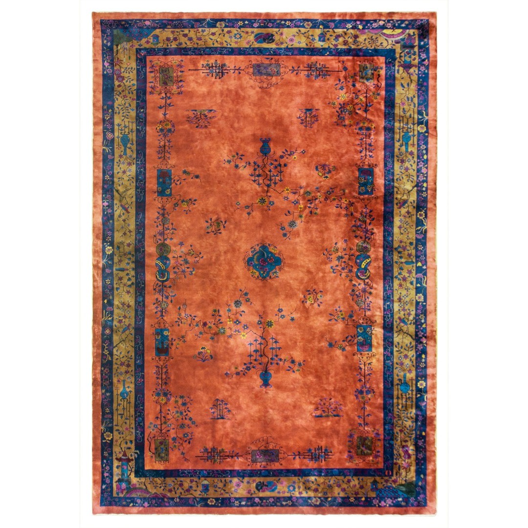 DescriptionChineseCarpets made in China proper. See entries Ningshia, Peking, Art Deco. Chinese - Art DecoAs the name implies, pieces woven between the wars for the Western market by mostly American owned firms especially Nichols and Fette, in thick heavy weaves using strong colors, asymmetric patterns and downplaying the Chinese-ness of the carpet. Nichols rugs are more strong toned than the pastel Fette. Most were woven in the coastal port city of Tientsin. Other lesser known workshops were also active. Some pieces are ultra-geometric and haute-Deco moderne in character: these are very rare. More frequent are pieces with bits of Chinese ornament: vases or other precious objects, paeonies, vines, fences, etc. Most common is the 9 x 12 size, in colors never found in mainstream Chinese rugs: backgrounds in black, mauve, purple, hot pink, orange, olive, employing the best synthetic chrome dyes of the period. Prices are still reasonable and carpets in top condition are available. | |