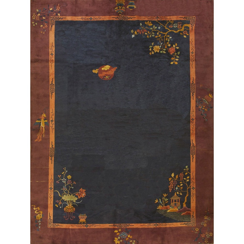 DescriptionChineseCarpets made in China proper. See entries Ningshia, Peking, Art Deco. Chinese - Art DecoAs the name implies, pieces woven between the wars for the Western market by mostly American owned firms especially Nichols and Fette, in thick heavy weaves using strong colors, asymmetric patterns and downplaying the Chinese-ness of the carpet. Nichols rugs are more strong toned than the pastel Fette. Most were woven in the coastal port city of Tientsin. Other lesser known workshops were also active. Some pieces are ultra-geometric and haute-Deco moderne in character: these are very rare. More frequent are pieces with bits of Chinese ornament: vases or other precious objects, paeonies, vines, fences, etc. Most common is the 9 x 12 size, in colors never found in mainstream Chinese rugs: backgrounds in black, mauve, purple, hot pink, orange, olive, employing the best synthetic chrome dyes of the period. Prices are still reasonable and carpets in top condition are available. | |