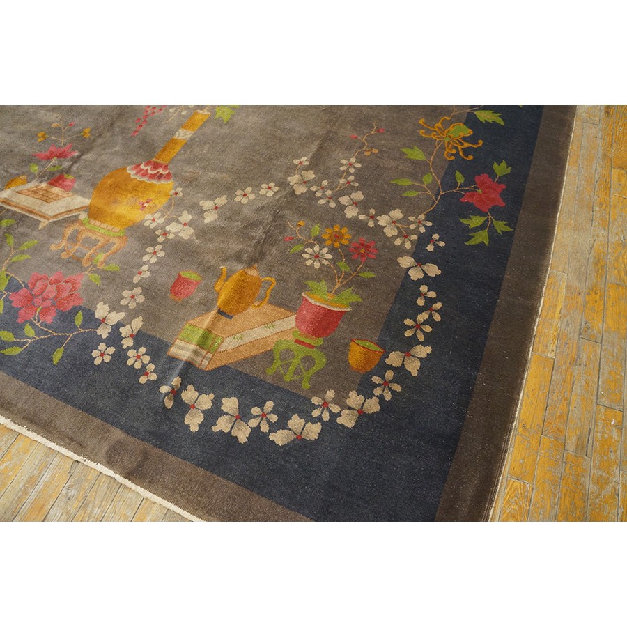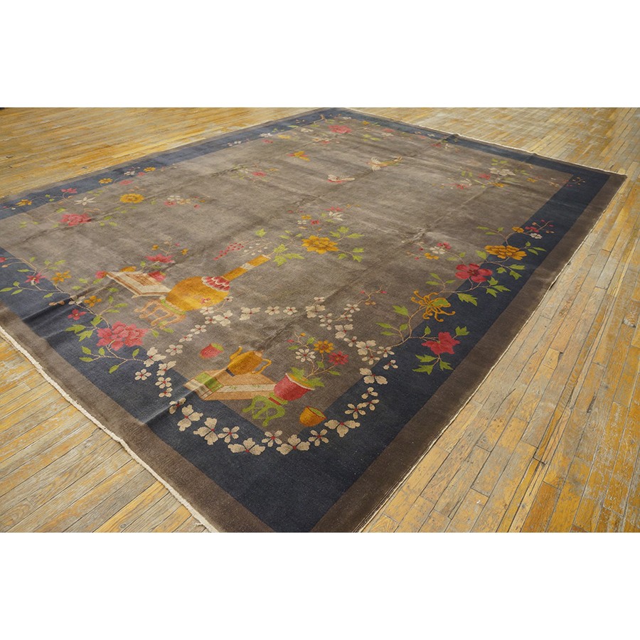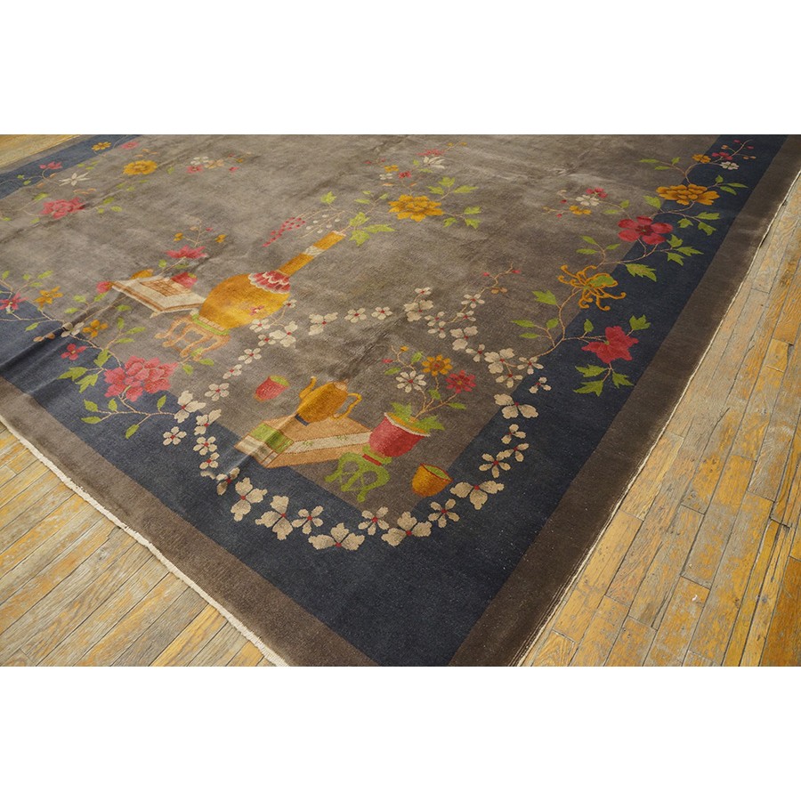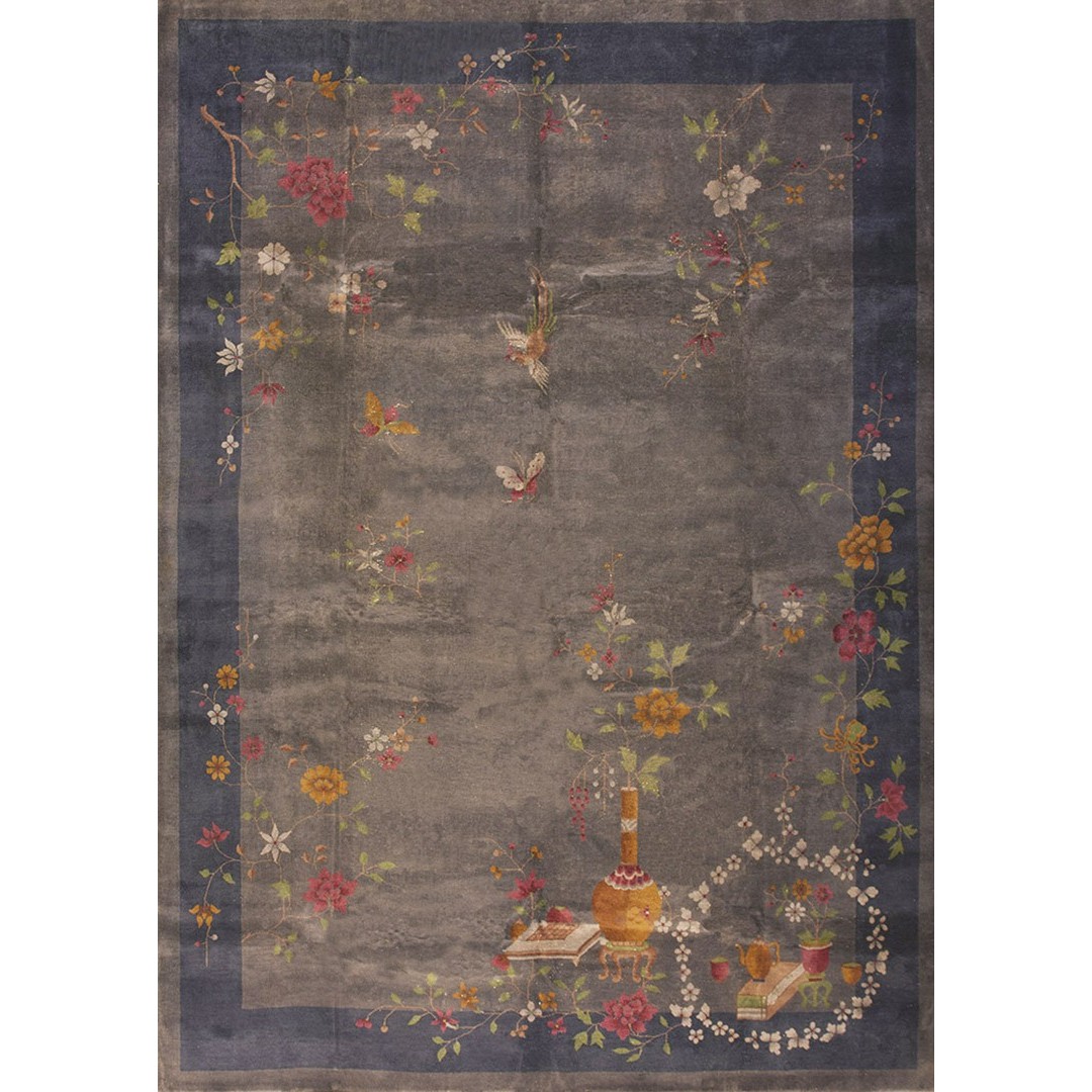 DescriptionChineseCarpets made in China proper. See entries Ningshia, Peking, Art Deco. Chinese - Art DecoAs the name implies, pieces woven between the wars for the Western market by mostly American owned firms especially Nichols and Fette, in thick heavy weaves using strong colors, asymmetric patterns and downplaying the Chinese-ness of the carpet. Nichols rugs are more strong toned than the pastel Fette. Most were woven in the coastal port city of Tientsin. Other lesser known workshops were also active. Some pieces are ultra-geometric and haute-Deco moderne in character: these are very rare. More frequent are pieces with bits of Chinese ornament: vases or other precious objects, paeonies, vines, fences, etc. Most common is the 9 x 12 size, in colors never found in mainstream Chinese rugs: backgrounds in black, mauve, purple, hot pink, orange, olive, employing the best synthetic chrome dyes of the period. Prices are still reasonable and carpets in top condition are available. | |