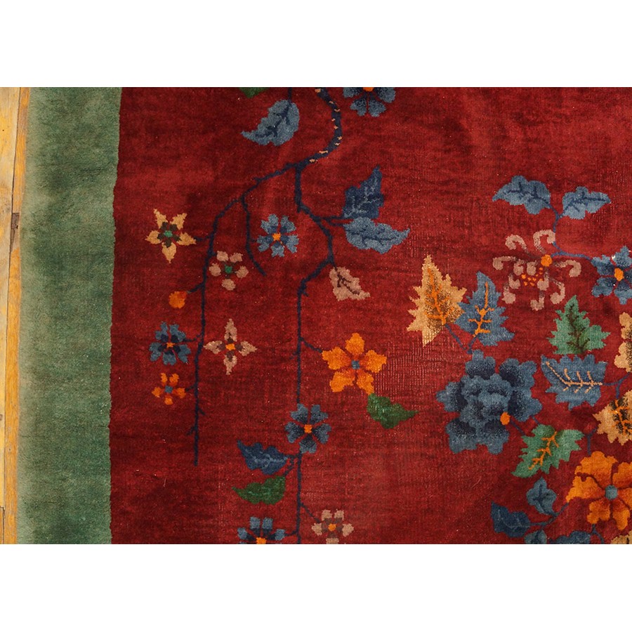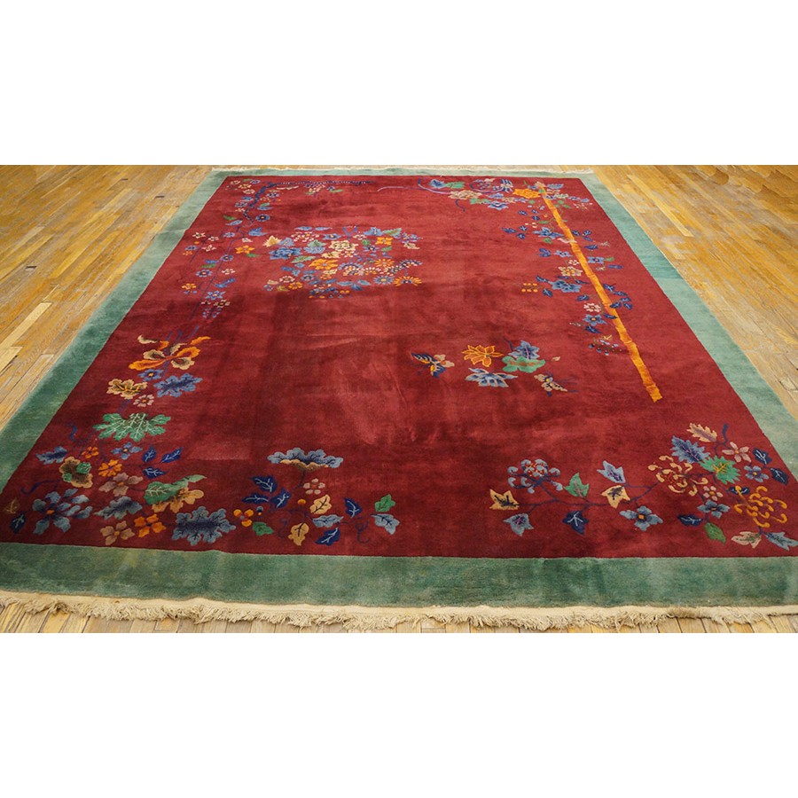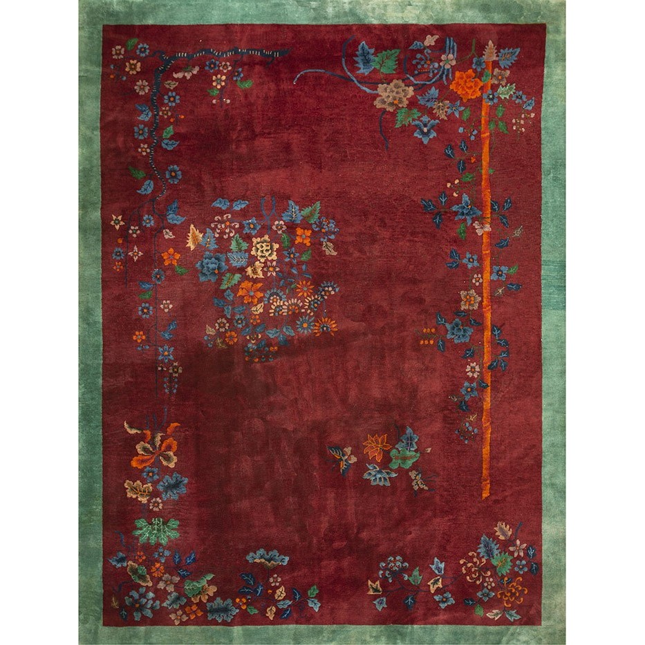 DescriptionChineseCarpets made in China proper. See entries Ningshia, Peking, Art Deco. Chinese - Art DecoAs the name implies, pieces woven between the wars for the Western market by mostly American owned firms especially Nichols and Fette, in thick heavy weaves using strong colors, asymmetric patterns and downplaying the Chinese-ness of the carpet. Nichols rugs are more strong toned than the pastel Fette. Most were woven in the coastal port city of Tientsin. Other lesser known workshops were also active. Some pieces are ultra-geometric and haute-Deco moderne in character: these are very rare. More frequent are pieces with bits of Chinese ornament: vases or other precious objects, paeonies, vines, fences, etc. Most common is the 9 x 12 size, in colors never found in mainstream Chinese rugs: backgrounds in black, mauve, purple, hot pink, orange, olive, employing the best synthetic chrome dyes of the period. Prices are still reasonable and carpets in top condition are available. | |