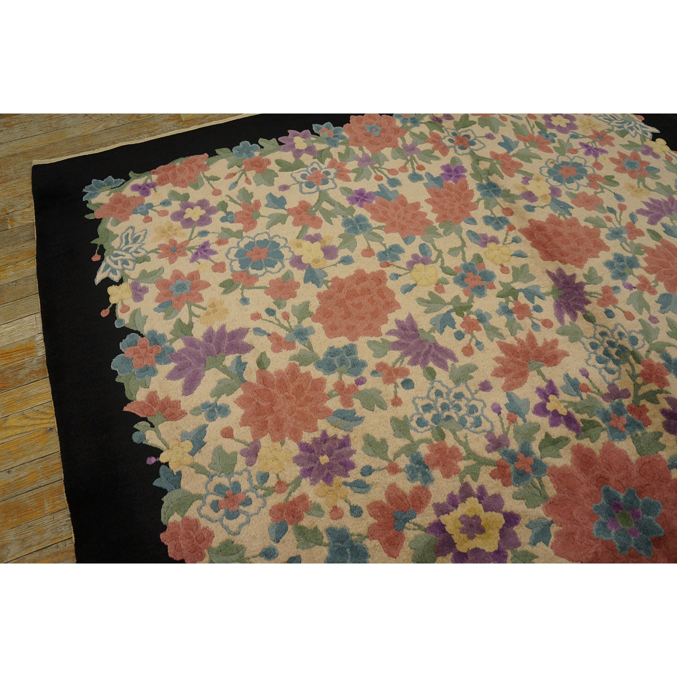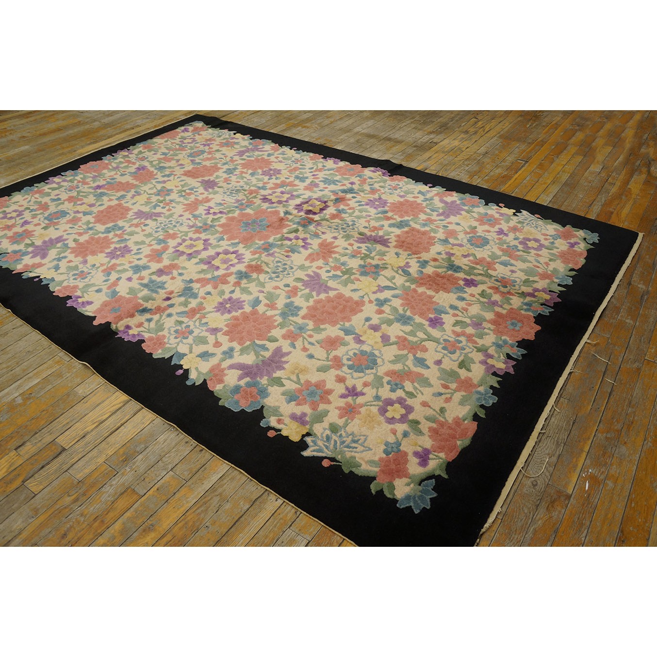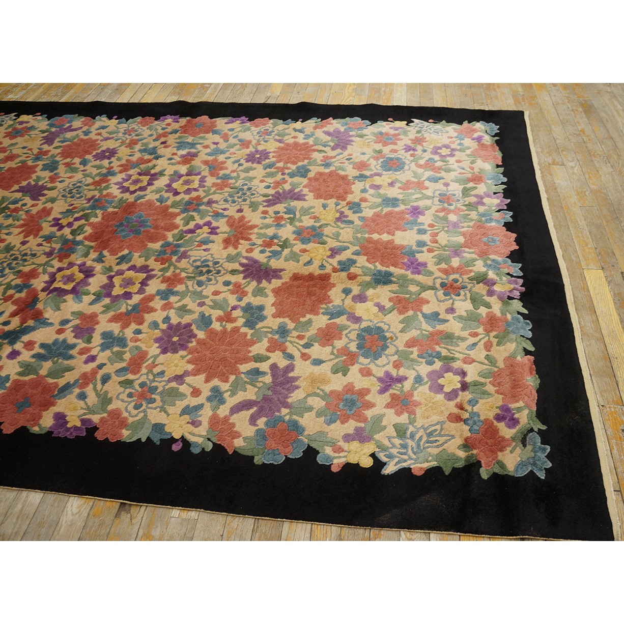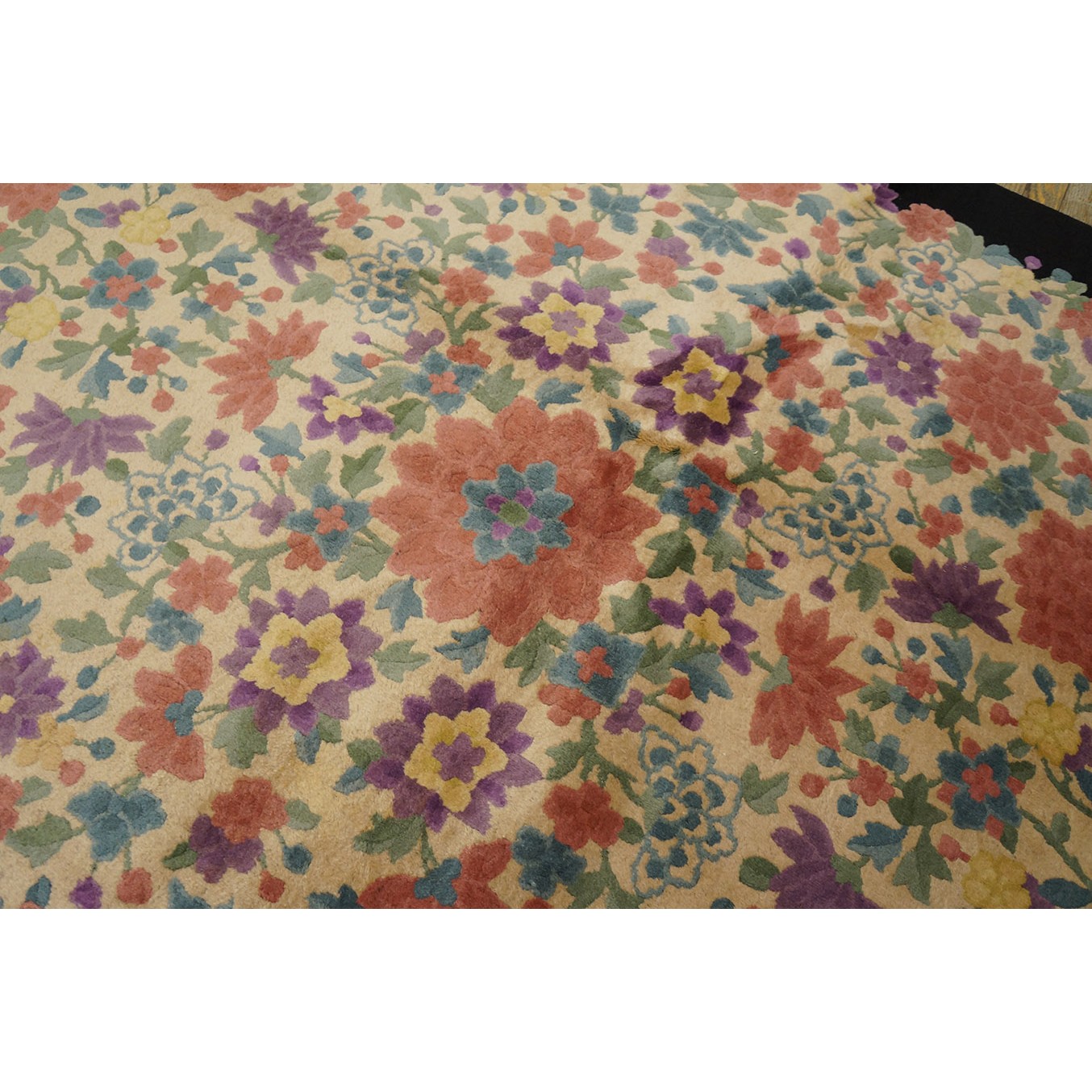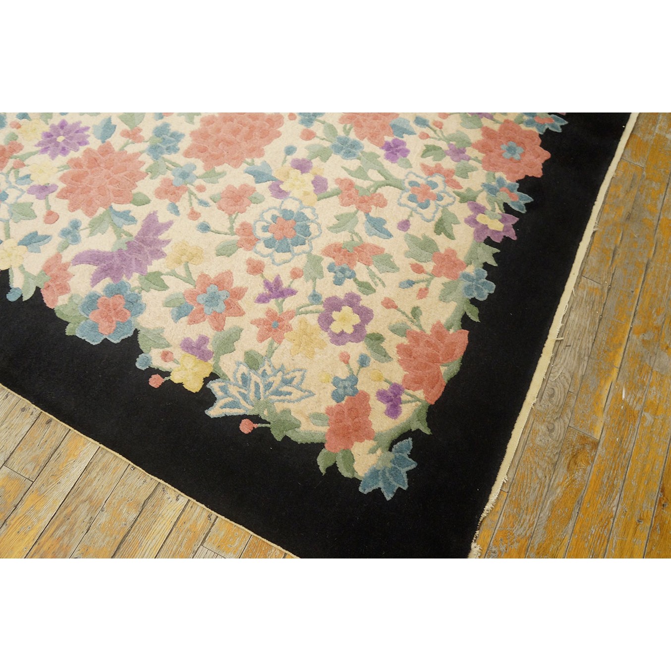 DescriptionChineseCarpets made in China proper. See entries Ningshia, Peking, Art Deco. Chinese - Art DecoAs the name implies, pieces woven between the wars for the Western market by mostly American owned firms especially Nichols and Fette, in thick heavy weaves using strong colors, asymmetric patterns and downplaying the Chinese-ness of the carpet. Nichols rugs are more strong toned than the pastel Fette. Most were woven in the coastal port city of Tientsin. Other lesser known workshops were also active. Some pieces are ultra-geometric and haute-Deco moderne in character: these are very rare. More frequent are pieces with bits of Chinese ornament: vases or other precious objects, paeonies, vines, fences, etc. Most common is the 9 x 12 size, in colors never found in mainstream Chinese rugs: backgrounds in black, mauve, purple, hot pink, orange, olive, employing the best synthetic chrome dyes of the period. Prices are still reasonable and carpets in top condition are available. | |