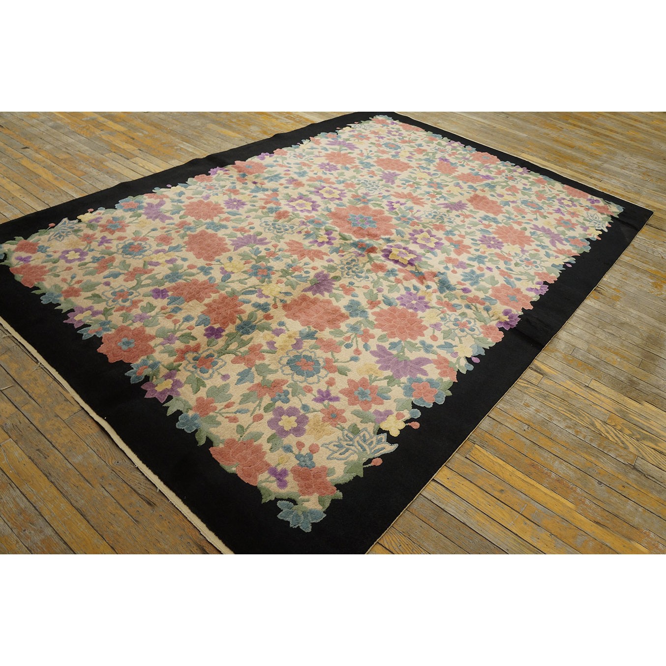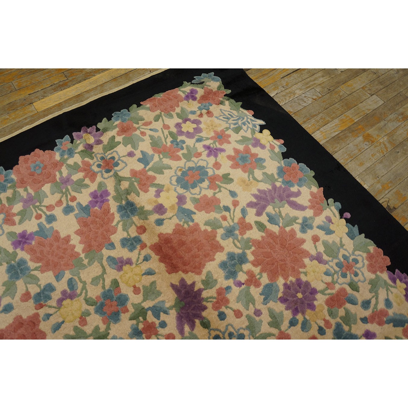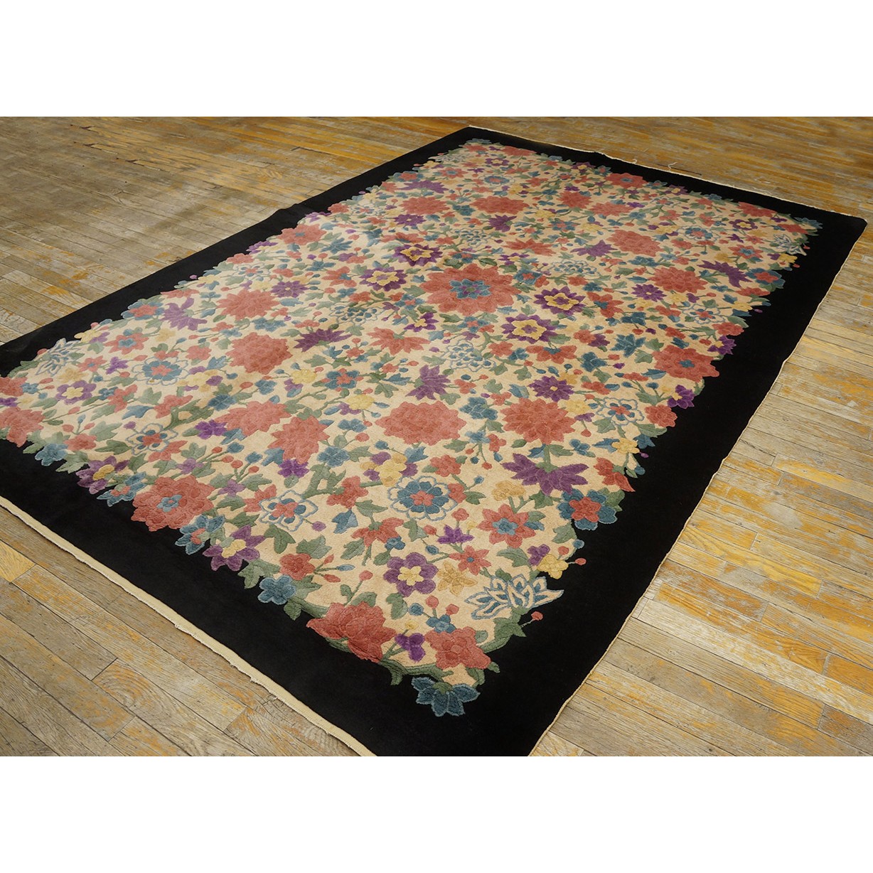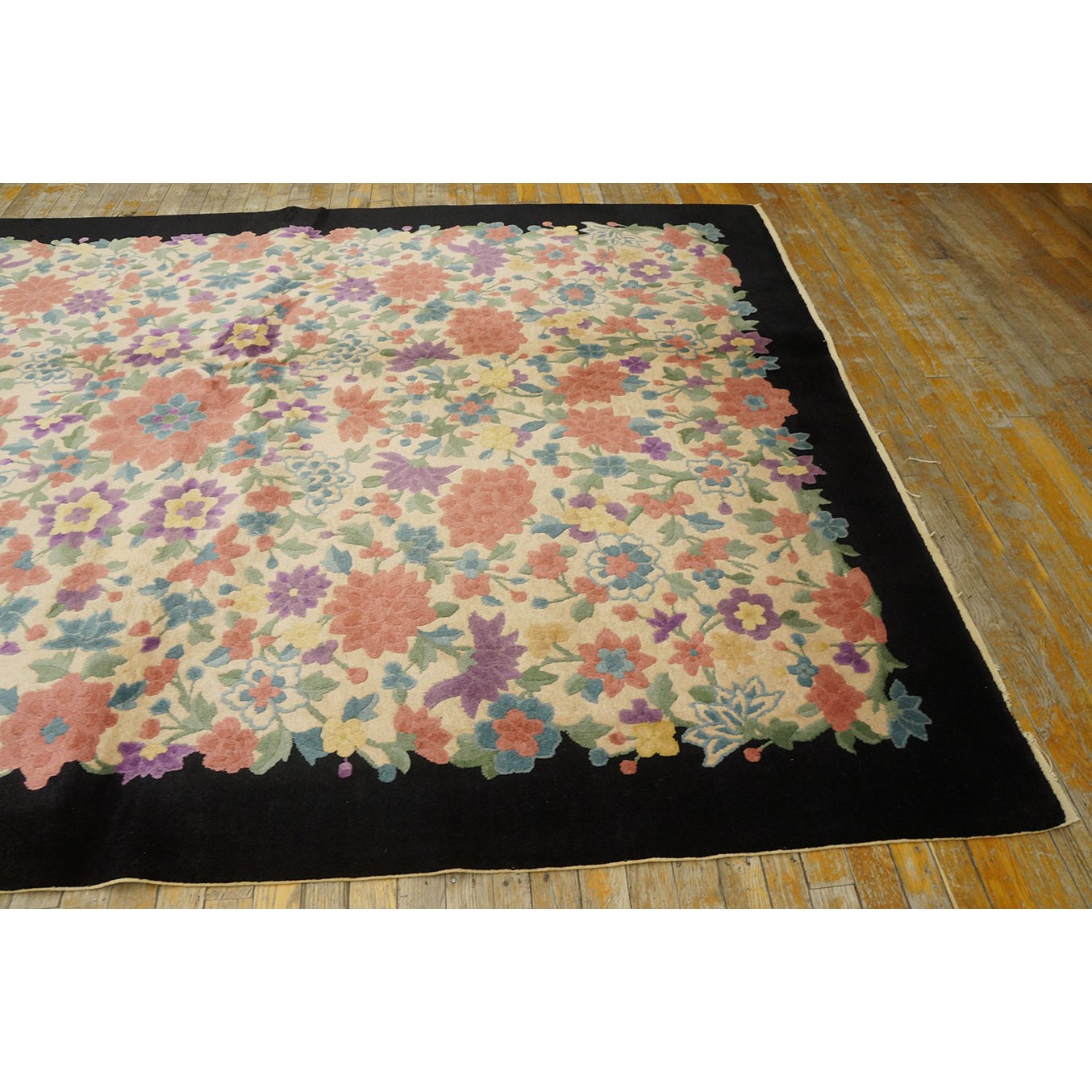 DescriptionChineseCarpets made in China proper. See entries Ningshia, Peking, Art Deco. Chinese - Art DecoAs the name implies, pieces woven between the wars for the Western market by mostly American owned firms especially Nichols and Fette, in thick heavy weaves using strong colors, asymmetric patterns and downplaying the Chinese-ness of the carpet. Nichols rugs are more strong toned than the pastel Fette. Most were woven in the coastal port city of Tientsin. Other lesser known workshops were also active. Some pieces are ultra-geometric and haute-Deco moderne in character: these are very rare. More frequent are pieces with bits of Chinese ornament: vases or other precious objects, paeonies, vines, fences, etc. Most common is the 9 x 12 size, in colors never found in mainstream Chinese rugs: backgrounds in black, mauve, purple, hot pink, orange, olive, employing the best synthetic chrome dyes of the period. Prices are still reasonable and carpets in top condition are available. | |