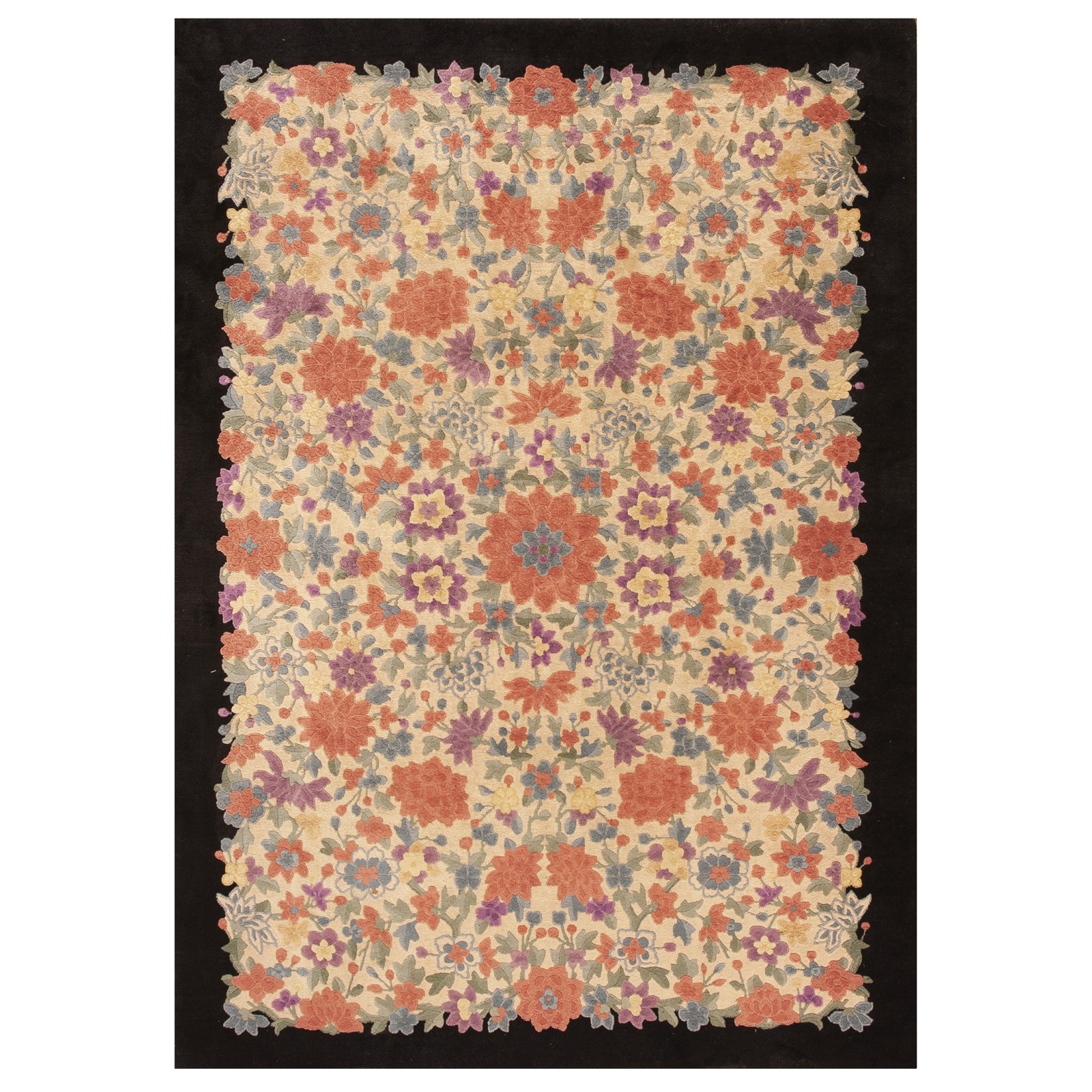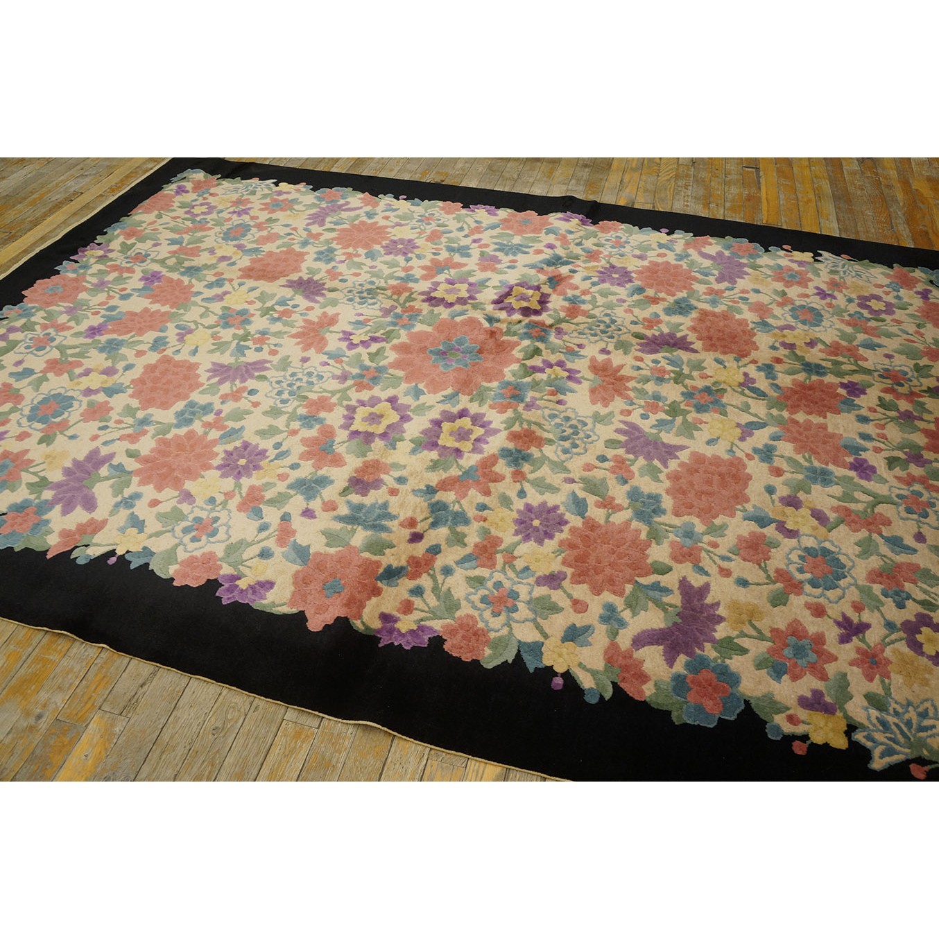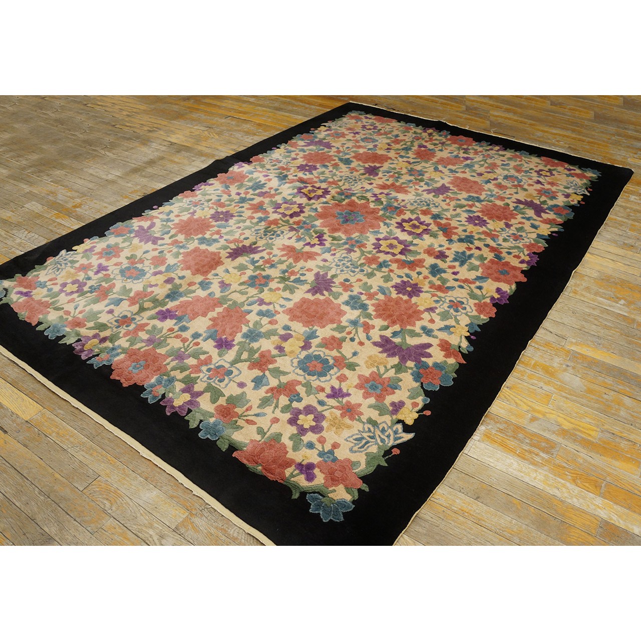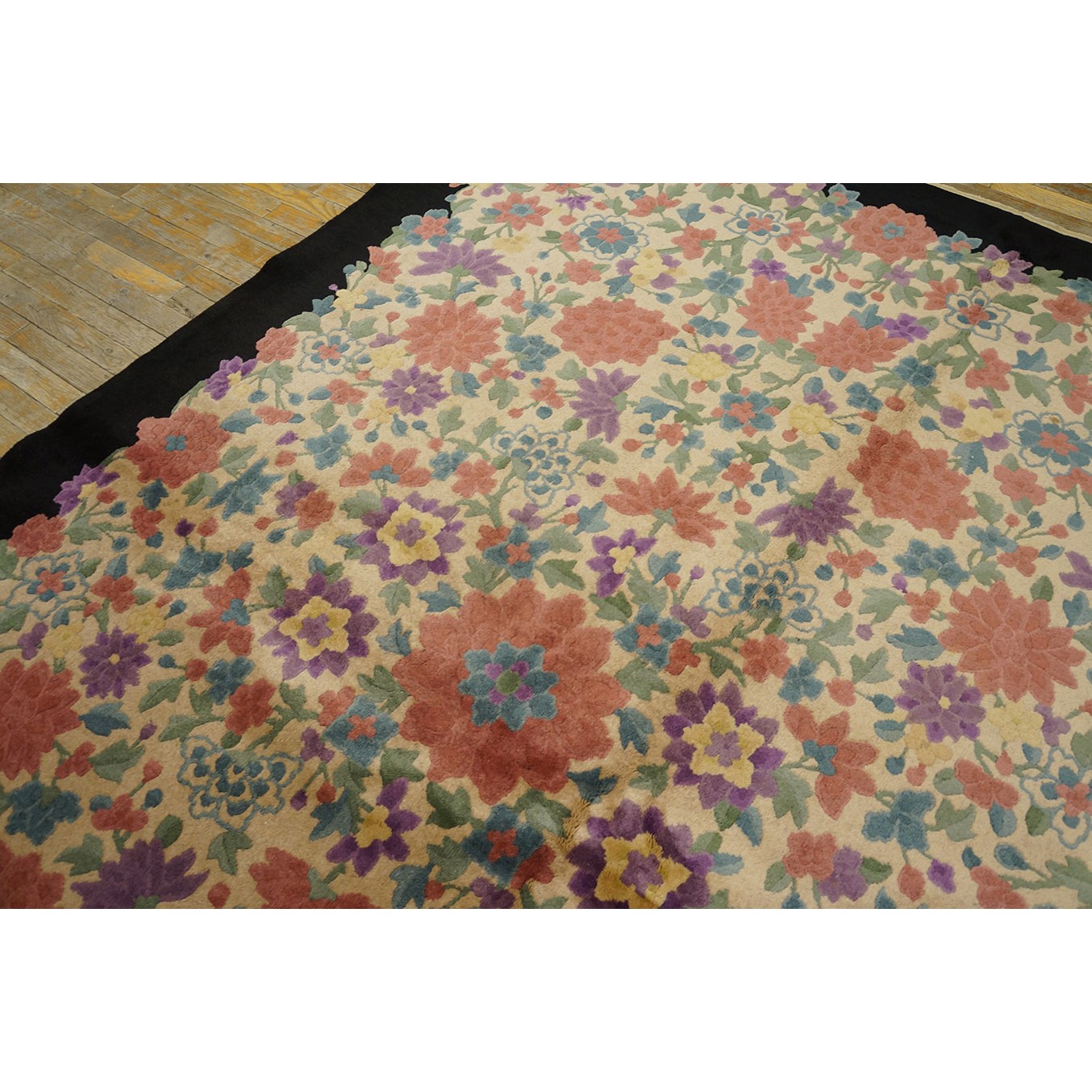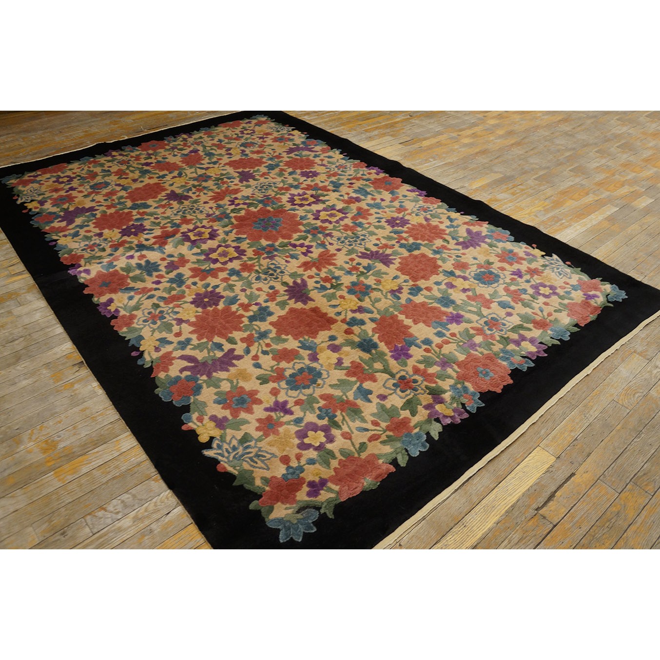 DescriptionChineseCarpets made in China proper. See entries Ningshia, Peking, Art Deco. Chinese - Art DecoAs the name implies, pieces woven between the wars for the Western market by mostly American owned firms especially Nichols and Fette, in thick heavy weaves using strong colors, asymmetric patterns and downplaying the Chinese-ness of the carpet. Nichols rugs are more strong toned than the pastel Fette. Most were woven in the coastal port city of Tientsin. Other lesser known workshops were also active. Some pieces are ultra-geometric and haute-Deco moderne in character: these are very rare. More frequent are pieces with bits of Chinese ornament: vases or other precious objects, paeonies, vines, fences, etc. Most common is the 9 x 12 size, in colors never found in mainstream Chinese rugs: backgrounds in black, mauve, purple, hot pink, orange, olive, employing the best synthetic chrome dyes of the period. Prices are still reasonable and carpets in top condition are available. | |