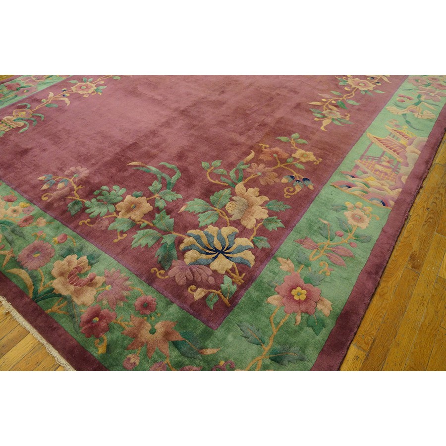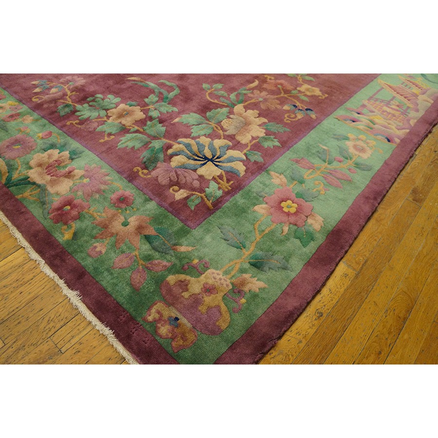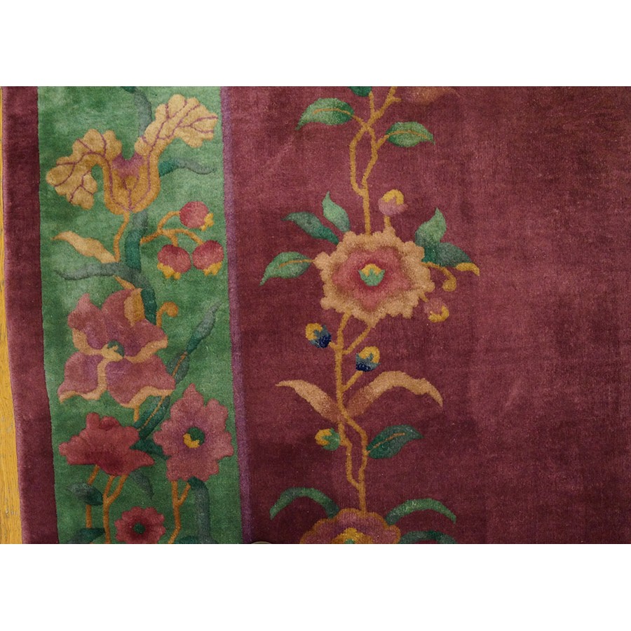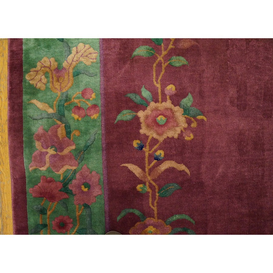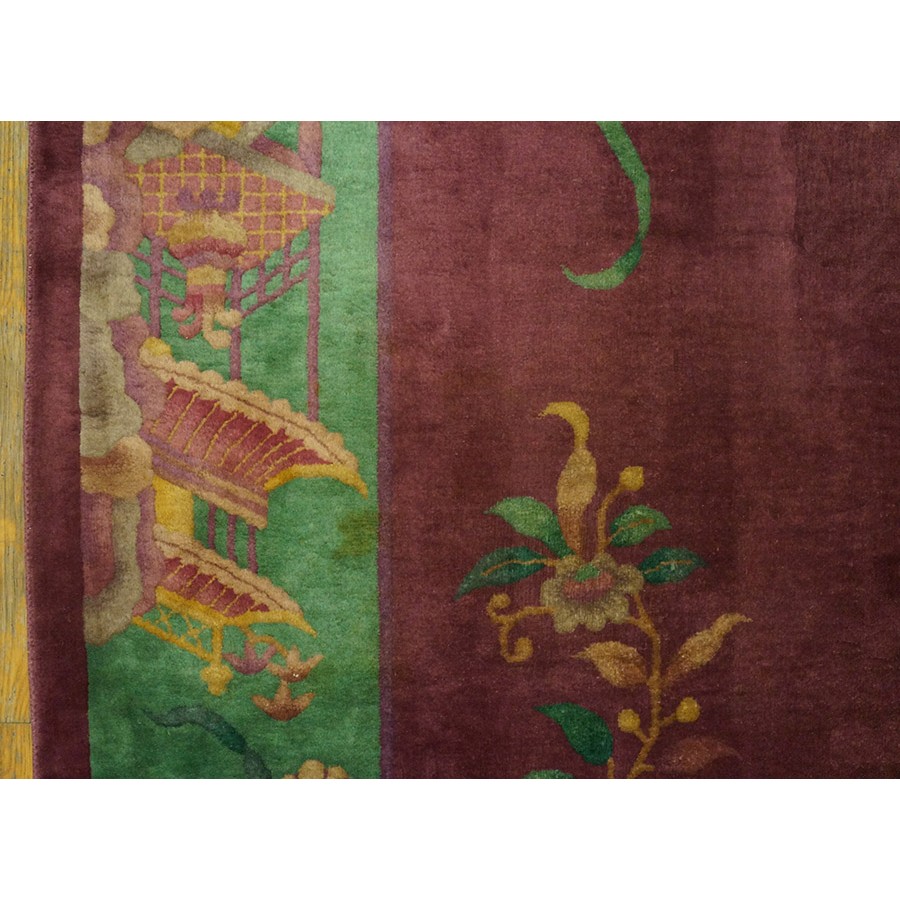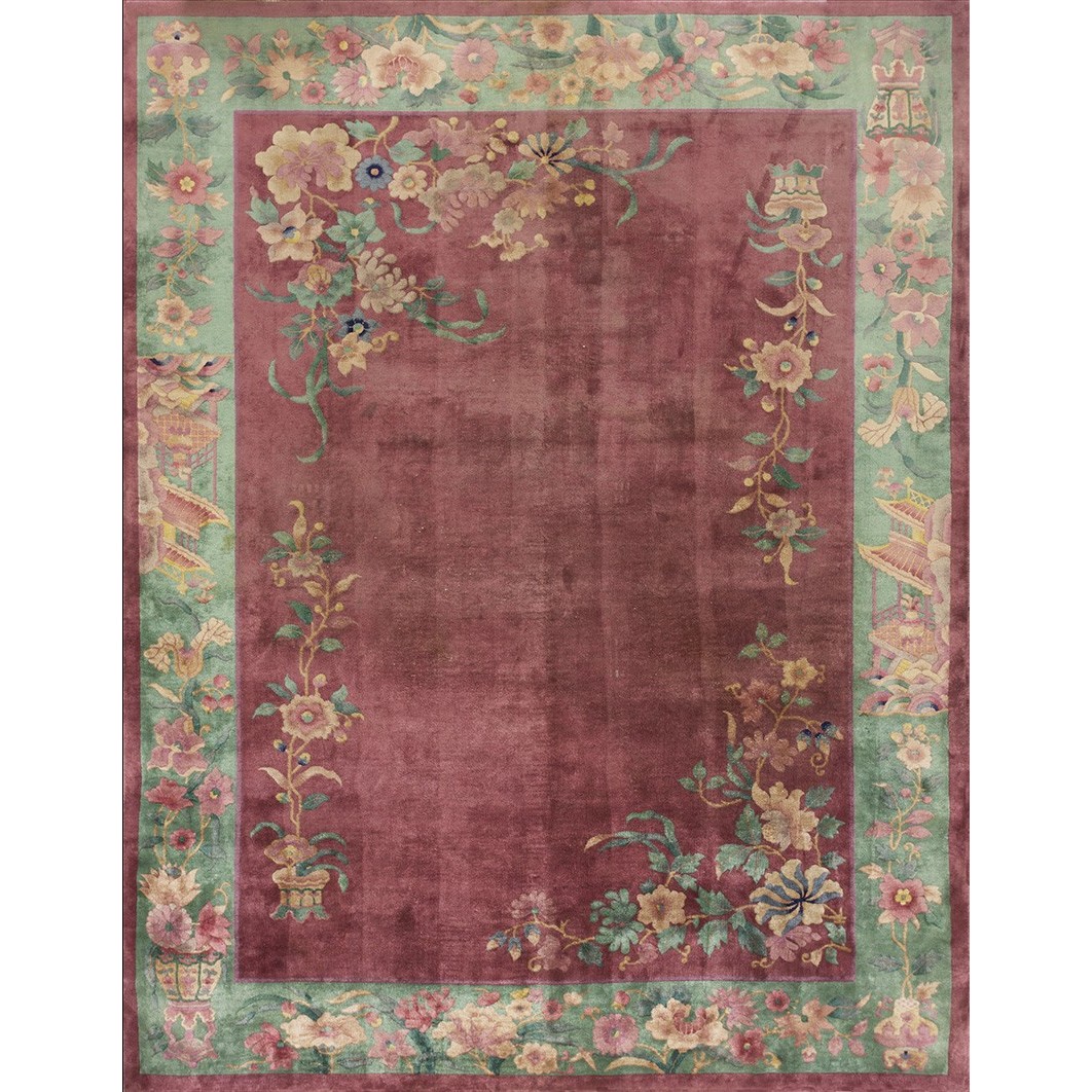 DescriptionChineseCarpets made in China proper. See entries Ningshia, Peking, Art Deco. Chinese - Art DecoAs the name implies, pieces woven between the wars for the Western market by mostly American owned firms especially Nichols and Fette, in thick heavy weaves using strong colors, asymmetric patterns and downplaying the Chinese-ness of the carpet. Nichols rugs are more strong toned than the pastel Fette. Most were woven in the coastal port city of Tientsin. Other lesser known workshops were also active. Some pieces are ultra-geometric and haute-Deco moderne in character: these are very rare. More frequent are pieces with bits of Chinese ornament: vases or other precious objects, paeonies, vines, fences, etc. Most common is the 9 x 12 size, in colors never found in mainstream Chinese rugs: backgrounds in black, mauve, purple, hot pink, orange, olive, employing the best synthetic chrome dyes of the period. Prices are still reasonable and carpets in top condition are available. | |
