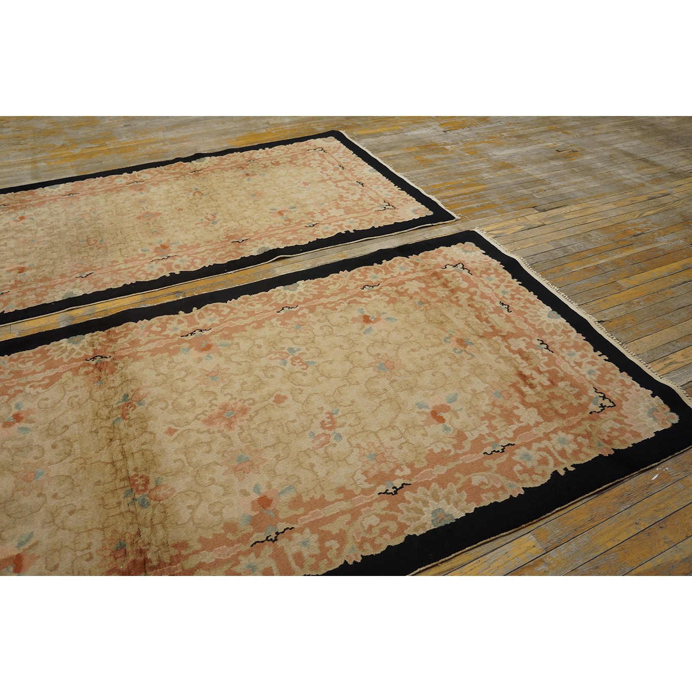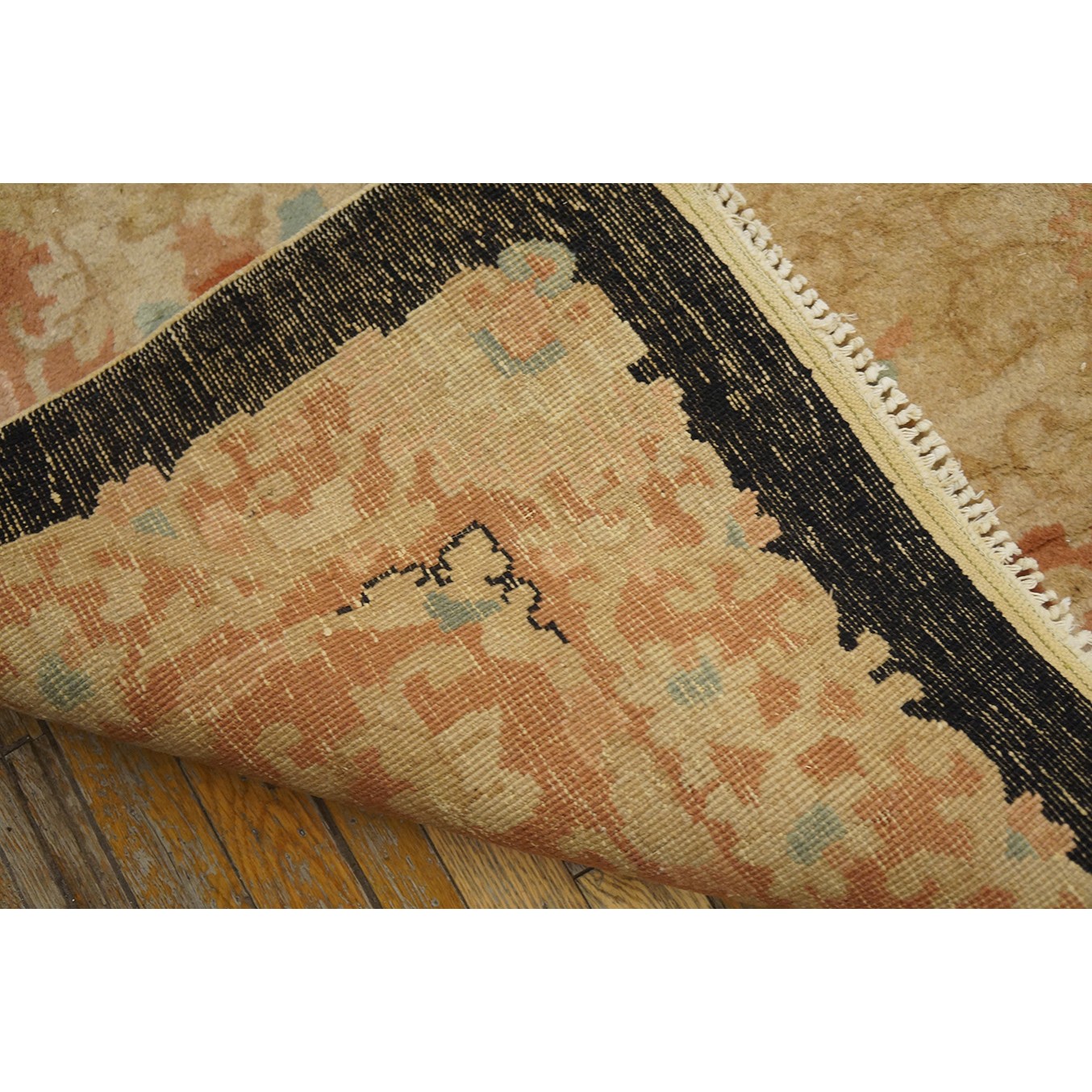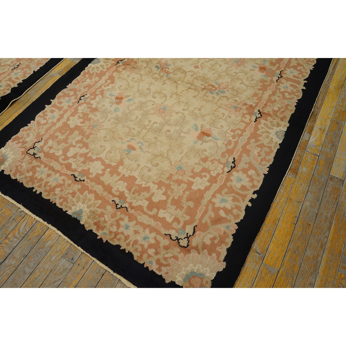 DescriptionChineseCarpets made in China proper. See entries Ningshia, Peking, Art Deco. Chinese - Art DecoAs the name implies, pieces woven between the wars for the Western market by mostly American owned firms especially Nichols and Fette, in thick heavy weaves using strong colors, asymmetric patterns and downplaying the Chinese-ness of the carpet. Nichols rugs are more strong toned than the pastel Fette. Most were woven in the coastal port city of Tientsin. Other lesser known workshops were also active. Some pieces are ultra-geometric and haute-Deco moderne in character: these are very rare. More frequent are pieces with bits of Chinese ornament: vases or other precious objects, paeonies, vines, fences, etc. Most common is the 9 x 12 size, in colors never found in mainstream Chinese rugs: backgrounds in black, mauve, purple, hot pink, orange, olive, employing the best synthetic chrome dyes of the period. Prices are still reasonable and carpets in top condition are available. | |