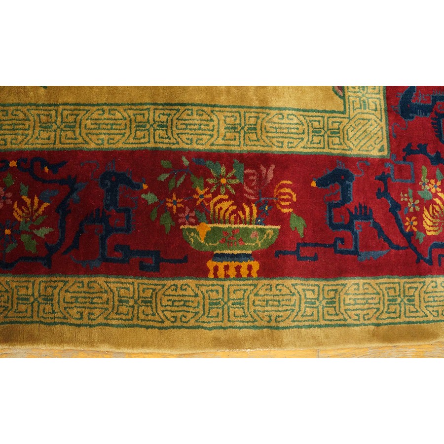 DescriptionChineseCarpets made in China proper. See entries Ningshia, Peking, Art Deco. Chinese - Art DecoAs the name implies, pieces woven between the wars for the Western market by mostly American owned firms especially Nichols and Fette, in thick heavy weaves using strong colors, asymmetric patterns and downplaying the Chinese-ness of the carpet. Nichols rugs are more strong toned than the pastel Fette. Most were woven in the coastal port city of Tientsin. Other lesser known workshops were also active. Some pieces are ultra-geometric and haute-Deco moderne in character: these are very rare. More frequent are pieces with bits of Chinese ornament: vases or other precious objects, paeonies, vines, fences, etc. Most common is the 9 x 12 size, in colors never found in mainstream Chinese rugs: backgrounds in black, mauve, purple, hot pink, orange, olive, employing the best synthetic chrome dyes of the period. Prices are still reasonable and carpets in top condition are available. | |