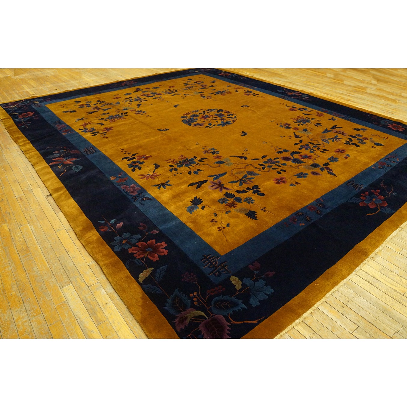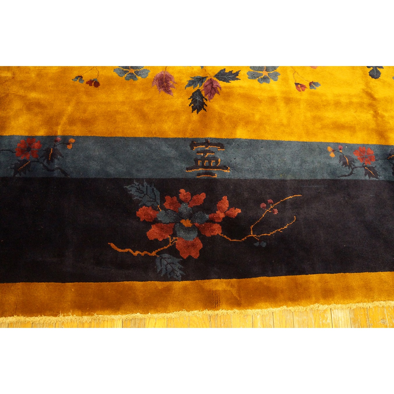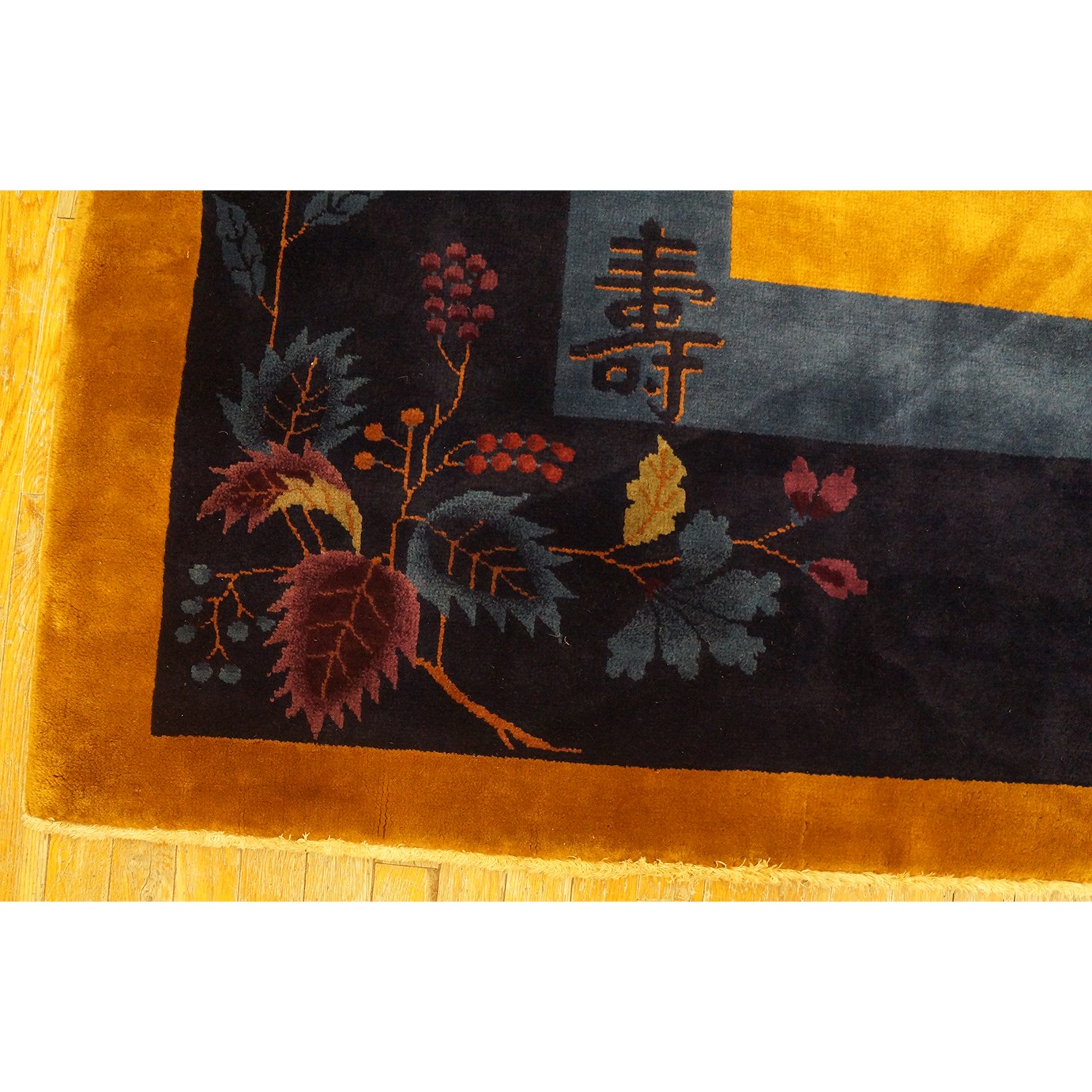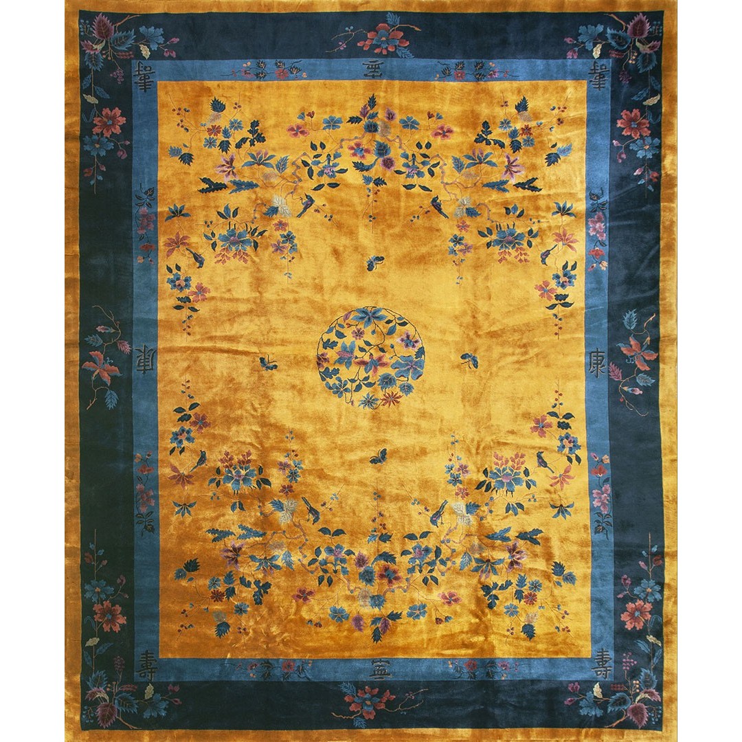 DescriptionChineseCarpets made in China proper. See entries Ningshia, Peking, Art Deco. Chinese - Art DecoAs the name implies, pieces woven between the wars for the Western market by mostly American owned firms especially Nichols and Fette, in thick heavy weaves using strong colors, asymmetric patterns and downplaying the Chinese-ness of the carpet. Nichols rugs are more strong toned than the pastel Fette. Most were woven in the coastal port city of Tientsin. Other lesser known workshops were also active. Some pieces are ultra-geometric and haute-Deco moderne in character: these are very rare. More frequent are pieces with bits of Chinese ornament: vases or other precious objects, paeonies, vines, fences, etc. Most common is the 9 x 12 size, in colors never found in mainstream Chinese rugs: backgrounds in black, mauve, purple, hot pink, orange, olive, employing the best synthetic chrome dyes of the period. Prices are still reasonable and carpets in top condition are available. | |