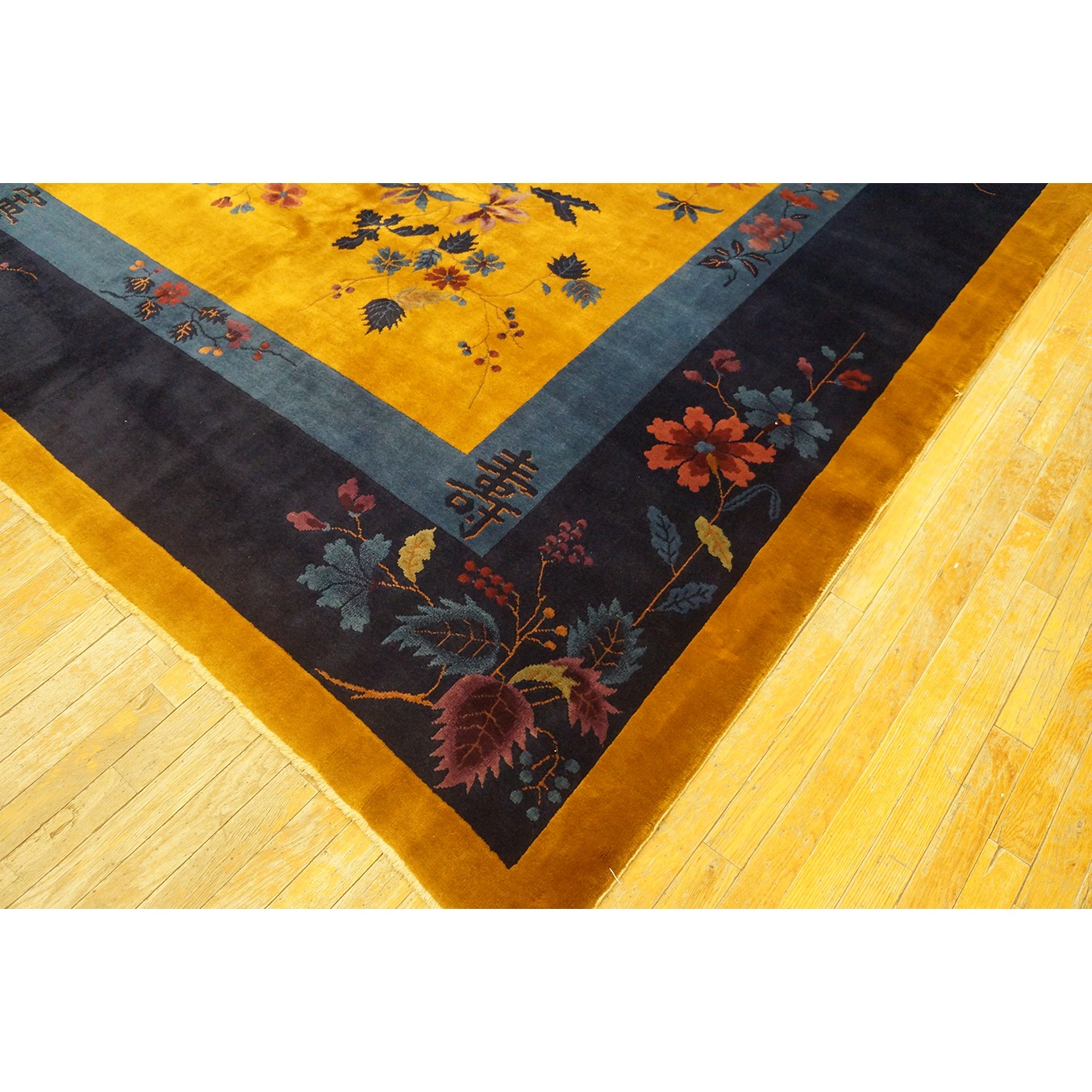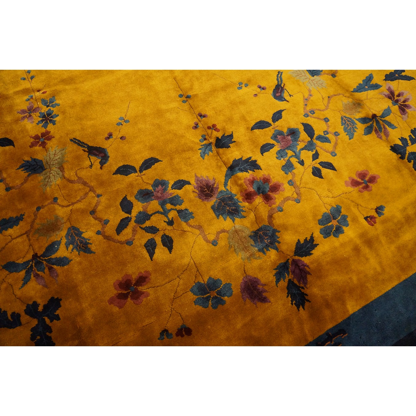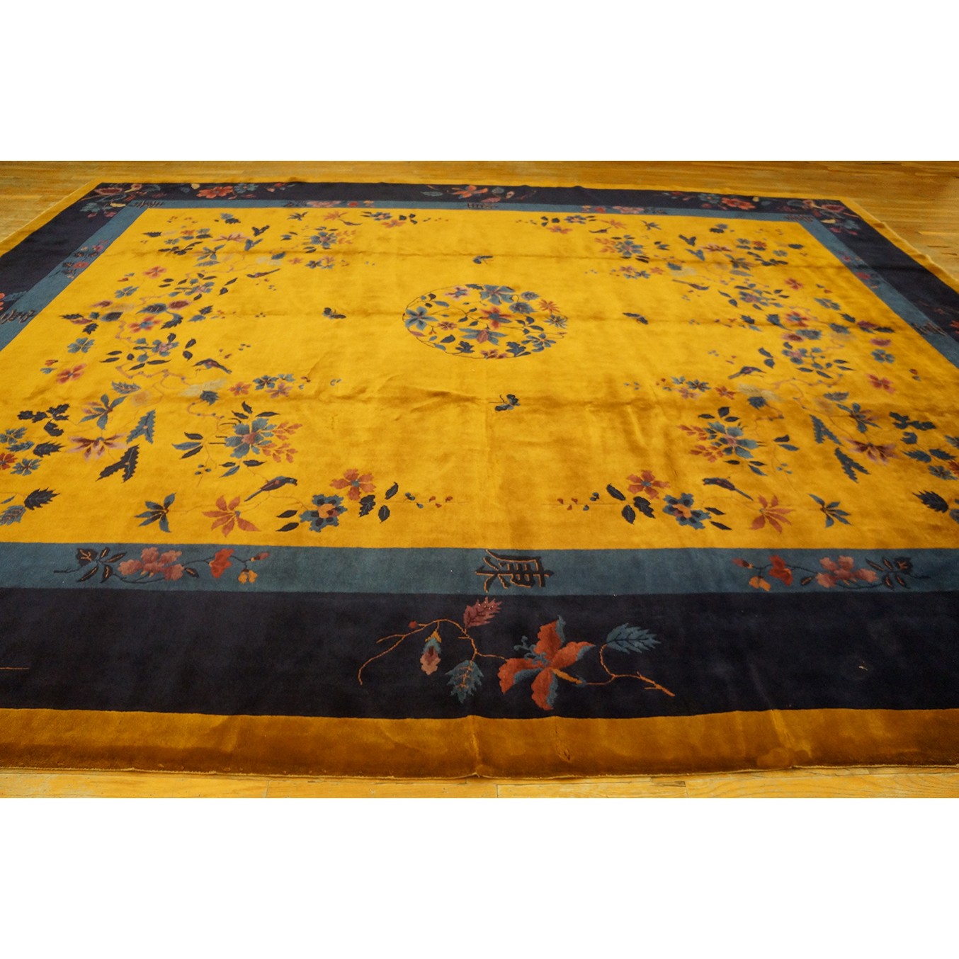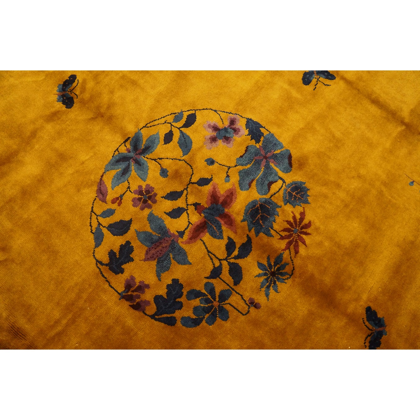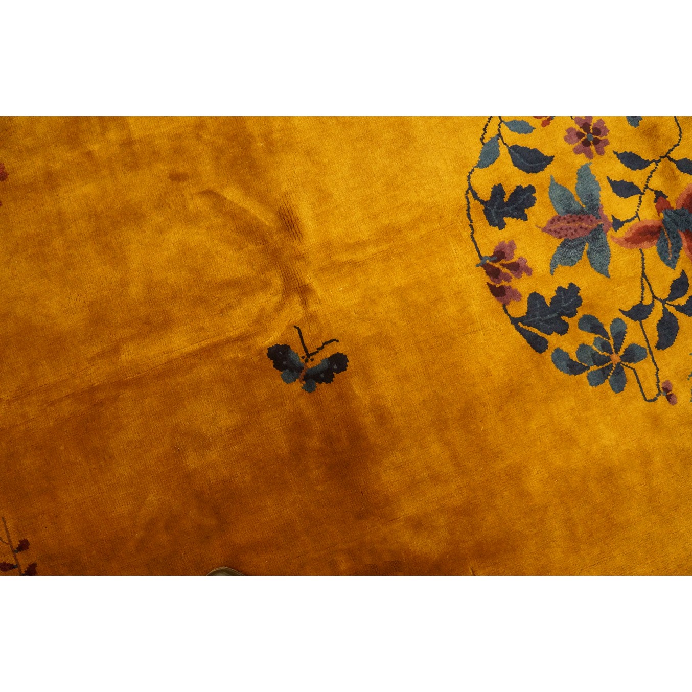 DescriptionChineseCarpets made in China proper. See entries Ningshia, Peking, Art Deco. Chinese - Art DecoAs the name implies, pieces woven between the wars for the Western market by mostly American owned firms especially Nichols and Fette, in thick heavy weaves using strong colors, asymmetric patterns and downplaying the Chinese-ness of the carpet. Nichols rugs are more strong toned than the pastel Fette. Most were woven in the coastal port city of Tientsin. Other lesser known workshops were also active. Some pieces are ultra-geometric and haute-Deco moderne in character: these are very rare. More frequent are pieces with bits of Chinese ornament: vases or other precious objects, paeonies, vines, fences, etc. Most common is the 9 x 12 size, in colors never found in mainstream Chinese rugs: backgrounds in black, mauve, purple, hot pink, orange, olive, employing the best synthetic chrome dyes of the period. Prices are still reasonable and carpets in top condition are available. | |
