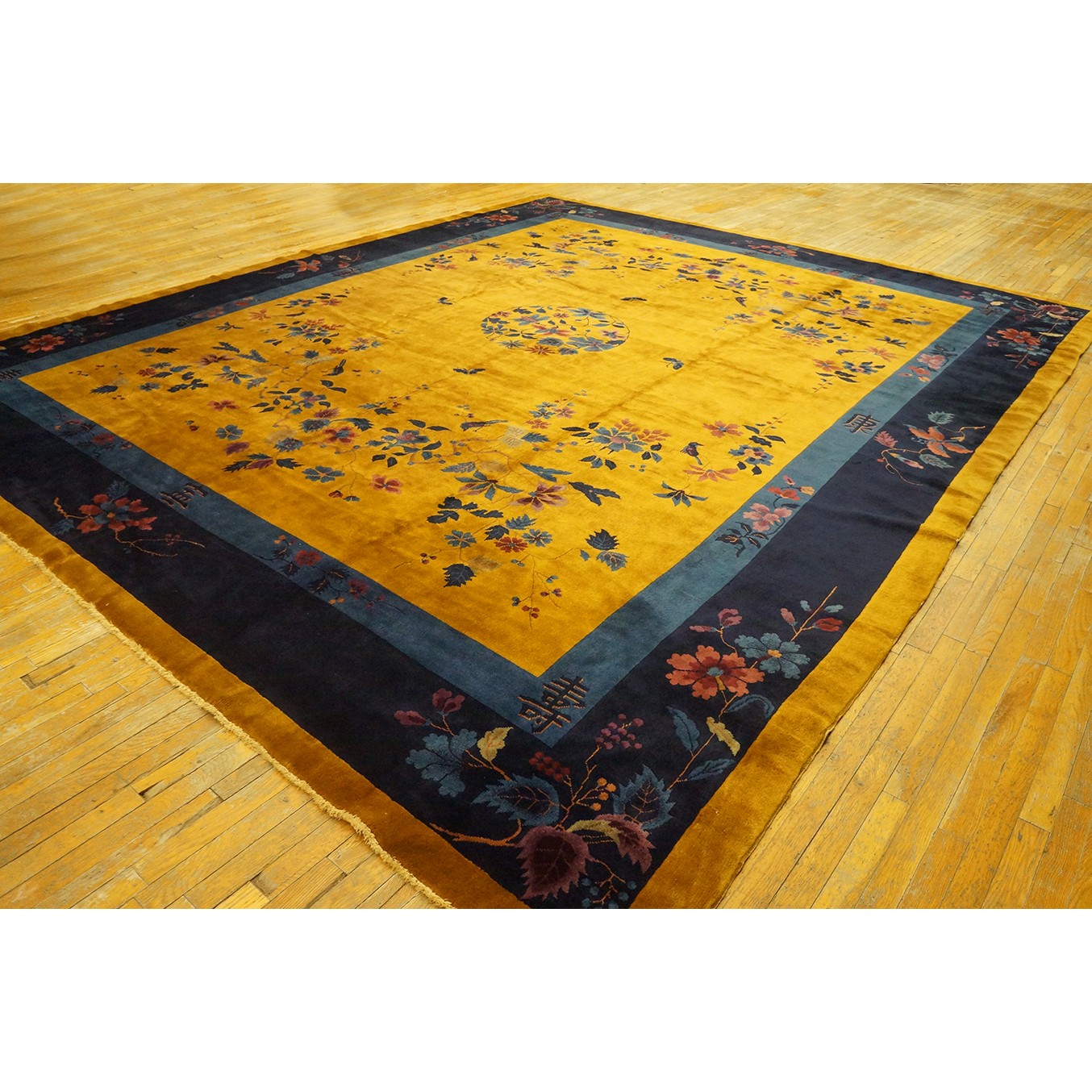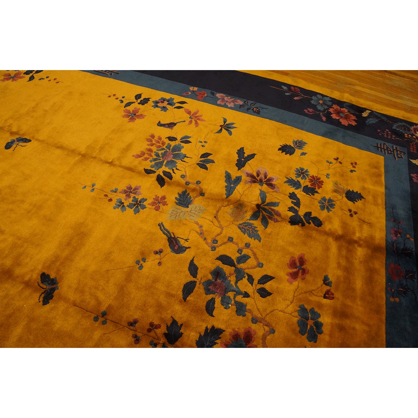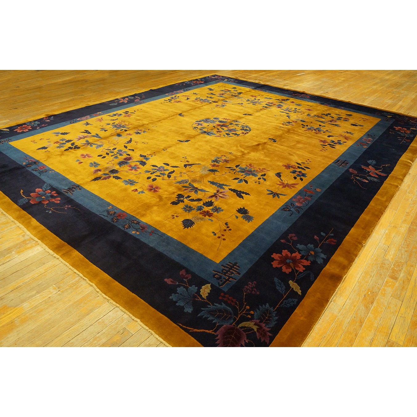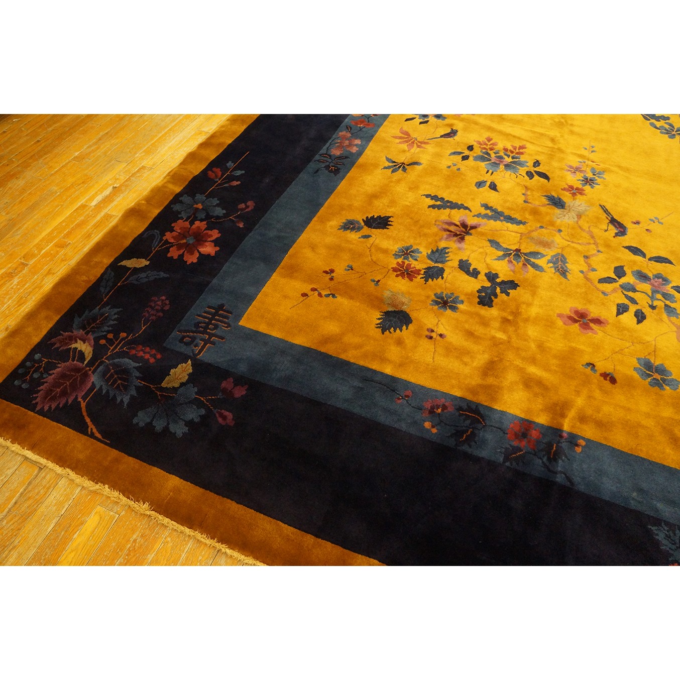 DescriptionChineseCarpets made in China proper. See entries Ningshia, Peking, Art Deco. Chinese - Art DecoAs the name implies, pieces woven between the wars for the Western market by mostly American owned firms especially Nichols and Fette, in thick heavy weaves using strong colors, asymmetric patterns and downplaying the Chinese-ness of the carpet. Nichols rugs are more strong toned than the pastel Fette. Most were woven in the coastal port city of Tientsin. Other lesser known workshops were also active. Some pieces are ultra-geometric and haute-Deco moderne in character: these are very rare. More frequent are pieces with bits of Chinese ornament: vases or other precious objects, paeonies, vines, fences, etc. Most common is the 9 x 12 size, in colors never found in mainstream Chinese rugs: backgrounds in black, mauve, purple, hot pink, orange, olive, employing the best synthetic chrome dyes of the period. Prices are still reasonable and carpets in top condition are available. | |