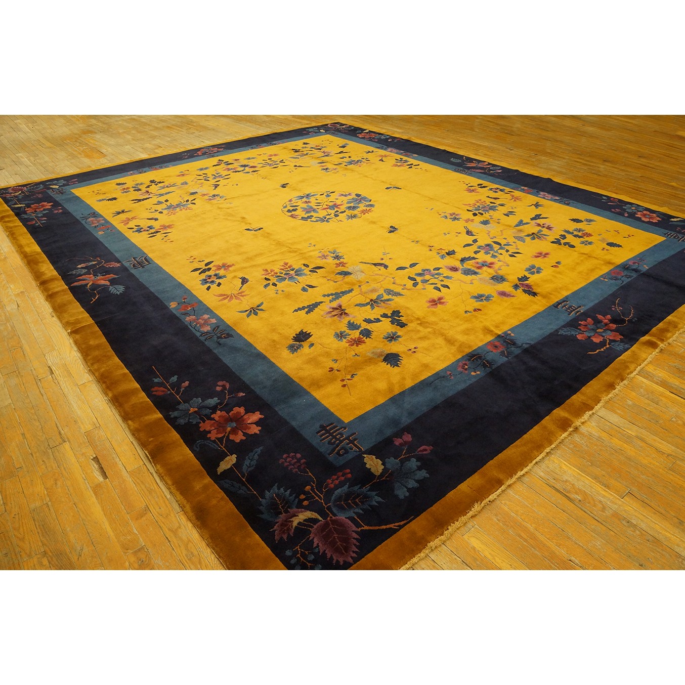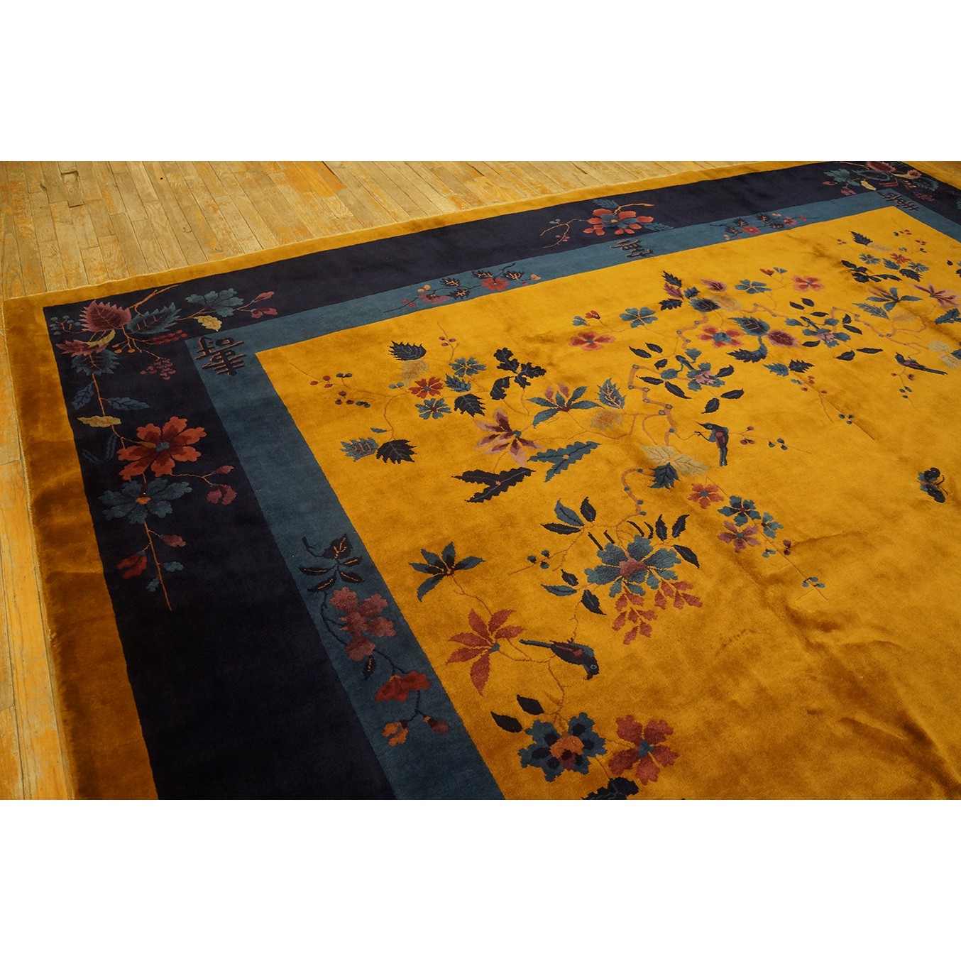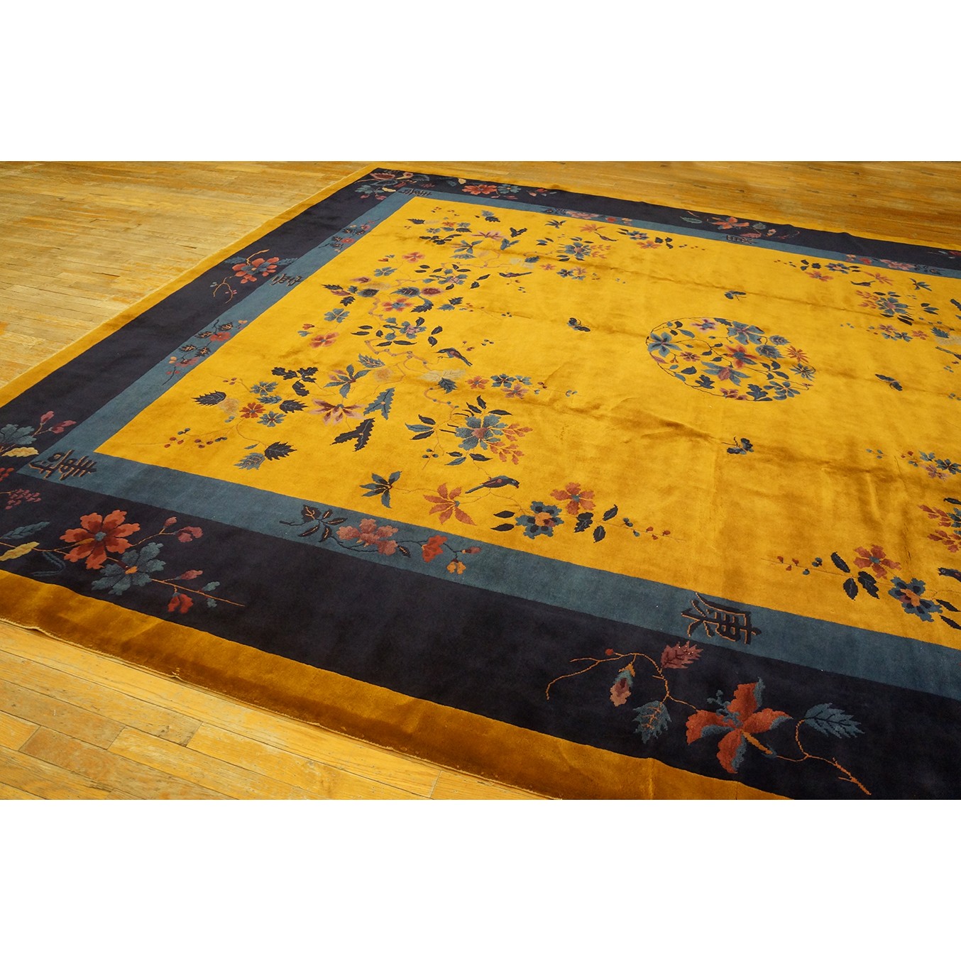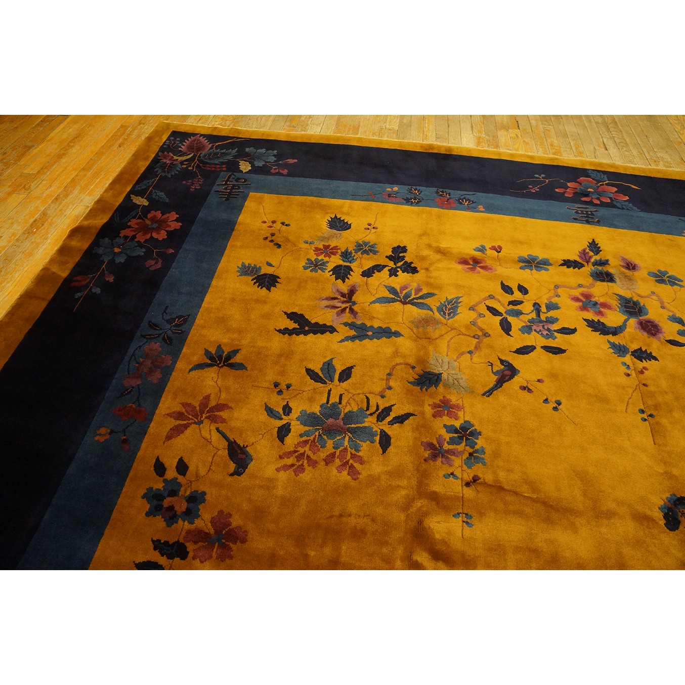 DescriptionChineseCarpets made in China proper. See entries Ningshia, Peking, Art Deco. Chinese - Art DecoAs the name implies, pieces woven between the wars for the Western market by mostly American owned firms especially Nichols and Fette, in thick heavy weaves using strong colors, asymmetric patterns and downplaying the Chinese-ness of the carpet. Nichols rugs are more strong toned than the pastel Fette. Most were woven in the coastal port city of Tientsin. Other lesser known workshops were also active. Some pieces are ultra-geometric and haute-Deco moderne in character: these are very rare. More frequent are pieces with bits of Chinese ornament: vases or other precious objects, paeonies, vines, fences, etc. Most common is the 9 x 12 size, in colors never found in mainstream Chinese rugs: backgrounds in black, mauve, purple, hot pink, orange, olive, employing the best synthetic chrome dyes of the period. Prices are still reasonable and carpets in top condition are available. | |