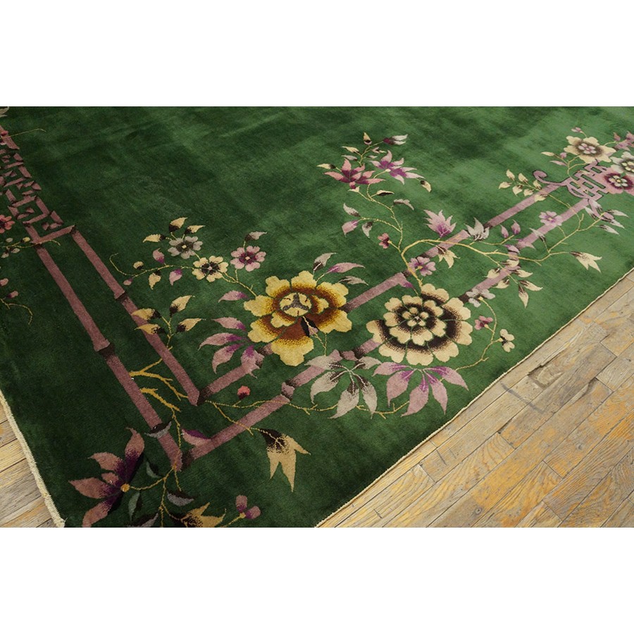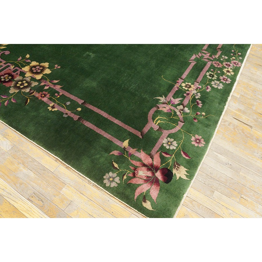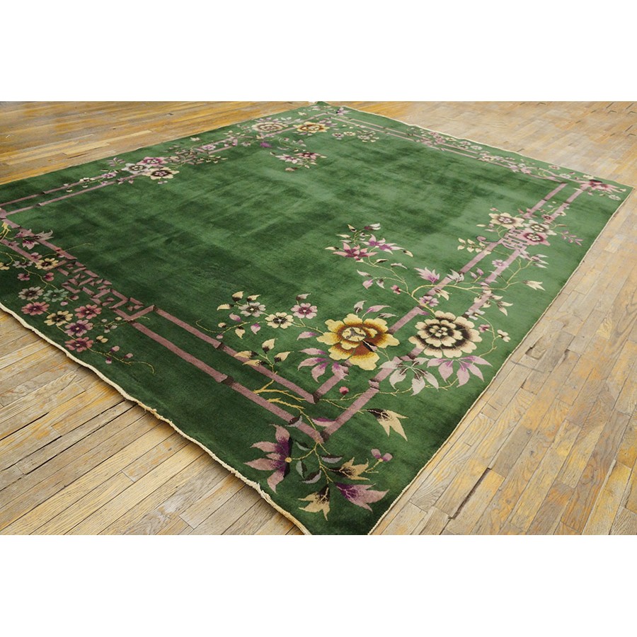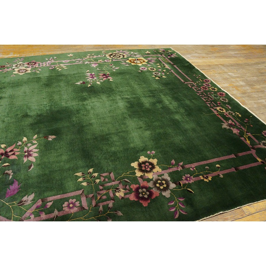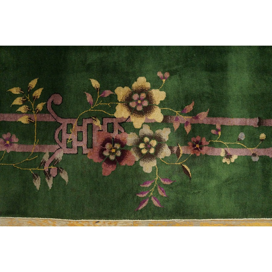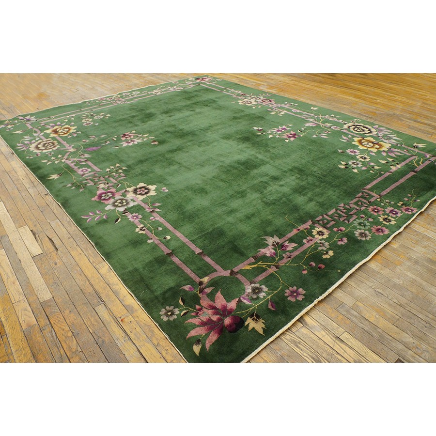 DescriptionChineseCarpets made in China proper. See entries Ningshia, Peking, Art Deco. Chinese - Art DecoAs the name implies, pieces woven between the wars for the Western market by mostly American owned firms especially Nichols and Fette, in thick heavy weaves using strong colors, asymmetric patterns and downplaying the Chinese-ness of the carpet. Nichols rugs are more strong toned than the pastel Fette. Most were woven in the coastal port city of Tientsin. Other lesser known workshops were also active. Some pieces are ultra-geometric and haute-Deco moderne in character: these are very rare. More frequent are pieces with bits of Chinese ornament: vases or other precious objects, paeonies, vines, fences, etc. Most common is the 9 x 12 size, in colors never found in mainstream Chinese rugs: backgrounds in black, mauve, purple, hot pink, orange, olive, employing the best synthetic chrome dyes of the period. Prices are still reasonable and carpets in top condition are available. | |