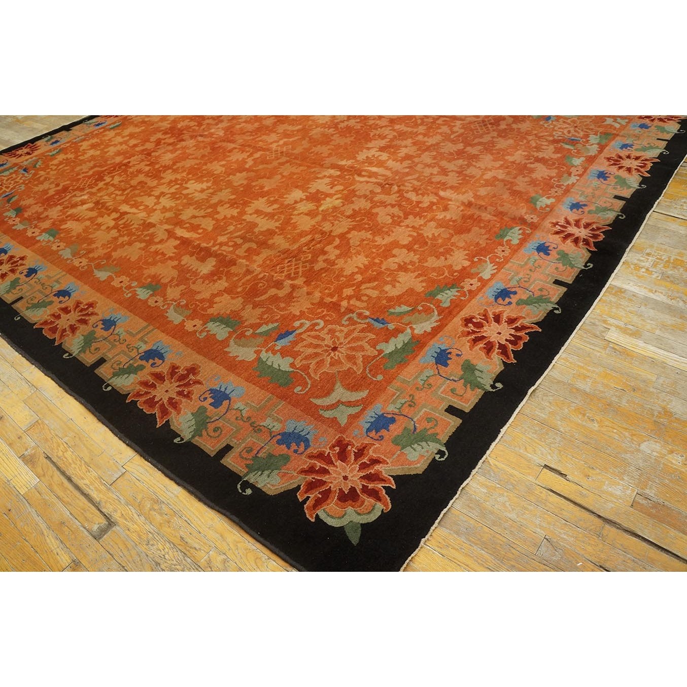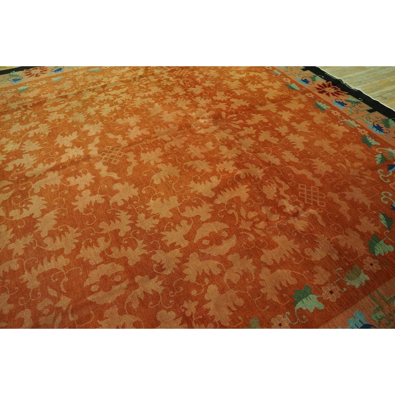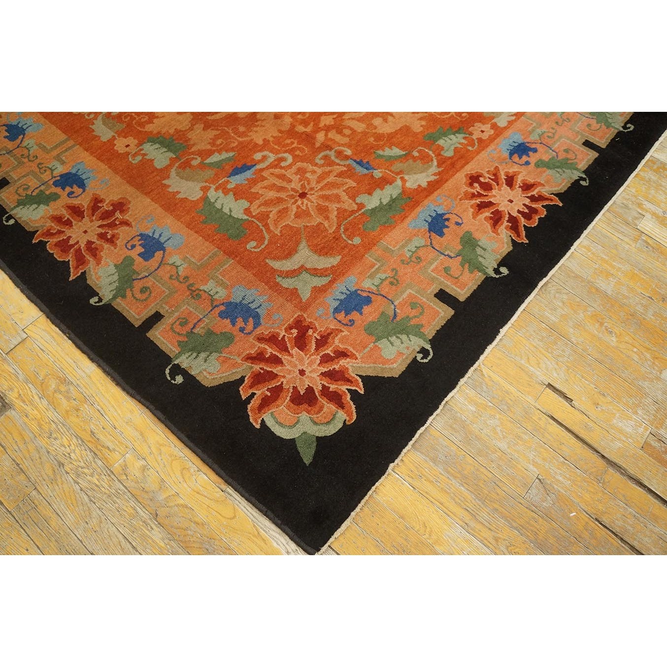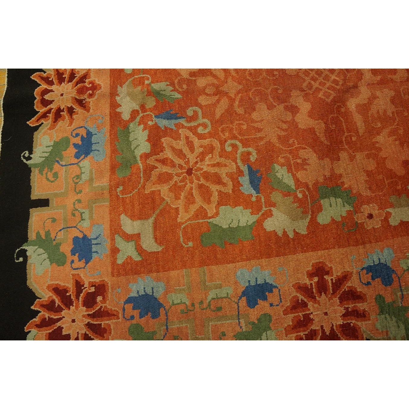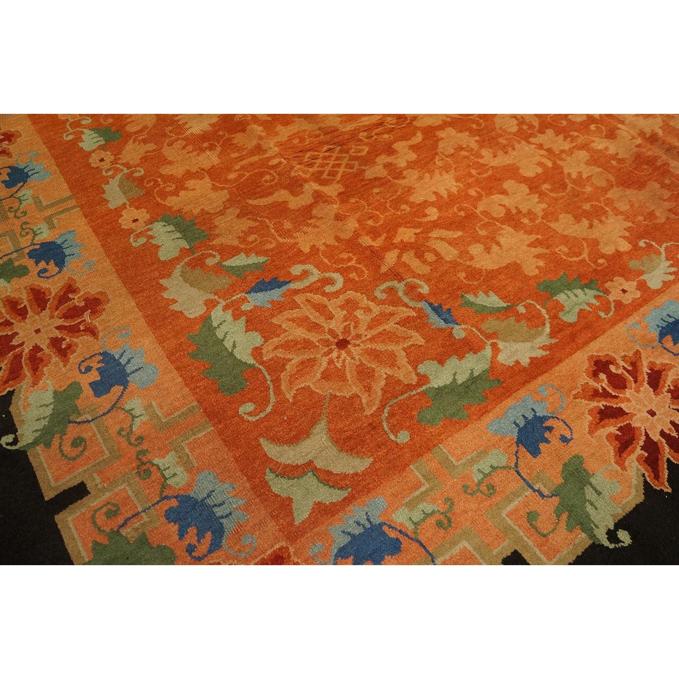 As the name implies, pieces woven between the wars for the Western market by mostly American owned firms especially Nichols and Fette, in thick heavy weaves using strong colors, asymmetric patterns and downplaying the Chinese-ness of the carpet. Nichols rugs are more strong toned than the pastel Fette. Most were woven in the coastal port city of Tientsin. Other lesser known workshops were also active. Some pieces are ultra-geometric and haute-Deco moderne in character: these are very rare. More frequent are pieces with bits of Chinese ornament: vases or other precious objects, paeonies, vines, fences, etc. Most common is the 9’ x 12’ size, in colors never found in mainstream Chinese rugs: backgrounds in black, mauve, purple, hot pink, orange, olive, employing the best synthetic chrome dyes of the period. Prices are still reasonable and carpets in top condition are available.