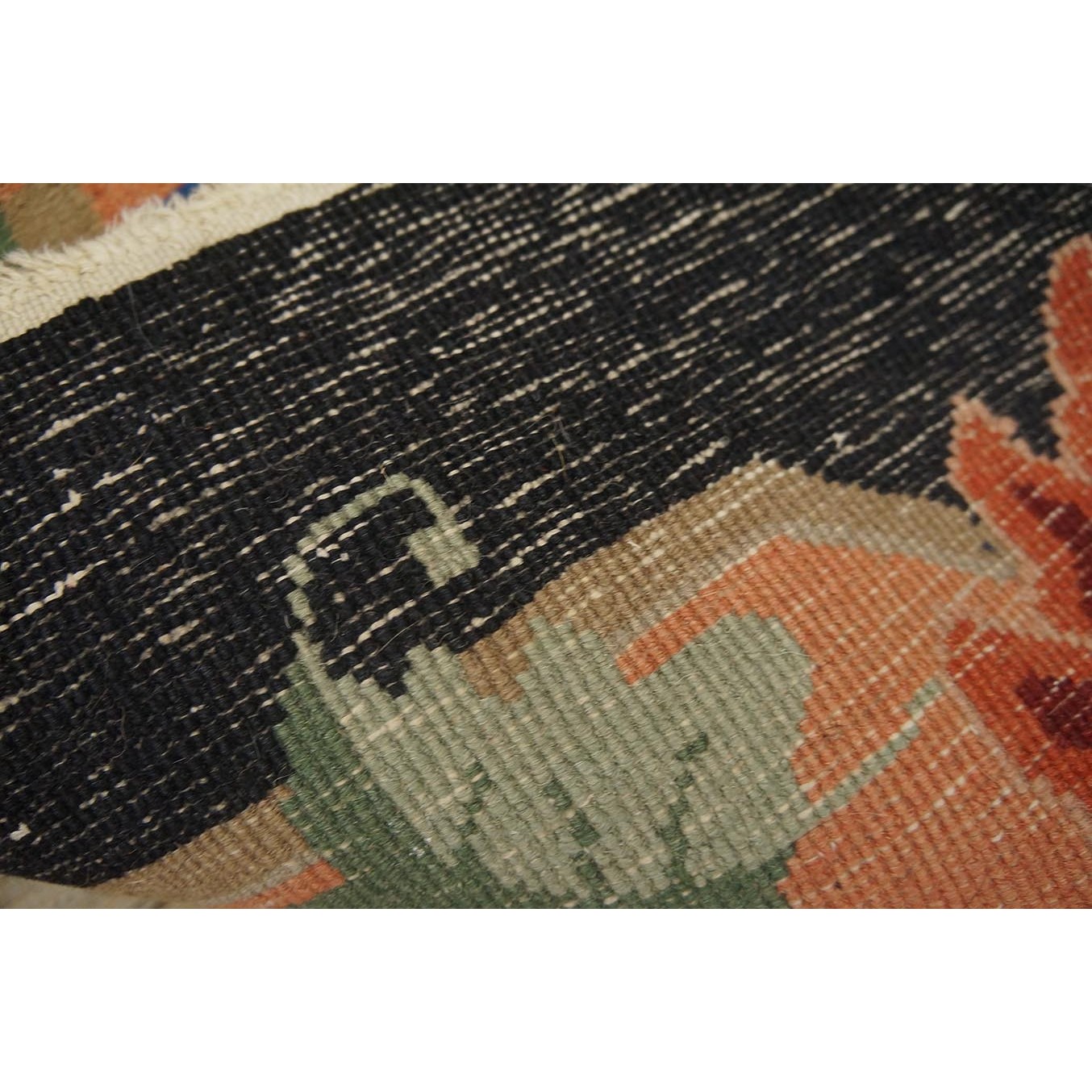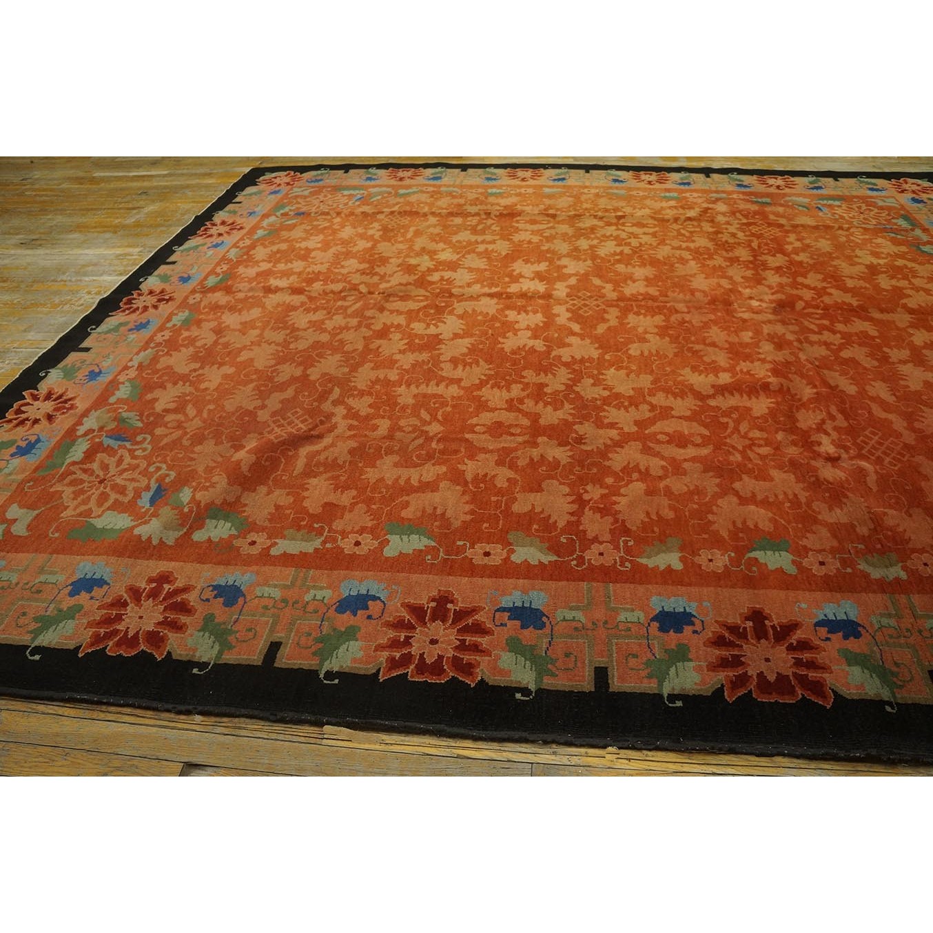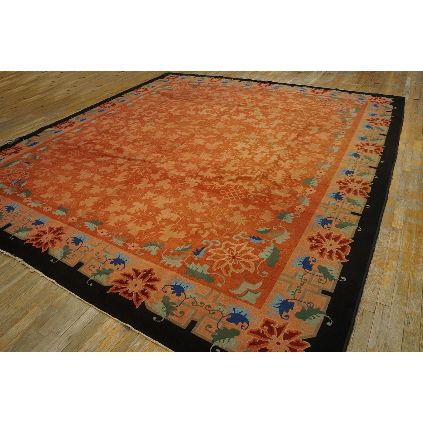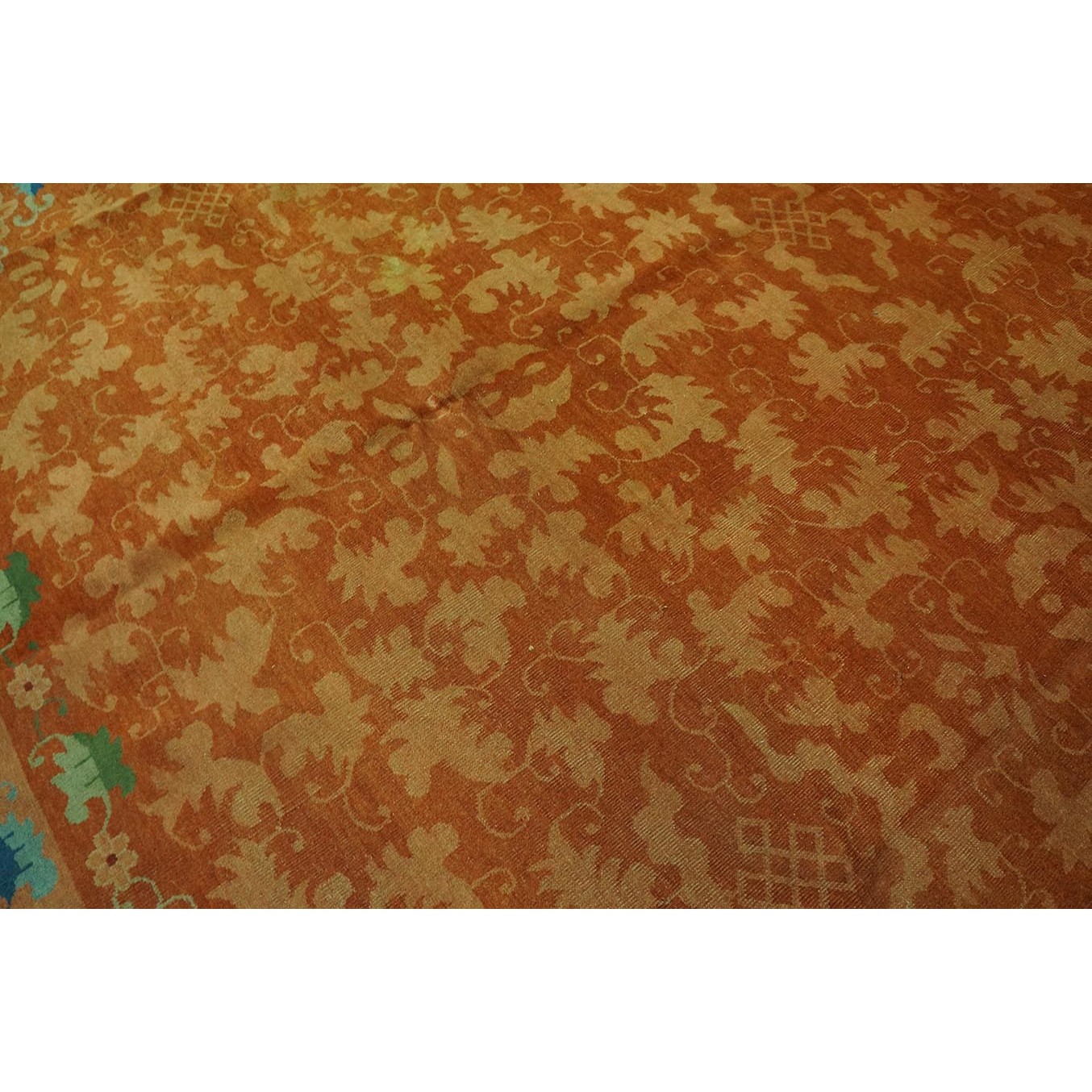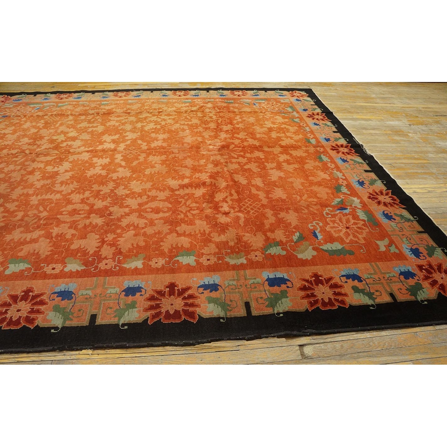 As the name implies, pieces woven between the wars for the Western market by mostly American owned firms especially Nichols and Fette, in thick heavy weaves using strong colors, asymmetric patterns and downplaying the Chinese-ness of the carpet. Nichols rugs are more strong toned than the pastel Fette. Most were woven in the coastal port city of Tientsin. Other lesser known workshops were also active. Some pieces are ultra-geometric and haute-Deco moderne in character: these are very rare. More frequent are pieces with bits of Chinese ornament: vases or other precious objects, paeonies, vines, fences, etc. Most common is the 9’ x 12’ size, in colors never found in mainstream Chinese rugs: backgrounds in black, mauve, purple, hot pink, orange, olive, employing the best synthetic chrome dyes of the period. Prices are still reasonable and carpets in top condition are available.