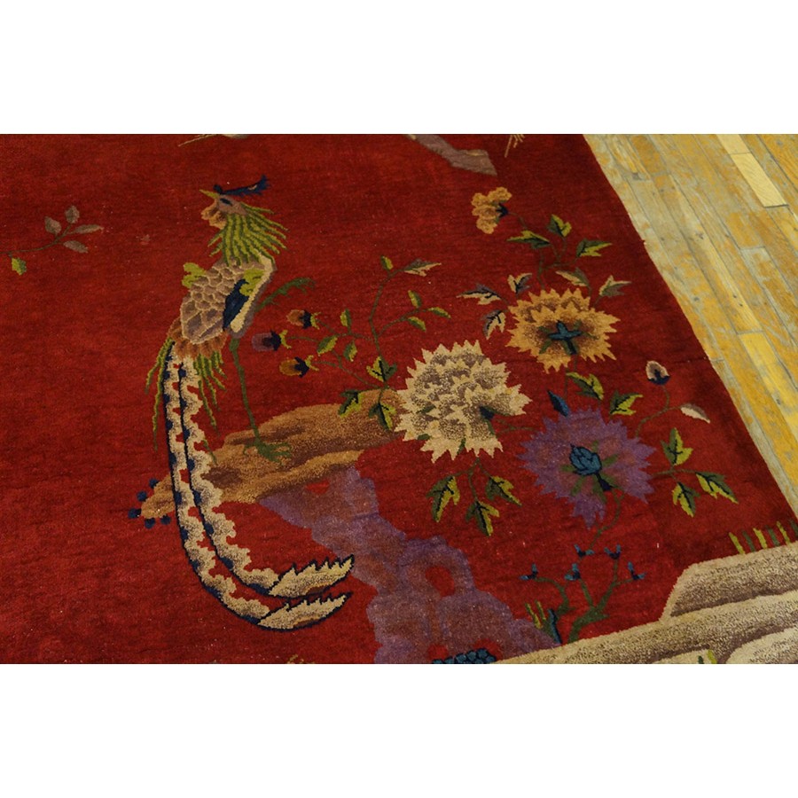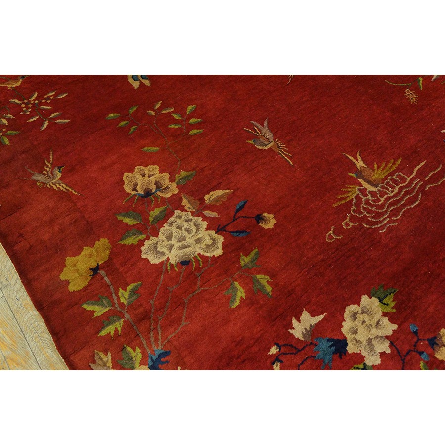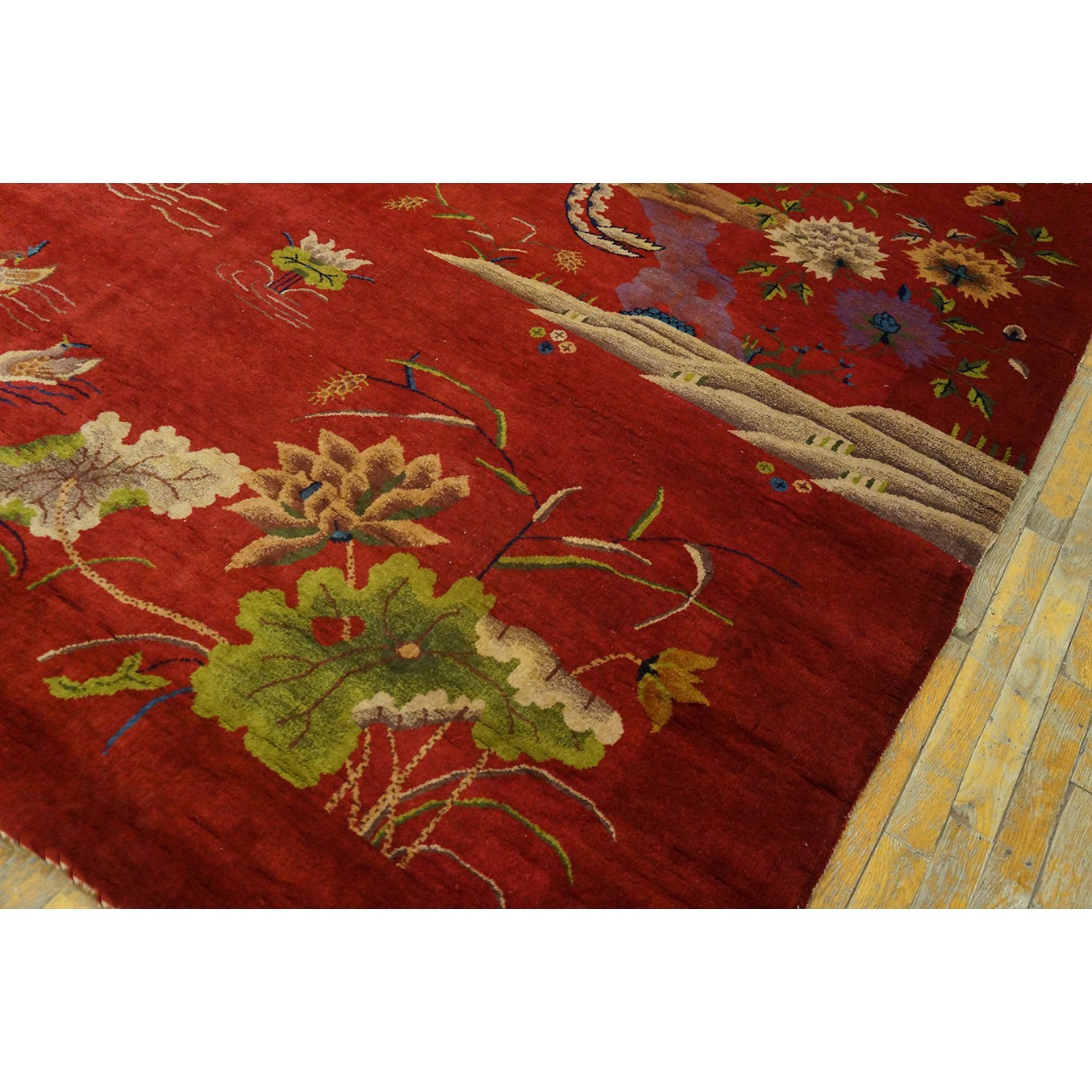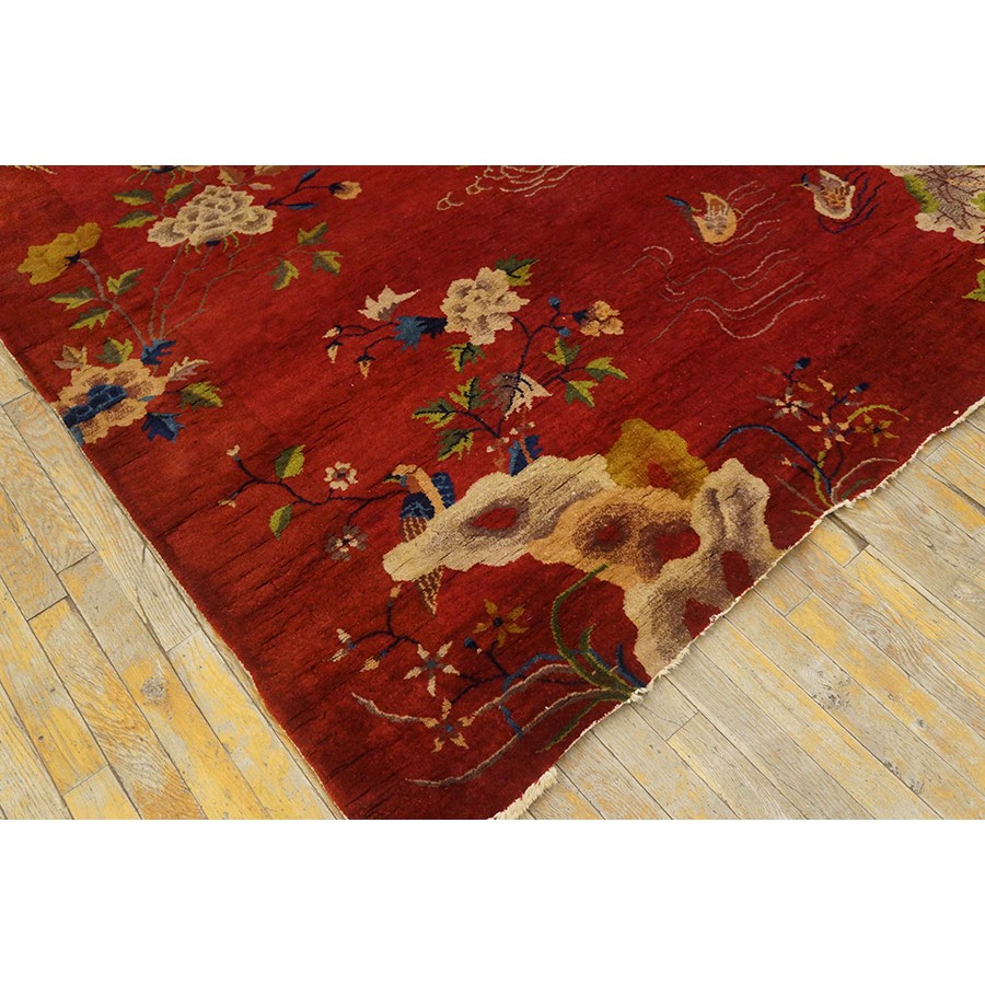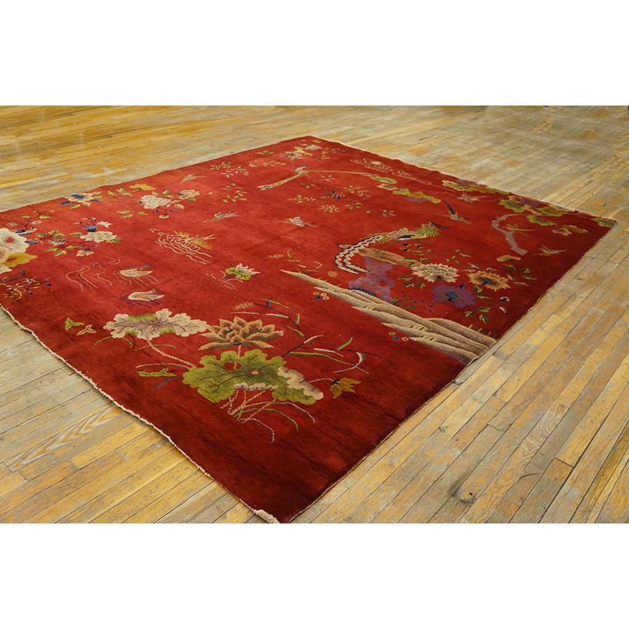 DescriptionChineseCarpets made in China proper. See entries Ningshia, Peking, Art Deco. Chinese - Art DecoAs the name implies, pieces woven between the wars for the Western market by mostly American owned firms especially Nichols and Fette, in thick heavy weaves using strong colors, asymmetric patterns and downplaying the Chinese-ness of the carpet. Nichols rugs are more strong toned than the pastel Fette. Most were woven in the coastal port city of Tientsin. Other lesser known workshops were also active. Some pieces are ultra-geometric and haute-Deco moderne in character: these are very rare. More frequent are pieces with bits of Chinese ornament: vases or other precious objects, paeonies, vines, fences, etc. Most common is the 9 x 12 size, in colors never found in mainstream Chinese rugs: backgrounds in black, mauve, purple, hot pink, orange, olive, employing the best synthetic chrome dyes of the period. Prices are still reasonable and carpets in top condition are available. | |