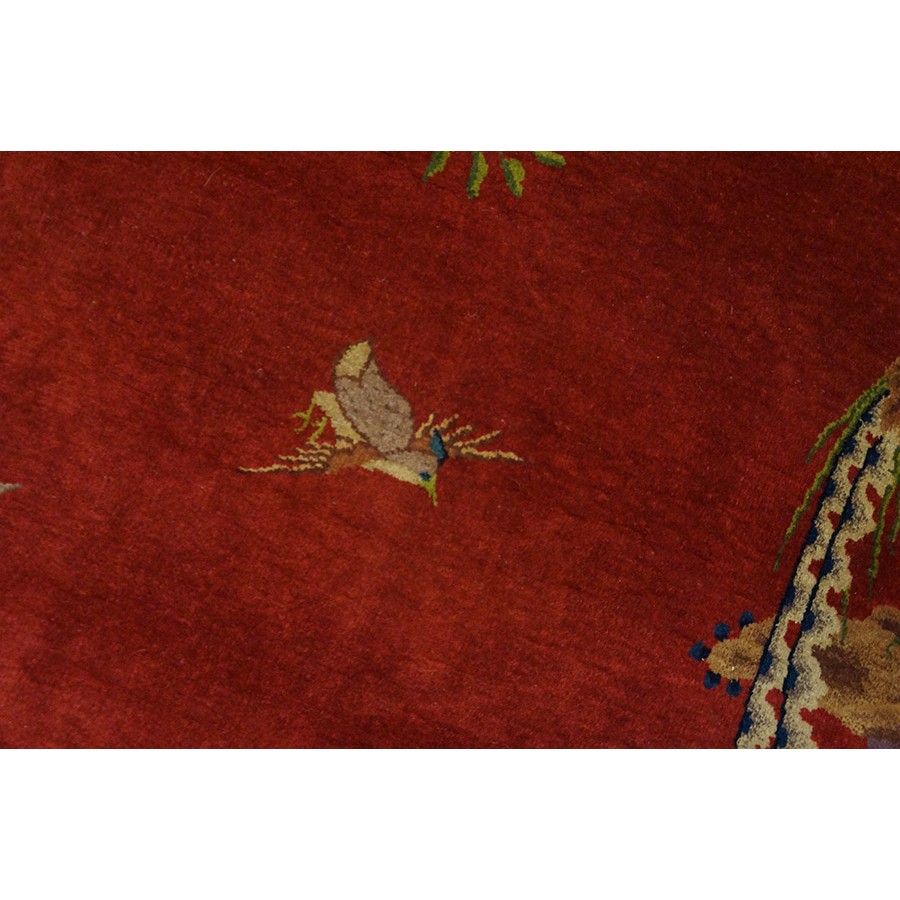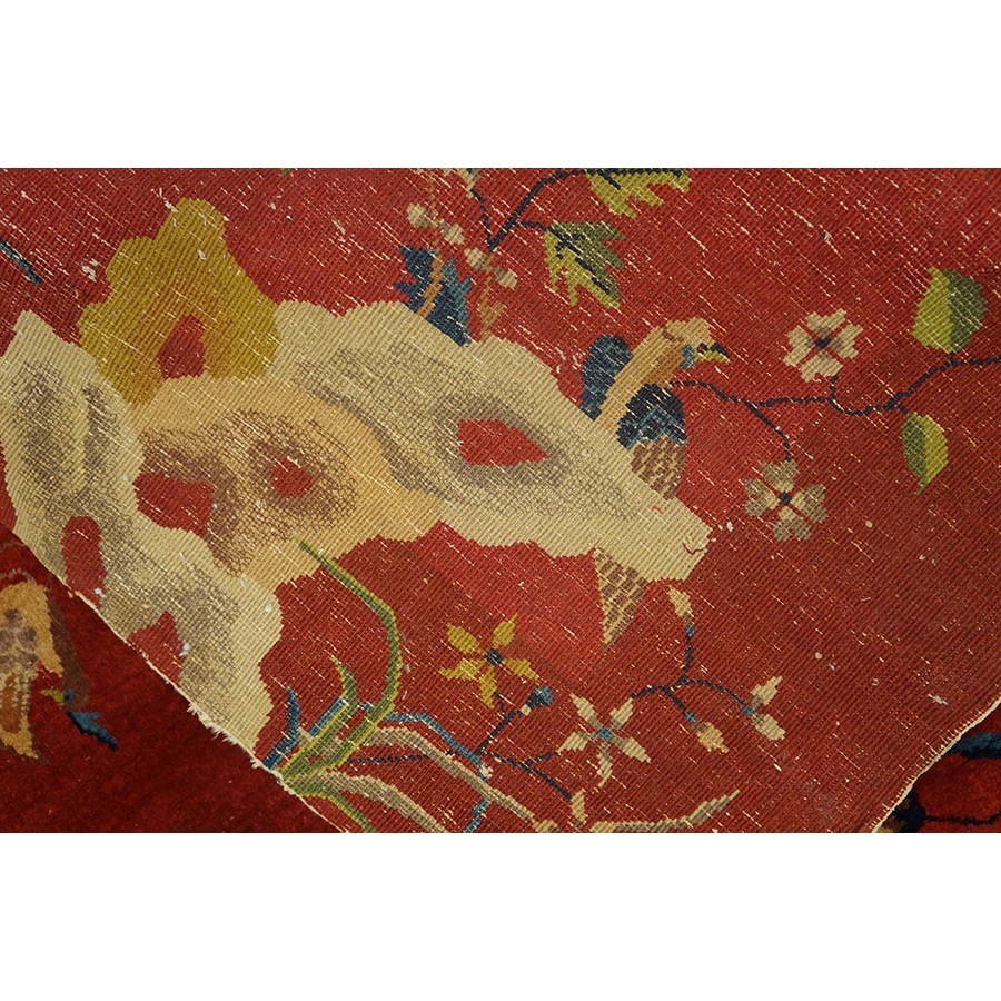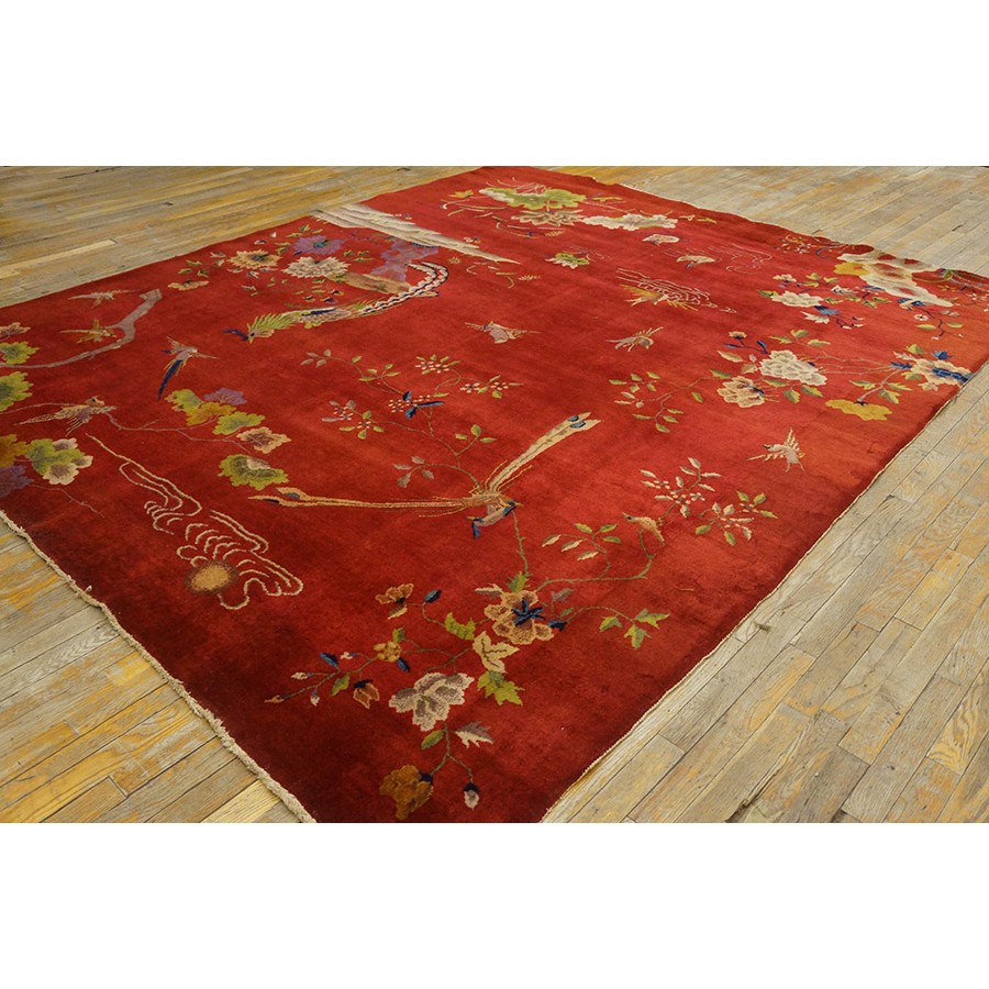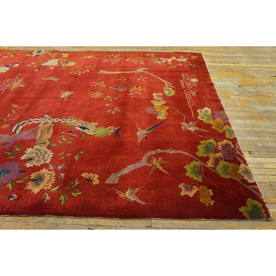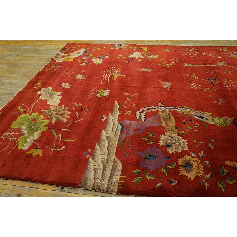 DescriptionChineseCarpets made in China proper. See entries Ningshia, Peking, Art Deco. Chinese - Art DecoAs the name implies, pieces woven between the wars for the Western market by mostly American owned firms especially Nichols and Fette, in thick heavy weaves using strong colors, asymmetric patterns and downplaying the Chinese-ness of the carpet. Nichols rugs are more strong toned than the pastel Fette. Most were woven in the coastal port city of Tientsin. Other lesser known workshops were also active. Some pieces are ultra-geometric and haute-Deco moderne in character: these are very rare. More frequent are pieces with bits of Chinese ornament: vases or other precious objects, paeonies, vines, fences, etc. Most common is the 9 x 12 size, in colors never found in mainstream Chinese rugs: backgrounds in black, mauve, purple, hot pink, orange, olive, employing the best synthetic chrome dyes of the period. Prices are still reasonable and carpets in top condition are available. | |
