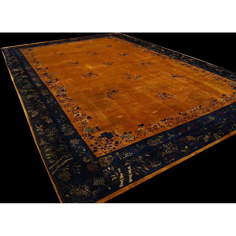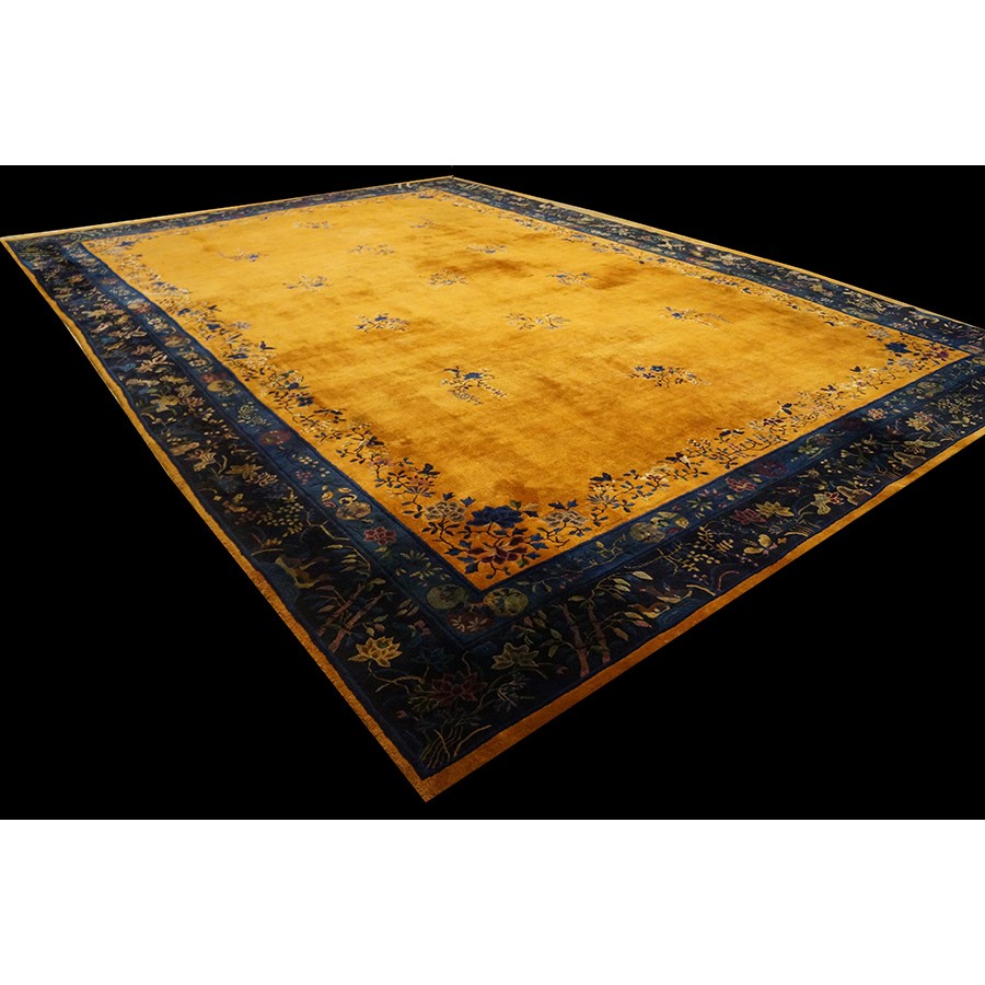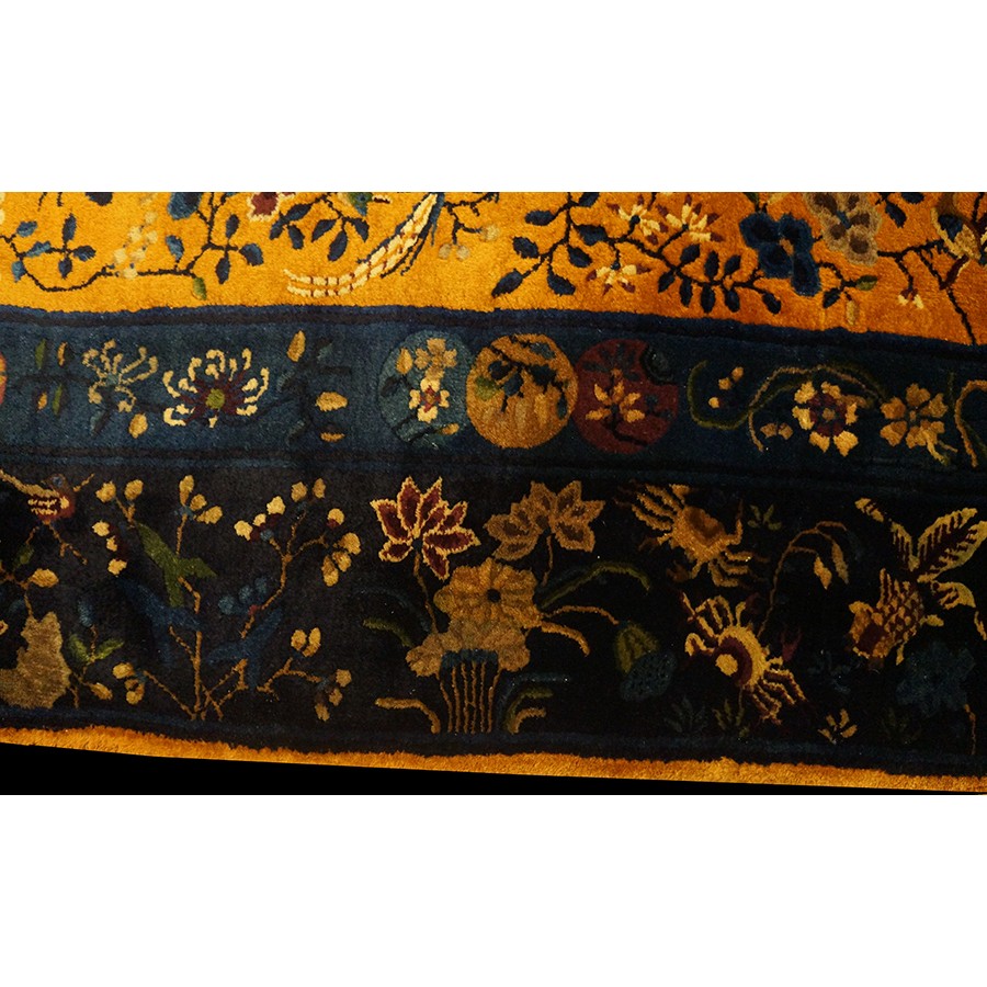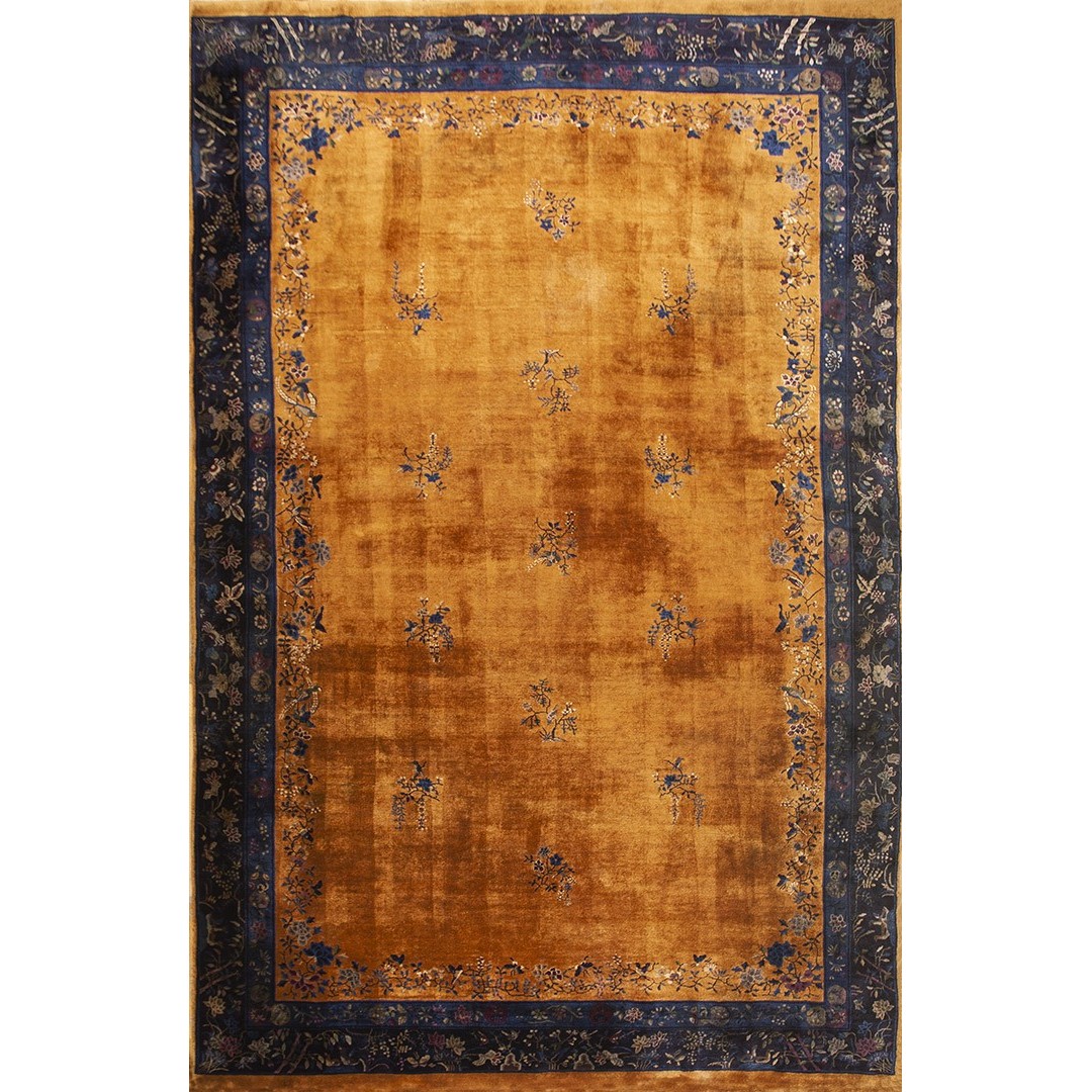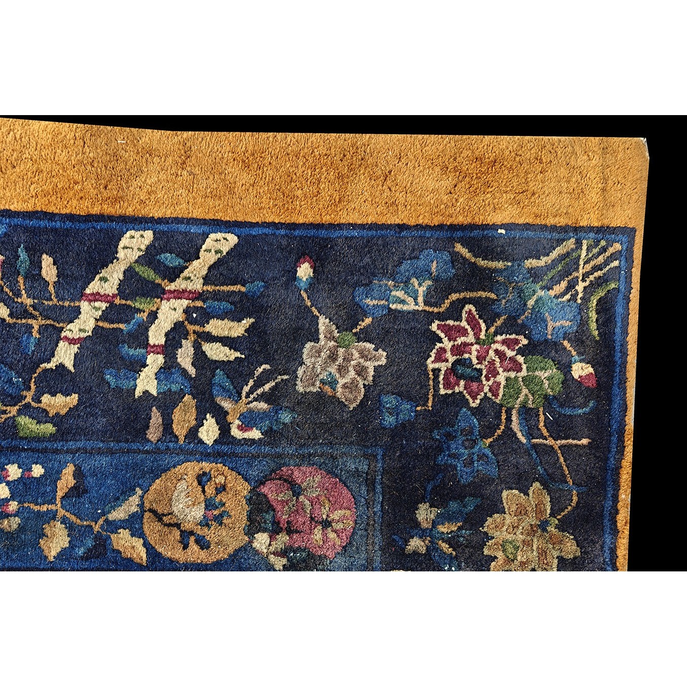 DescriptionChineseCarpets made in China proper. See entries Ningshia, Peking, Art Deco. Chinese - Art DecoAs the name implies, pieces woven between the wars for the Western market by mostly American owned firms especially Nichols and Fette, in thick heavy weaves using strong colors, asymmetric patterns and downplaying the Chinese-ness of the carpet. Nichols rugs are more strong toned than the pastel Fette. Most were woven in the coastal port city of Tientsin. Other lesser known workshops were also active. Some pieces are ultra-geometric and haute-Deco moderne in character: these are very rare. More frequent are pieces with bits of Chinese ornament: vases or other precious objects, paeonies, vines, fences, etc. Most common is the 9 x 12 size, in colors never found in mainstream Chinese rugs: backgrounds in black, mauve, purple, hot pink, orange, olive, employing the best synthetic chrome dyes of the period. Prices are still reasonable and carpets in top condition are available. | |