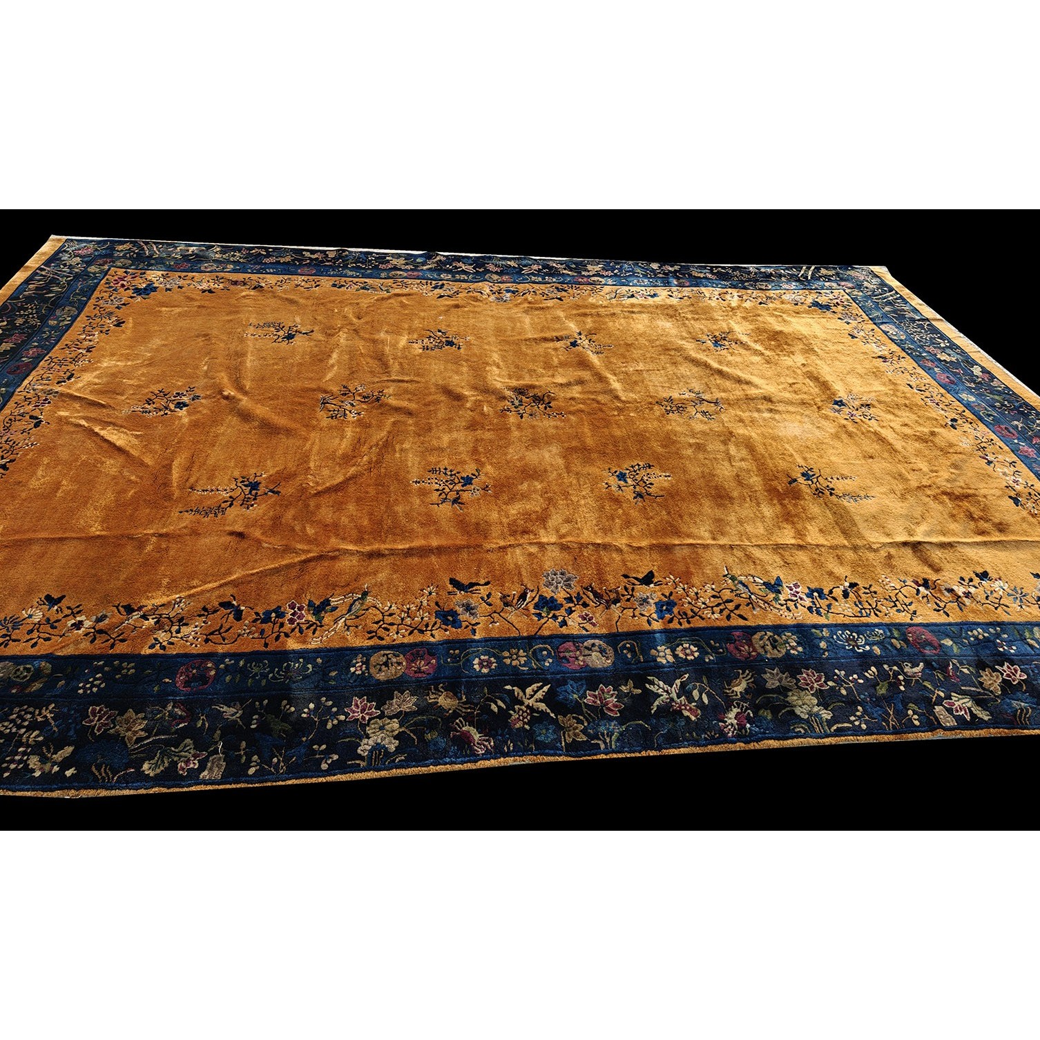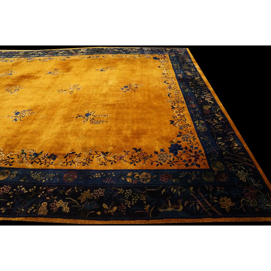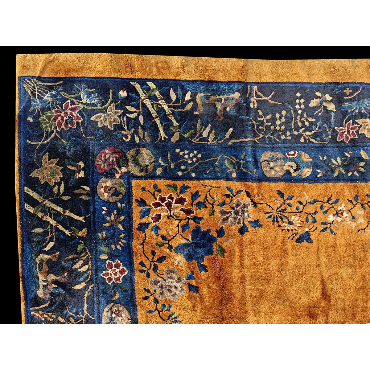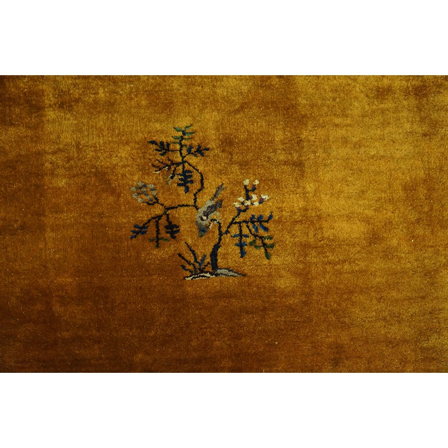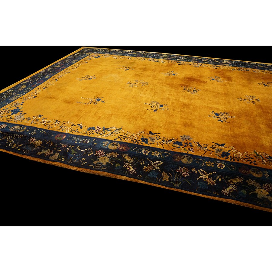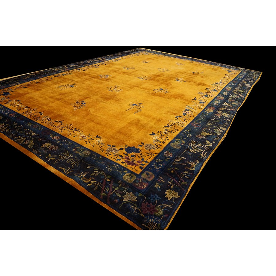 DescriptionChineseCarpets made in China proper. See entries Ningshia, Peking, Art Deco. Chinese - Art DecoAs the name implies, pieces woven between the wars for the Western market by mostly American owned firms especially Nichols and Fette, in thick heavy weaves using strong colors, asymmetric patterns and downplaying the Chinese-ness of the carpet. Nichols rugs are more strong toned than the pastel Fette. Most were woven in the coastal port city of Tientsin. Other lesser known workshops were also active. Some pieces are ultra-geometric and haute-Deco moderne in character: these are very rare. More frequent are pieces with bits of Chinese ornament: vases or other precious objects, paeonies, vines, fences, etc. Most common is the 9 x 12 size, in colors never found in mainstream Chinese rugs: backgrounds in black, mauve, purple, hot pink, orange, olive, employing the best synthetic chrome dyes of the period. Prices are still reasonable and carpets in top condition are available. | |