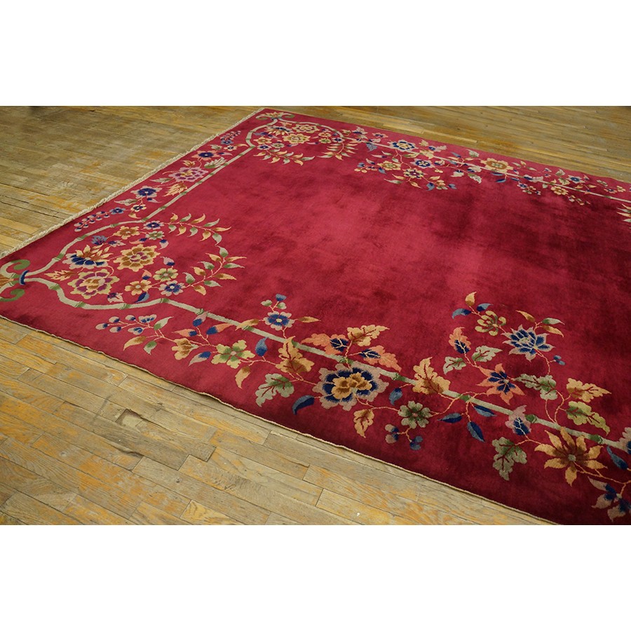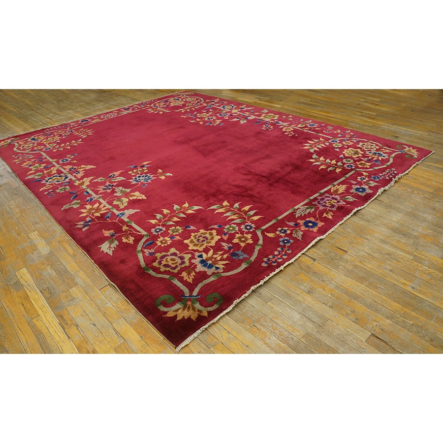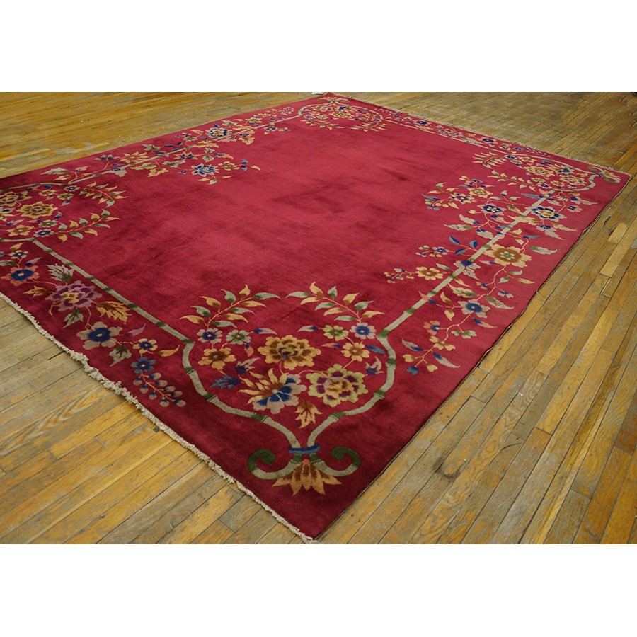 DescriptionChineseCarpets made in China proper. See entries Ningshia, Peking, Art Deco. Chinese - Art DecoAs the name implies, pieces woven between the wars for the Western market by mostly American owned firms especially Nichols and Fette, in thick heavy weaves using strong colors, asymmetric patterns and downplaying the Chinese-ness of the carpet. Nichols rugs are more strong toned than the pastel Fette. Most were woven in the coastal port city of Tientsin. Other lesser known workshops were also active. Some pieces are ultra-geometric and haute-Deco moderne in character: these are very rare. More frequent are pieces with bits of Chinese ornament: vases or other precious objects, paeonies, vines, fences, etc. Most common is the 9 x 12 size, in colors never found in mainstream Chinese rugs: backgrounds in black, mauve, purple, hot pink, orange, olive, employing the best synthetic chrome dyes of the period. Prices are still reasonable and carpets in top condition are available. | |