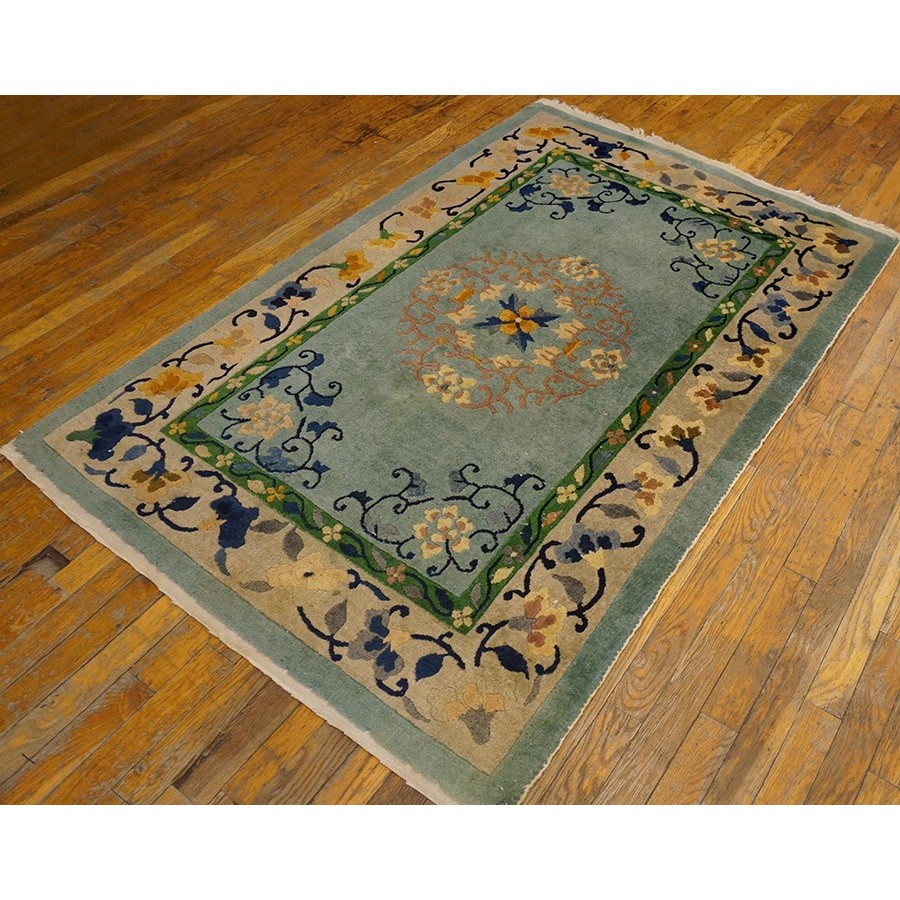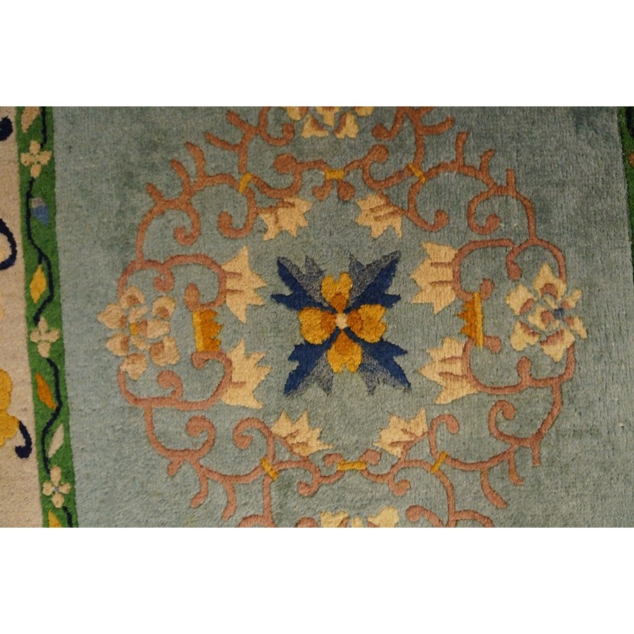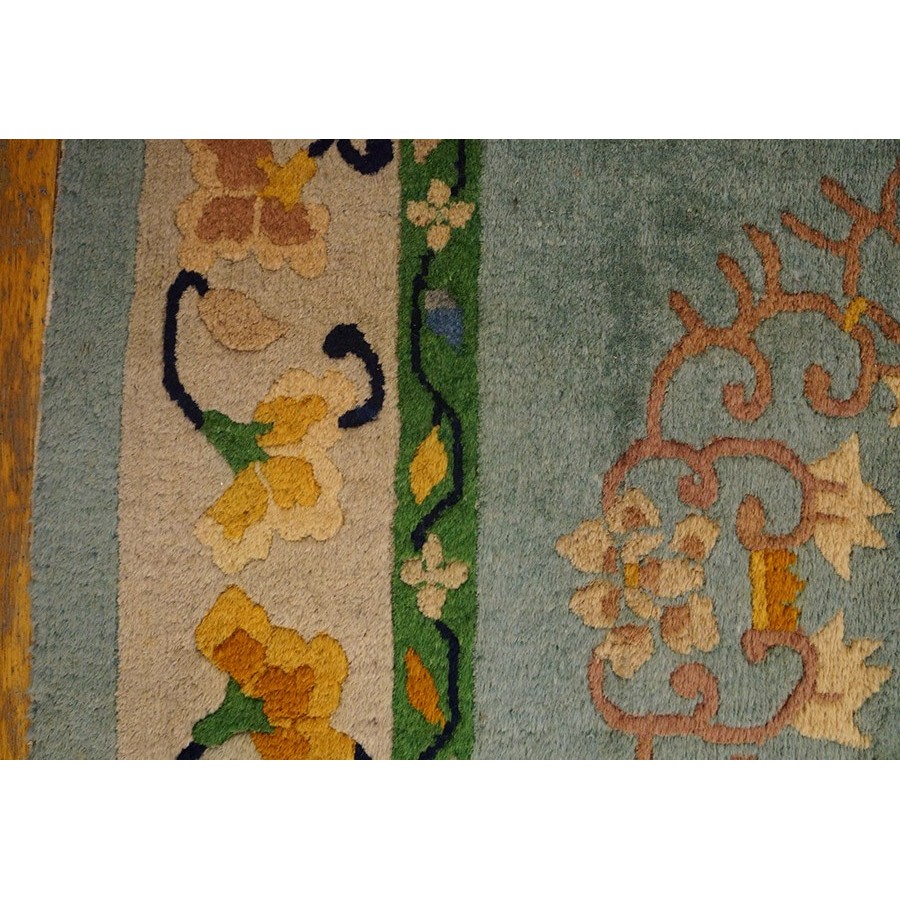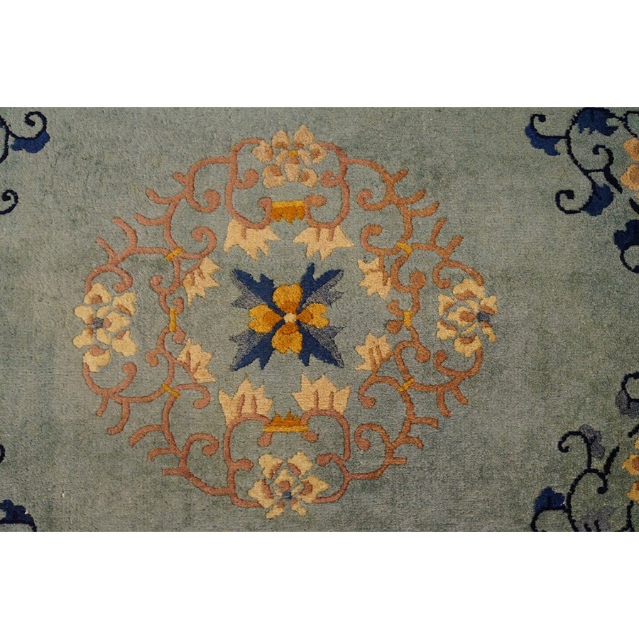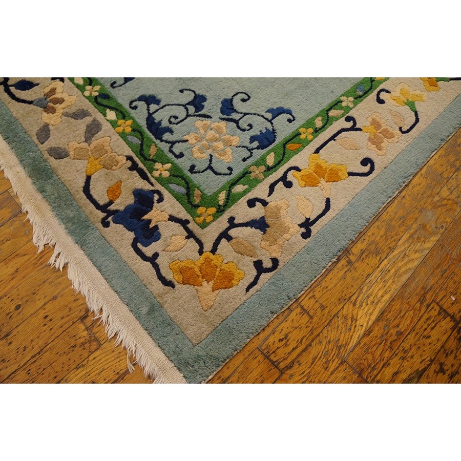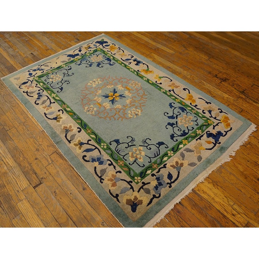 DescriptionChineseCarpets made in China proper. See entries Ningshia, Peking, Art Deco. Chinese - Art DecoAs the name implies, pieces woven between the wars for the Western market by mostly American owned firms especially Nichols and Fette, in thick heavy weaves using strong colors, asymmetric patterns and downplaying the Chinese-ness of the carpet. Nichols rugs are more strong toned than the pastel Fette. Most were woven in the coastal port city of Tientsin. Other lesser known workshops were also active. Some pieces are ultra-geometric and haute-Deco moderne in character: these are very rare. More frequent are pieces with bits of Chinese ornament: vases or other precious objects, paeonies, vines, fences, etc. Most common is the 9 x 12 size, in colors never found in mainstream Chinese rugs: backgrounds in black, mauve, purple, hot pink, orange, olive, employing the best synthetic chrome dyes of the period. Prices are still reasonable and carpets in top condition are available. | |