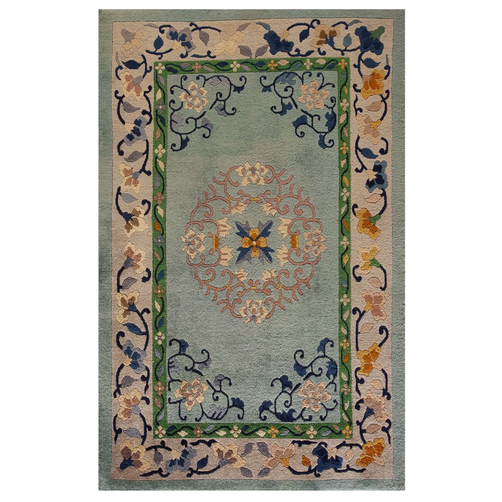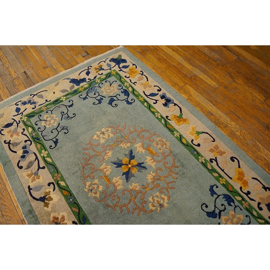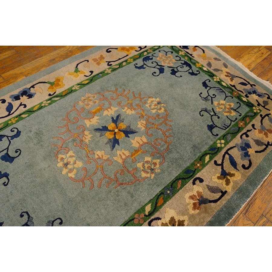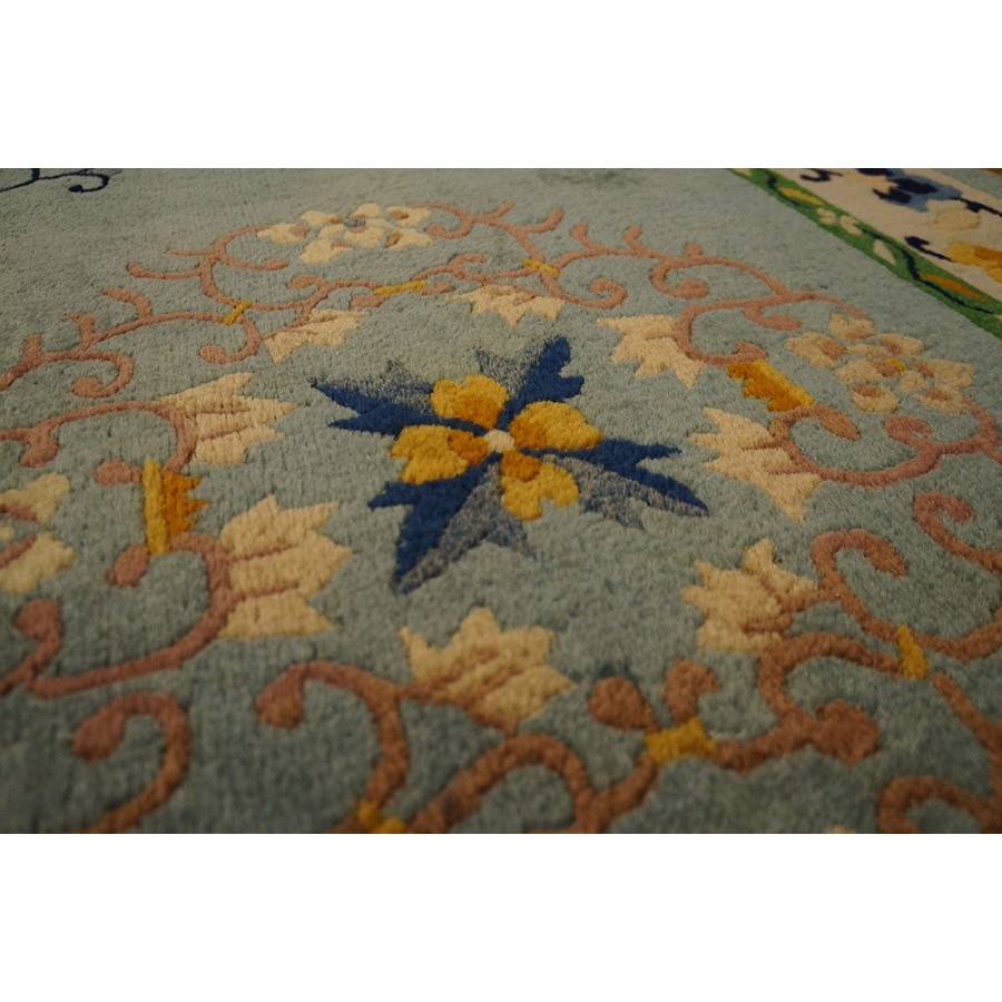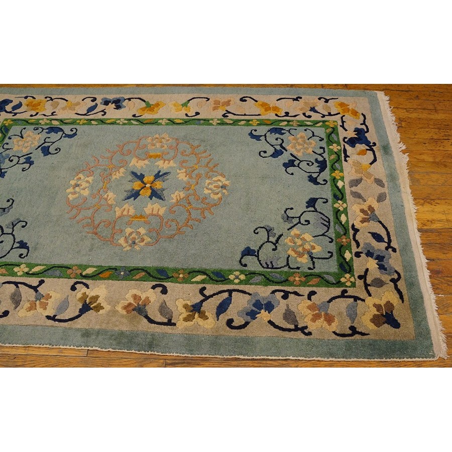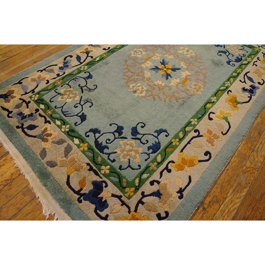 DescriptionChineseCarpets made in China proper. See entries Ningshia, Peking, Art Deco. Chinese - Art DecoAs the name implies, pieces woven between the wars for the Western market by mostly American owned firms especially Nichols and Fette, in thick heavy weaves using strong colors, asymmetric patterns and downplaying the Chinese-ness of the carpet. Nichols rugs are more strong toned than the pastel Fette. Most were woven in the coastal port city of Tientsin. Other lesser known workshops were also active. Some pieces are ultra-geometric and haute-Deco moderne in character: these are very rare. More frequent are pieces with bits of Chinese ornament: vases or other precious objects, paeonies, vines, fences, etc. Most common is the 9 x 12 size, in colors never found in mainstream Chinese rugs: backgrounds in black, mauve, purple, hot pink, orange, olive, employing the best synthetic chrome dyes of the period. Prices are still reasonable and carpets in top condition are available. | |