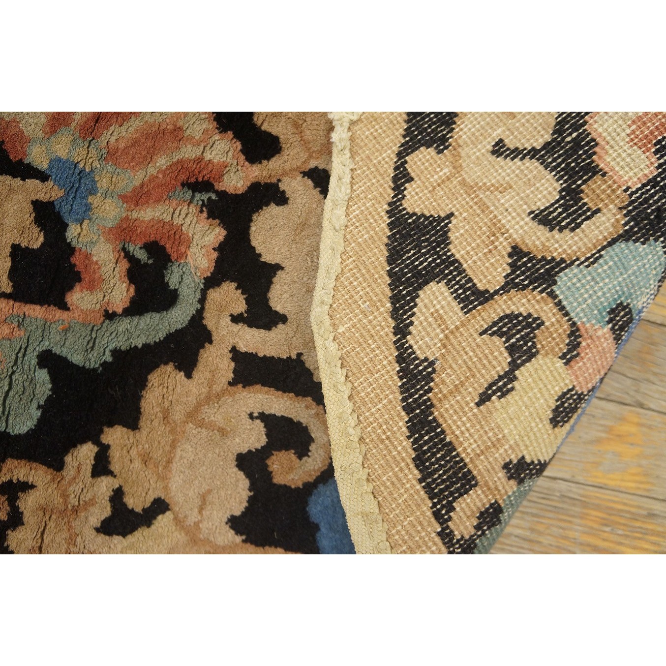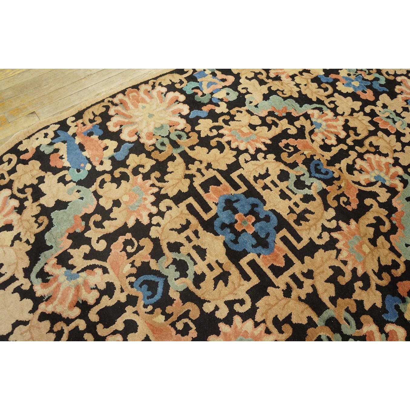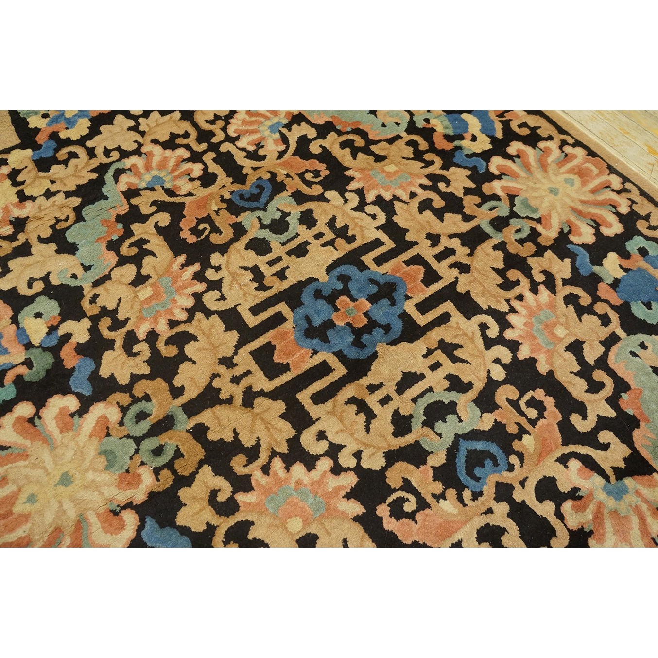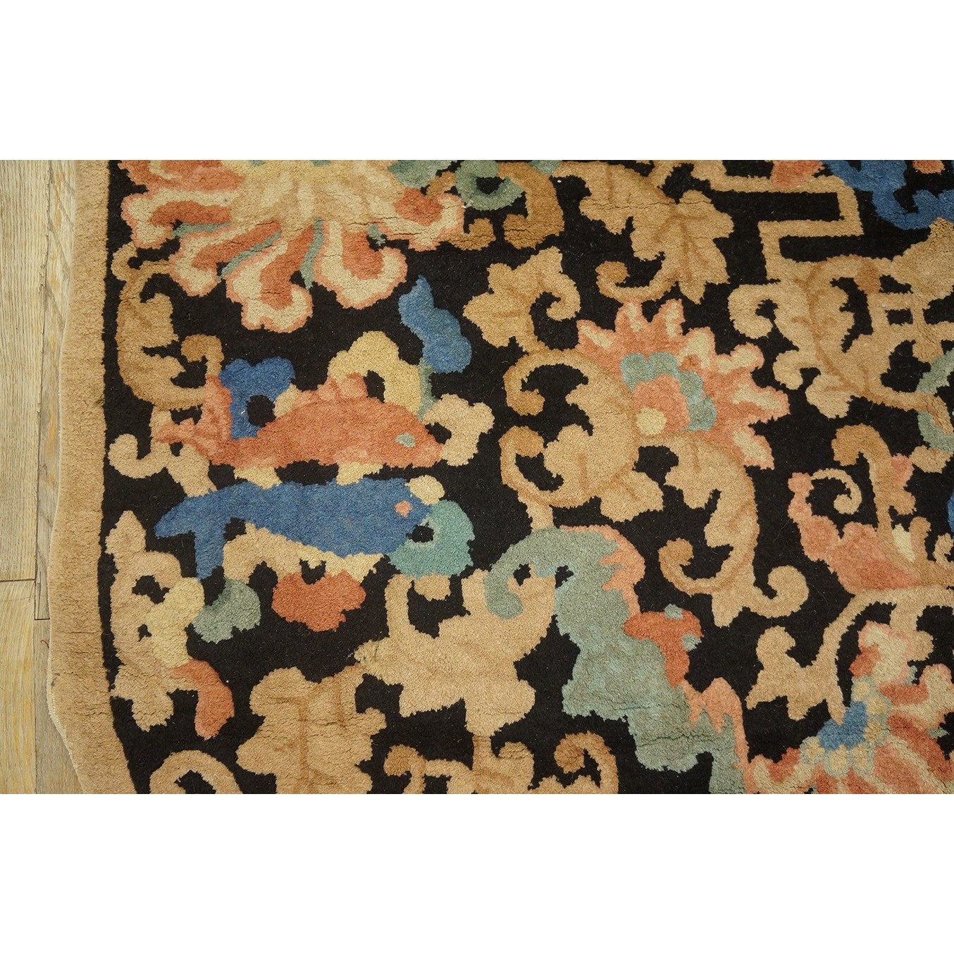 DescriptionChineseCarpets made in China proper. See entries Ningshia, Peking, Art Deco. Chinese - Art DecoAs the name implies, pieces woven between the wars for the Western market by mostly American owned firms especially Nichols and Fette, in thick heavy weaves using strong colors, asymmetric patterns and downplaying the Chinese-ness of the carpet. Nichols rugs are more strong toned than the pastel Fette. Most were woven in the coastal port city of Tientsin. Other lesser known workshops were also active. Some pieces are ultra-geometric and haute-Deco moderne in character: these are very rare. More frequent are pieces with bits of Chinese ornament: vases or other precious objects, paeonies, vines, fences, etc. Most common is the 9 x 12 size, in colors never found in mainstream Chinese rugs: backgrounds in black, mauve, purple, hot pink, orange, olive, employing the best synthetic chrome dyes of the period. Prices are still reasonable and carpets in top condition are available. | |