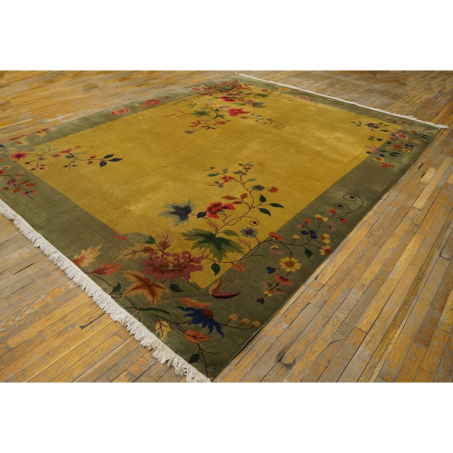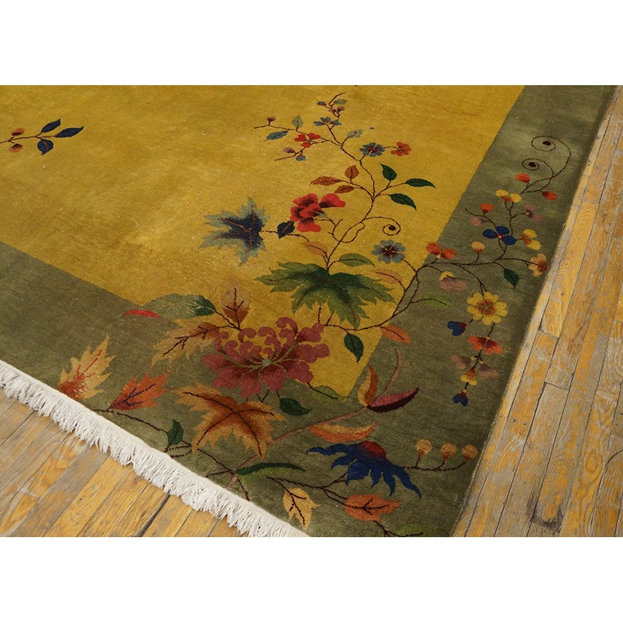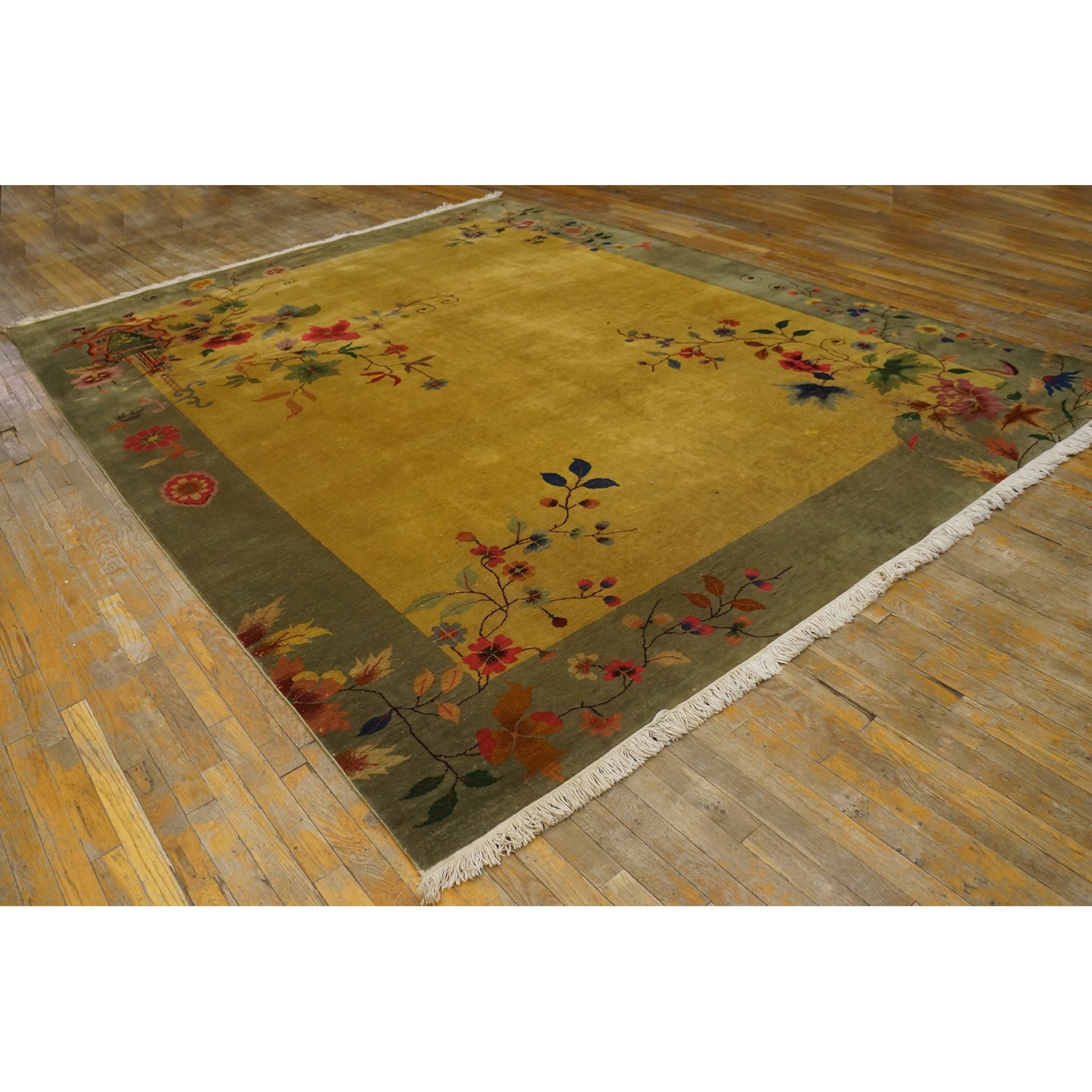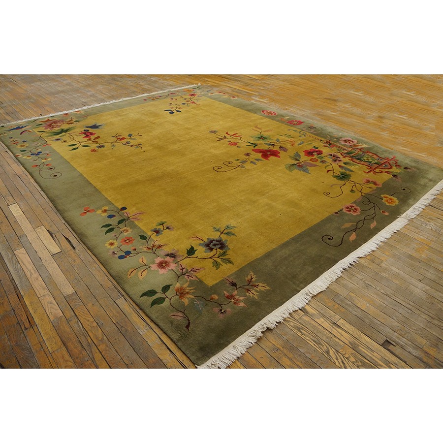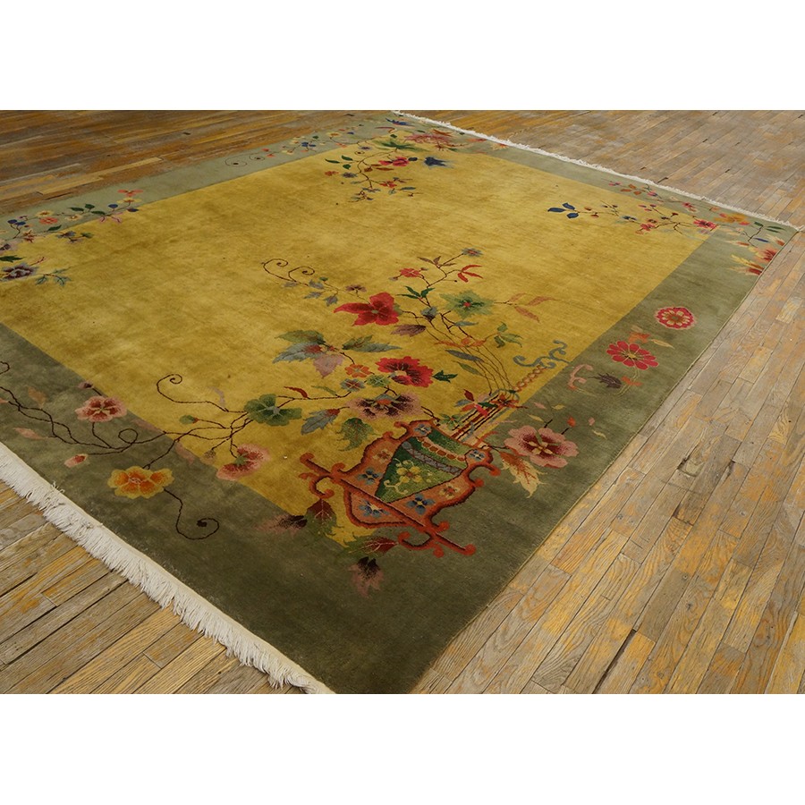 DescriptionChineseCarpets made in China proper. See entries Ningshia, Peking, Art Deco. Chinese - Art DecoAs the name implies, pieces woven between the wars for the Western market by mostly American owned firms especially Nichols and Fette, in thick heavy weaves using strong colors, asymmetric patterns and downplaying the Chinese-ness of the carpet. Nichols rugs are more strong toned than the pastel Fette. Most were woven in the coastal port city of Tientsin. Other lesser known workshops were also active. Some pieces are ultra-geometric and haute-Deco moderne in character: these are very rare. More frequent are pieces with bits of Chinese ornament: vases or other precious objects, paeonies, vines, fences, etc. Most common is the 9 x 12 size, in colors never found in mainstream Chinese rugs: backgrounds in black, mauve, purple, hot pink, orange, olive, employing the best synthetic chrome dyes of the period. Prices are still reasonable and carpets in top condition are available. | |