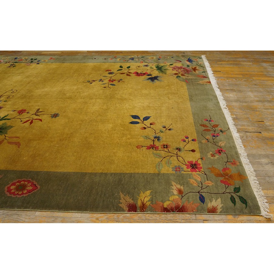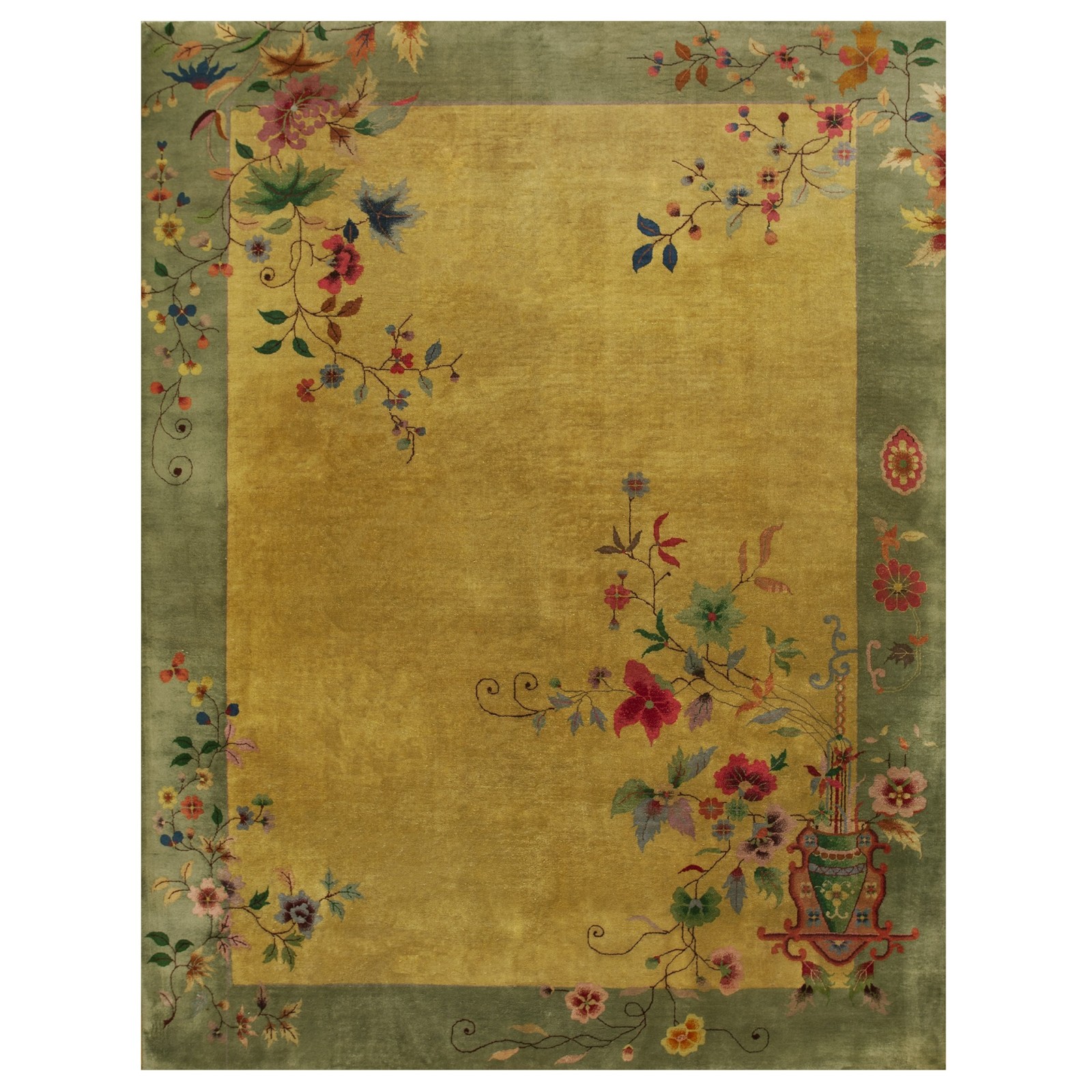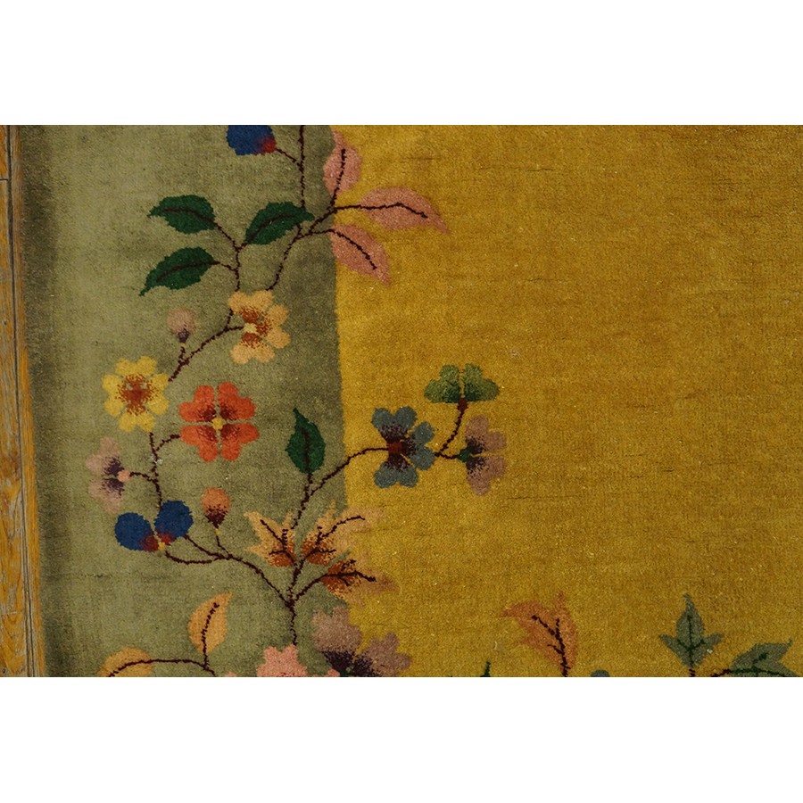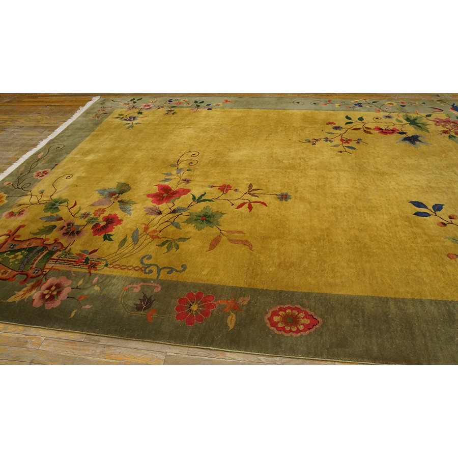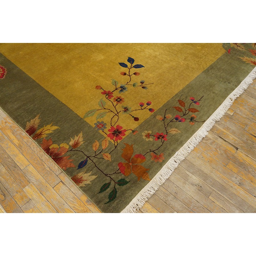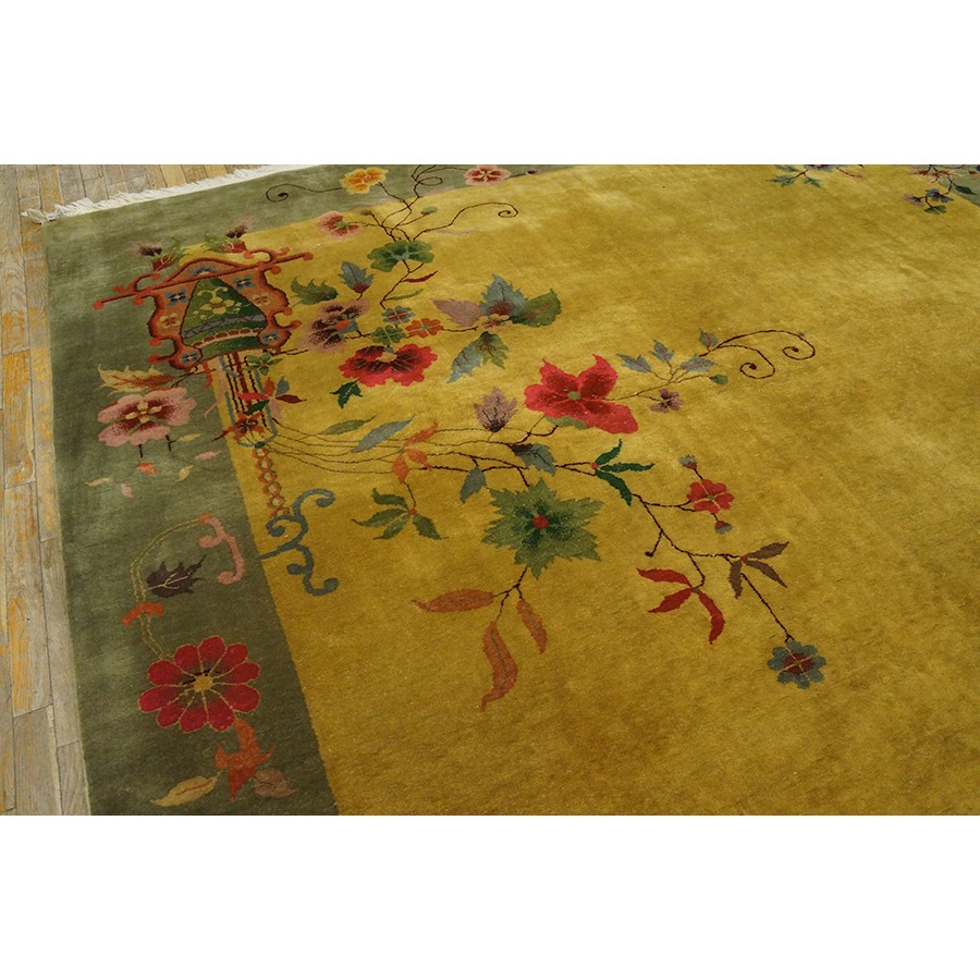 DescriptionChineseCarpets made in China proper. See entries Ningshia, Peking, Art Deco. Chinese - Art DecoAs the name implies, pieces woven between the wars for the Western market by mostly American owned firms especially Nichols and Fette, in thick heavy weaves using strong colors, asymmetric patterns and downplaying the Chinese-ness of the carpet. Nichols rugs are more strong toned than the pastel Fette. Most were woven in the coastal port city of Tientsin. Other lesser known workshops were also active. Some pieces are ultra-geometric and haute-Deco moderne in character: these are very rare. More frequent are pieces with bits of Chinese ornament: vases or other precious objects, paeonies, vines, fences, etc. Most common is the 9 x 12 size, in colors never found in mainstream Chinese rugs: backgrounds in black, mauve, purple, hot pink, orange, olive, employing the best synthetic chrome dyes of the period. Prices are still reasonable and carpets in top condition are available. | |