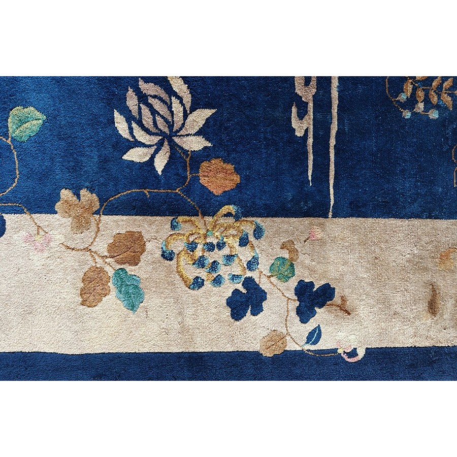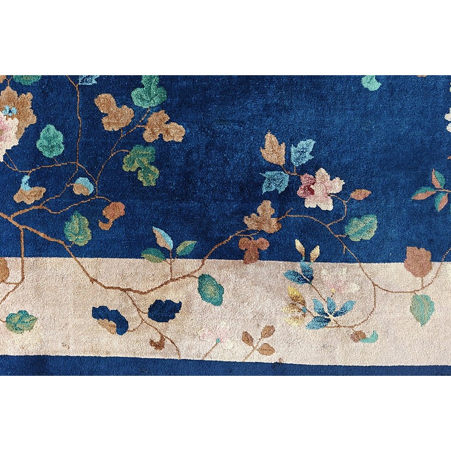 DescriptionChineseCarpets made in China proper. See entries Ningshia, Peking, Art Deco. Chinese - Art DecoAs the name implies, pieces woven between the wars for the Western market by mostly American owned firms especially Nichols and Fette, in thick heavy weaves using strong colors, asymmetric patterns and downplaying the Chinese-ness of the carpet. Nichols rugs are more strong toned than the pastel Fette. Most were woven in the coastal port city of Tientsin. Other lesser known workshops were also active. Some pieces are ultra-geometric and haute-Deco moderne in character: these are very rare. More frequent are pieces with bits of Chinese ornament: vases or other precious objects, paeonies, vines, fences, etc. Most common is the 9 x 12 size, in colors never found in mainstream Chinese rugs: backgrounds in black, mauve, purple, hot pink, orange, olive, employing the best synthetic chrome dyes of the period. Prices are still reasonable and carpets in top condition are available. | |