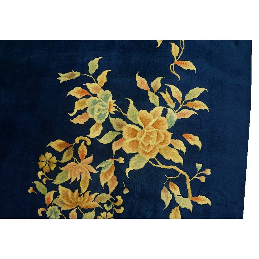 DescriptionChineseCarpets made in China proper. See entries Ningshia, Peking, Art Deco. Chinese - Art DecoAs the name implies, pieces woven between the wars for the Western market by mostly American owned firms especially Nichols and Fette, in thick heavy weaves using strong colors, asymmetric patterns and downplaying the Chinese-ness of the carpet. Nichols rugs are more strong toned than the pastel Fette. Most were woven in the coastal port city of Tientsin. Other lesser known workshops were also active. Some pieces are ultra-geometric and haute-Deco moderne in character: these are very rare. More frequent are pieces with bits of Chinese ornament: vases or other precious objects, paeonies, vines, fences, etc. Most common is the 9 x 12 size, in colors never found in mainstream Chinese rugs: backgrounds in black, mauve, purple, hot pink, orange, olive, employing the best synthetic chrome dyes of the period. Prices are still reasonable and carpets in top condition are available. | |
