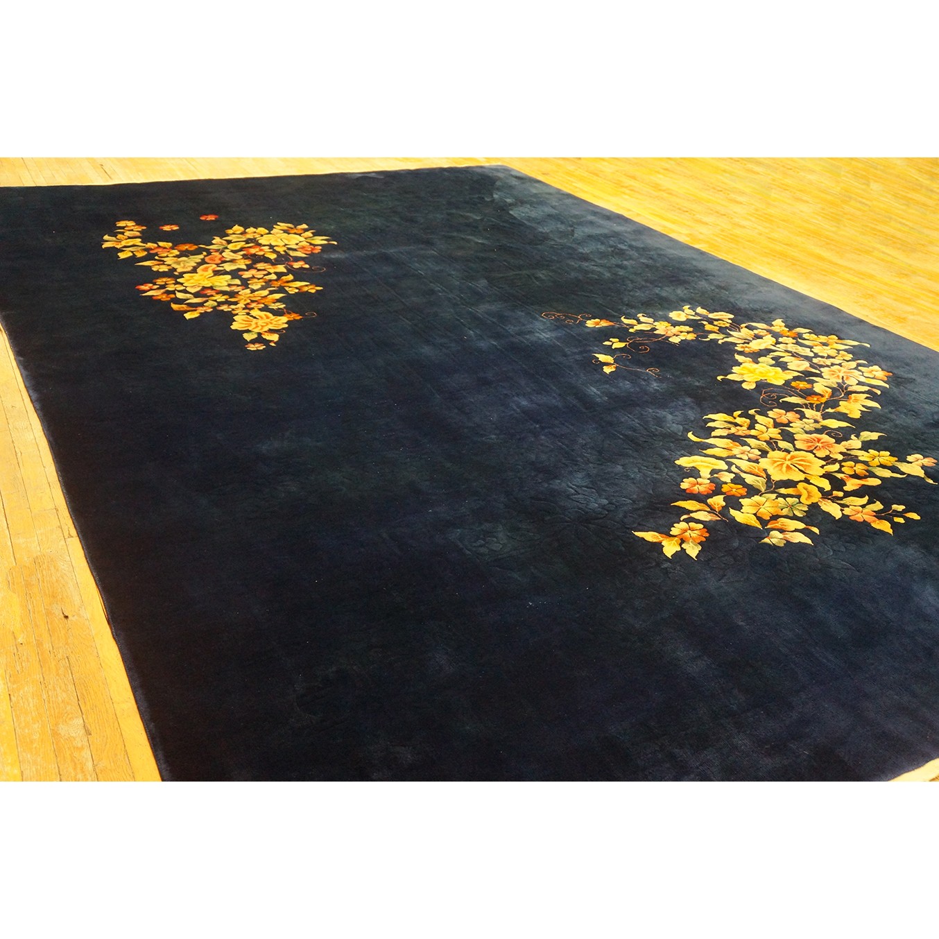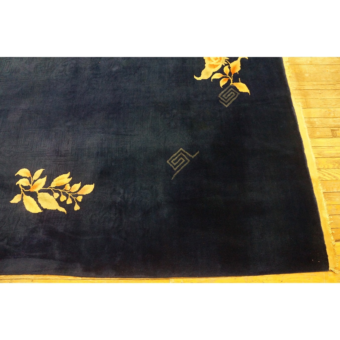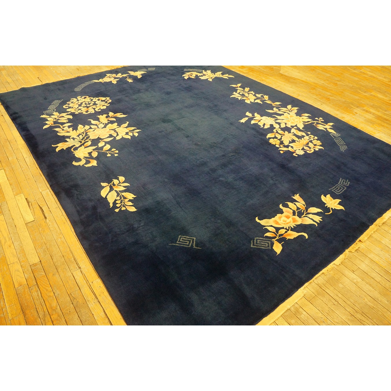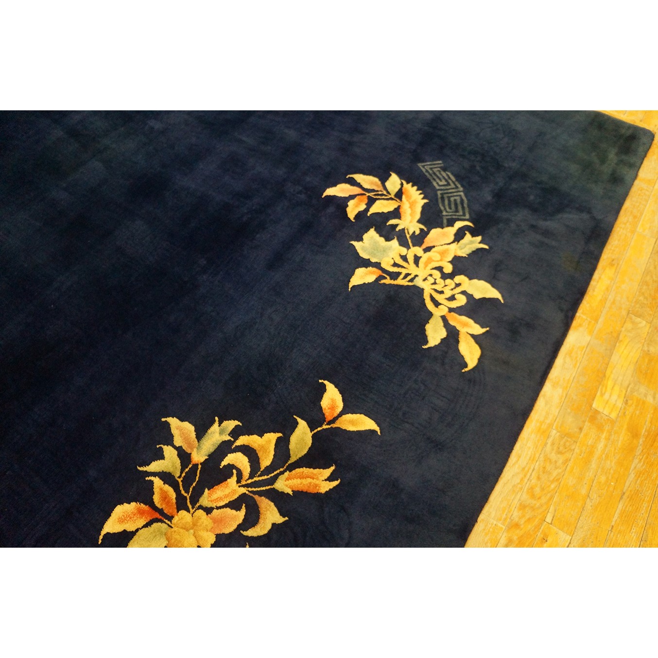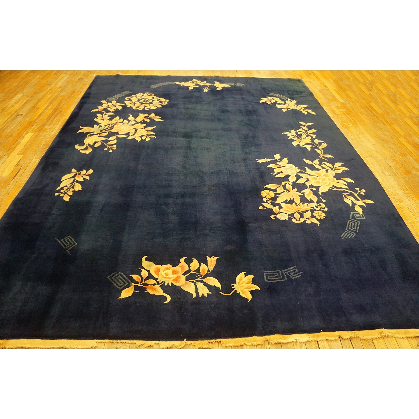 DescriptionChineseCarpets made in China proper. See entries Ningshia, Peking, Art Deco. Chinese - Art DecoAs the name implies, pieces woven between the wars for the Western market by mostly American owned firms especially Nichols and Fette, in thick heavy weaves using strong colors, asymmetric patterns and downplaying the Chinese-ness of the carpet. Nichols rugs are more strong toned than the pastel Fette. Most were woven in the coastal port city of Tientsin. Other lesser known workshops were also active. Some pieces are ultra-geometric and haute-Deco moderne in character: these are very rare. More frequent are pieces with bits of Chinese ornament: vases or other precious objects, paeonies, vines, fences, etc. Most common is the 9 x 12 size, in colors never found in mainstream Chinese rugs: backgrounds in black, mauve, purple, hot pink, orange, olive, employing the best synthetic chrome dyes of the period. Prices are still reasonable and carpets in top condition are available. | |
