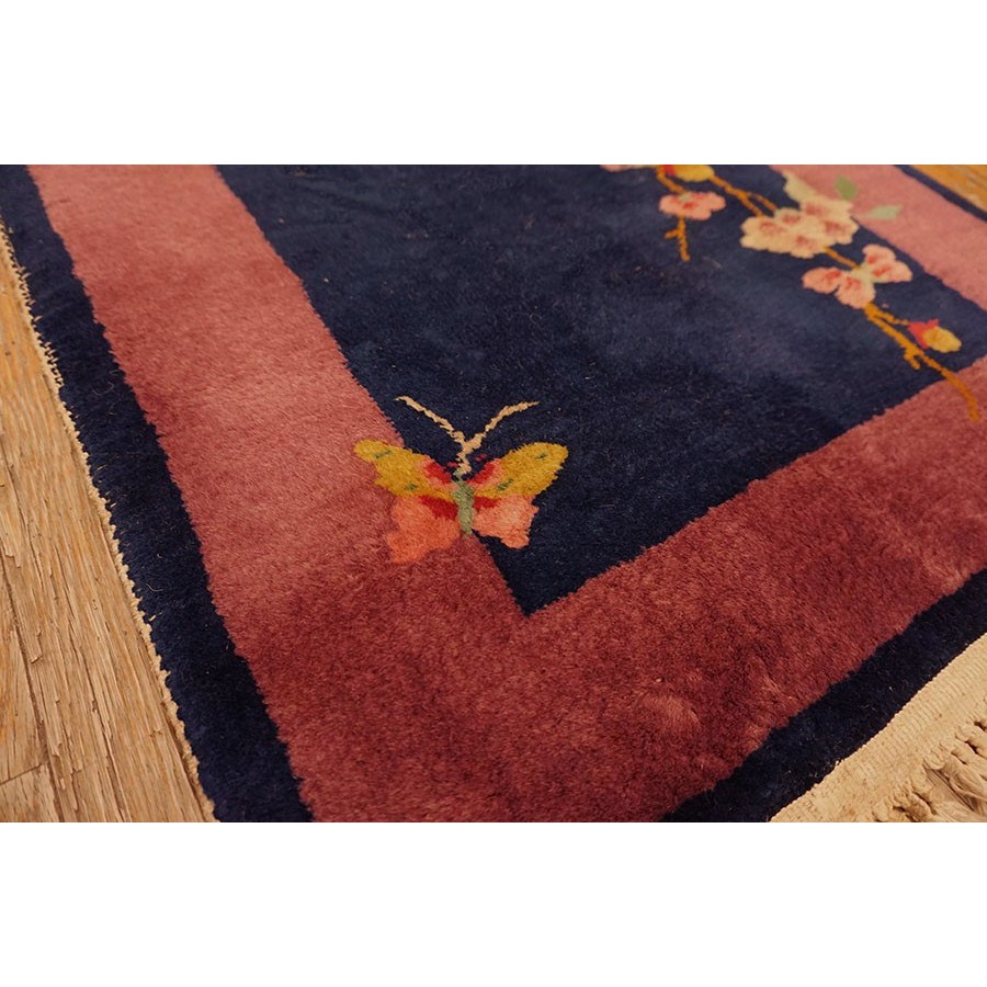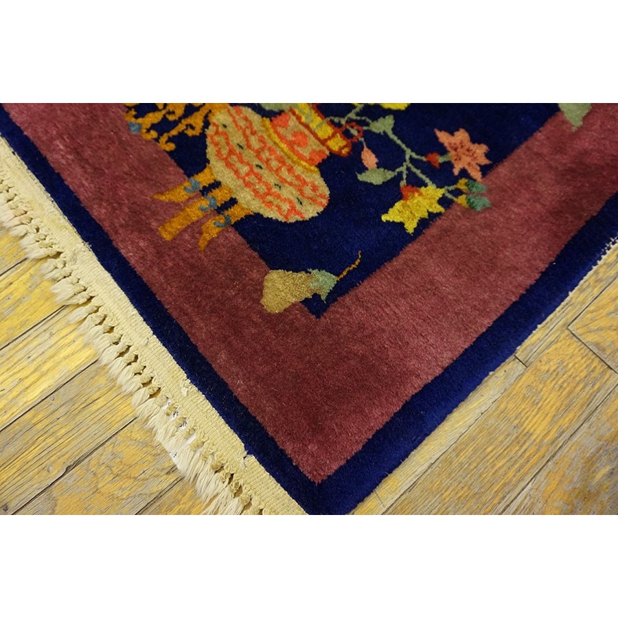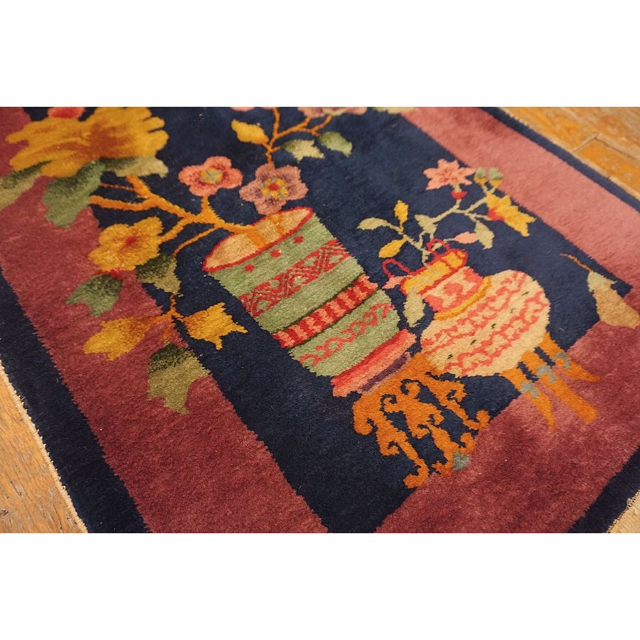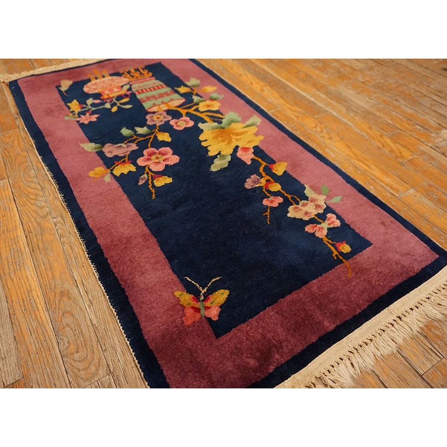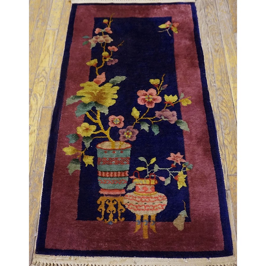 DescriptionChineseCarpets made in China proper. See entries Ningshia, Peking, Art Deco. Chinese - Art DecoAs the name implies, pieces woven between the wars for the Western market by mostly American owned firms especially Nichols and Fette, in thick heavy weaves using strong colors, asymmetric patterns and downplaying the Chinese-ness of the carpet. Nichols rugs are more strong toned than the pastel Fette. Most were woven in the coastal port city of Tientsin. Other lesser known workshops were also active. Some pieces are ultra-geometric and haute-Deco moderne in character: these are very rare. More frequent are pieces with bits of Chinese ornament: vases or other precious objects, paeonies, vines, fences, etc. Most common is the 9 x 12 size, in colors never found in mainstream Chinese rugs: backgrounds in black, mauve, purple, hot pink, orange, olive, employing the best synthetic chrome dyes of the period. Prices are still reasonable and carpets in top condition are available. | |