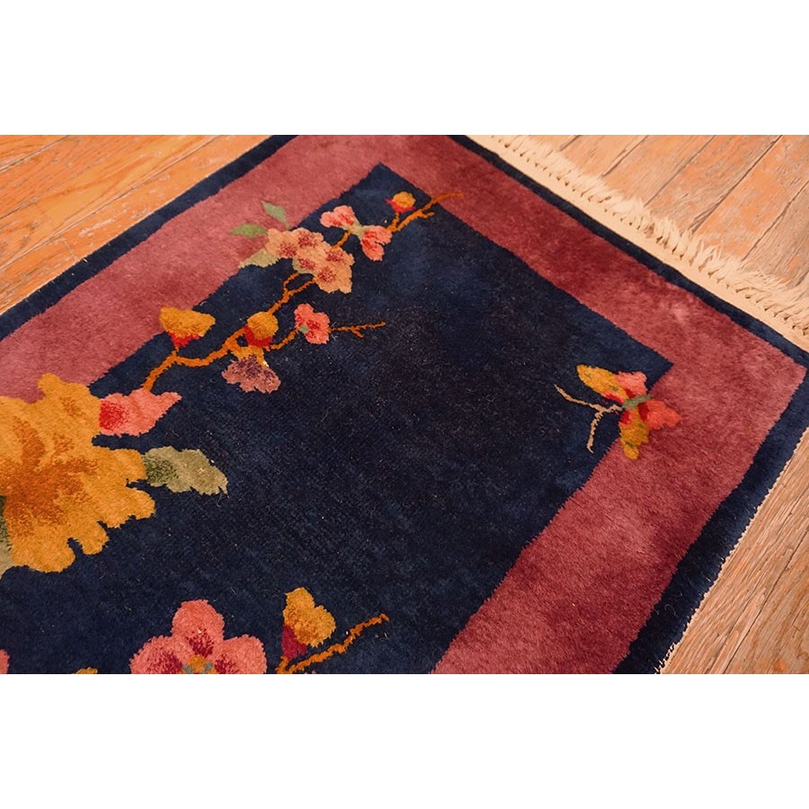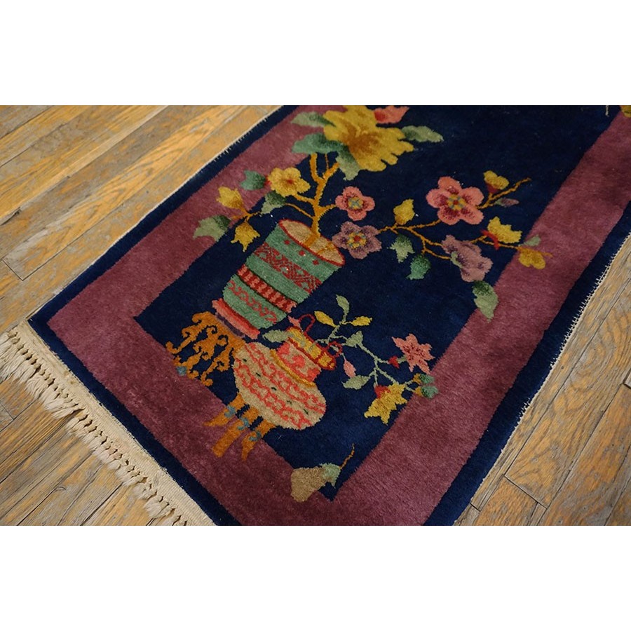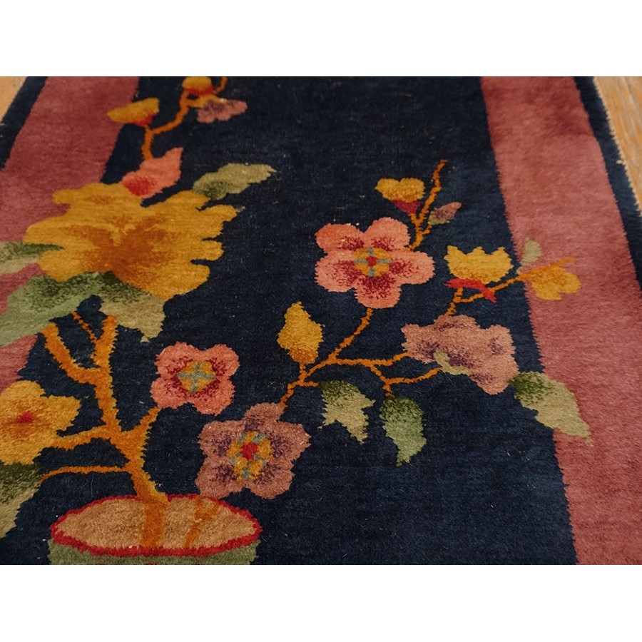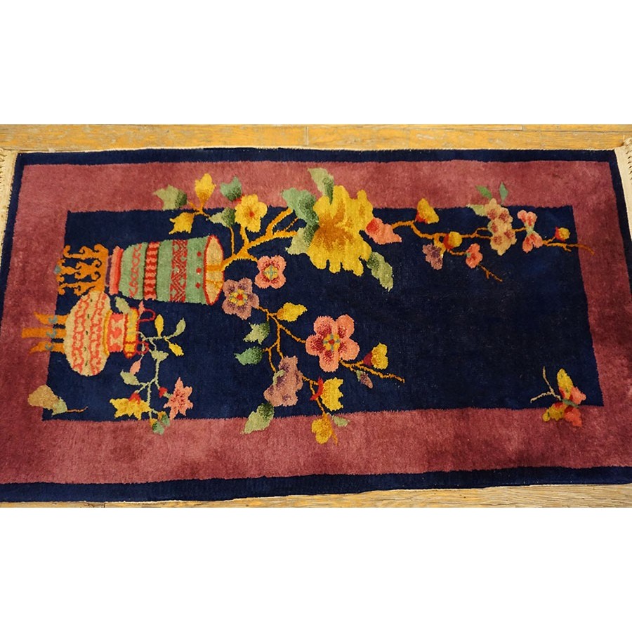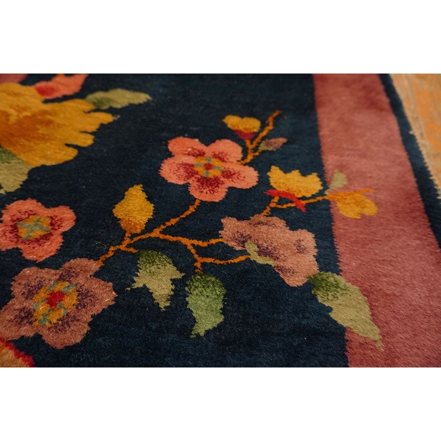 DescriptionChineseCarpets made in China proper. See entries Ningshia, Peking, Art Deco. Chinese - Art DecoAs the name implies, pieces woven between the wars for the Western market by mostly American owned firms especially Nichols and Fette, in thick heavy weaves using strong colors, asymmetric patterns and downplaying the Chinese-ness of the carpet. Nichols rugs are more strong toned than the pastel Fette. Most were woven in the coastal port city of Tientsin. Other lesser known workshops were also active. Some pieces are ultra-geometric and haute-Deco moderne in character: these are very rare. More frequent are pieces with bits of Chinese ornament: vases or other precious objects, paeonies, vines, fences, etc. Most common is the 9 x 12 size, in colors never found in mainstream Chinese rugs: backgrounds in black, mauve, purple, hot pink, orange, olive, employing the best synthetic chrome dyes of the period. Prices are still reasonable and carpets in top condition are available. | |