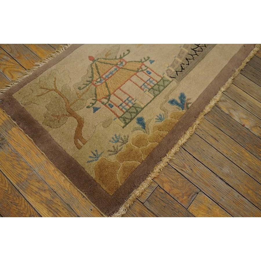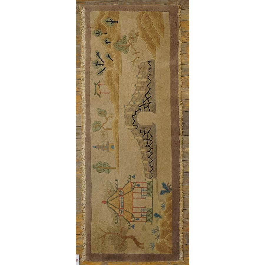 DescriptionChineseCarpets made in China proper. See entries Ningshia, Peking, Art Deco. Chinese - Art DecoAs the name implies, pieces woven between the wars for the Western market by mostly American owned firms especially Nichols and Fette, in thick heavy weaves using strong colors, asymmetric patterns and downplaying the Chinese-ness of the carpet. Nichols rugs are more strong toned than the pastel Fette. Most were woven in the coastal port city of Tientsin. Other lesser known workshops were also active. Some pieces are ultra-geometric and haute-Deco moderne in character: these are very rare. More frequent are pieces with bits of Chinese ornament: vases or other precious objects, paeonies, vines, fences, etc. Most common is the 9 x 12 size, in colors never found in mainstream Chinese rugs: backgrounds in black, mauve, purple, hot pink, orange, olive, employing the best synthetic chrome dyes of the period. Prices are still reasonable and carpets in top condition are available. | |